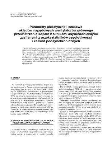 dr inż. ANDRZEJ DZIKOWSKI Instytut Technik Innowacyjnych EMAG Parametry elektryczne i czasowe układów napędowych wentylatorów głównego przewietrzania kopalń z silnikami asynchronicznymi zasilanymi z przekształtników częstotliwości i kaskad podsynchronicznych Artykuł prezentuje parametry elektryczne i zależności czasowe występujące podczas rozruchu wentylatorów głównego przewietrzania kopalń z silnikami asynchronicznymi zasilanymi z przekształtników częstotliwości i kaskad podsynchronicznych. W artykule przedstawiono wyniki symulacji komputerowych różnych układów zasilania wentylatora promieniowego typu WPK-5,0 napędzanego silnikiem asynchronicznym o mocy 2500 kW. Wyniki symulacji porównano zwracając uwagę na występujące zależności czasowe i parametry elektryczne w symulowanych układach napędowych. 1. WSTĘP W układach głównego przewietrzania kopalń węgla kamiennego w Polsce są stosowane najczęściej wentylatory typu WPK-3,3, WPK-3,9, WPK-5,0 [1]. Są to wentylatory promieniowe z jednostronnie ssącym wirnikiem. Prosta konstrukcja wentylatorów WPK nie stwarza trudności montażowych oraz zapewnia długotrwałą bezawaryjną eksploatację sięgającą 60000 h. Konstrukcja wentylatora zapewnia cichobieżność oraz wysoką sprawność i szeroki zakres ekonomicznej pracy. Do napędu tych wentylatorów są stosowane silniki o mocach od 600 do 2500 kW. W niniejszej pracy przeanalizowano rozruch wentylatora typu WPK-5,0 napędzanego silnikiem o mocy 2500 kW. 2. ROZRUCH WENTYLATORA ZA POMOCĄ PRZEKSZTAŁTNIKA CZĘSTOTLIWOŚCI Zasilanie silnika napędowego wentylatora poprzez przekształtnik częstotliwości ma bardzo ważną zaletę, a mianowicie w czasie rozruchu można znacznie ograniczyć prąd rozruchowy, który nierzadko podczas rozruchu bezpośredniego z sieci przekracza ponad 5-krotnie prąd znamionowy silnika. Dla przykładu poniżej porównano rozruch bezpośredni wentylatora WPK-5,0 [1] napędzanego silnikiem o mocy 2500 kW typu SAUe-1716s produkcji DOLMEL [2] z rozruchem za pomocą przekształtnika częstotliwości przy najprostszym sposobie sterowania skalarnego U/f [3,4,5]. Włączenie bezpośrednie silnika napędowego do sieci zasilającej 6 kV powoduje przepływ prądu rozruchowego przekraczającego 5-krotnie wartość prądu znamionowego (IN = 294A) przez czas około 30 sekund, co przedstawia rys. 1. Na rys. 1 został przedstawiony przebieg wartości skutecznej prądu [A] oraz prędkość obrotowa [obr./min.] w czasie rozruchu silnika 2500 kW obciążonego wentylatorem WPK-5,0 podczas bezpośredniego włączenia do sieci zasilającej 6 kV. Całkowity czas rozruchu do prędkości znamionowej 370 obr./min trwa ponad 33 sekund. Symulacje komputerowe zostały przeprowadzone za pomocą programu PSIM v.7.1 firmy Powersim Inc. będącego symulatorem układów energoelektronicznych [6]. Nr 11(465) LISTOPAD 2009 39 Rys. 1. Prąd rozruchowy i prędkość obrotowa silnika 2500 kW przy rozruchu bezpośrednim z sieci Rys. 2. Prąd rozruchowy i prędkość obrotowa silnika 2500 kW zasilanego z przekształtnika U/f = const. Rys. 3. Moment elektromagnetyczny silnika 2500 kW zasilanego z przekształtnika U/f = const. Dla porównania na rys. 2 został przedstawiony przebieg wartości skutecznej prądu [A] oraz prędkość obrotowa [obr./min] w czasie rozruchu takiego samego układu silnik-wentylator, przy zasilaniu z przekształtnika częstotliwości wytwarzającego napięcie 3-fazowe o liniowo narastającej częstotliwości i zachowaniu stałego stosunku wartości napięcia do częstotliwości (U/f = const.). Jak widać na rys. 2 wartość prądu rozruchowego spadła prawie dwukrotnie i znacząco skrócił się czas rozruchu, który przy rozruchu z przekształtnika wynosi poniżej 10 sekund, a więc przeszło 3-krotnie mniej niż przy rozruchu bezpośrednim z sieci. Czas rozruchu uległ tak dużemu skróceniu na skutek dużego momentu rozruchowego rozwijanego przez silnik sterowany częstotliwościowo z przekształtnika. Na rys. 3 jest przedstawiony przebieg momentu elektromagnetycznego [Nm] w czasie rozruchu układu silnik-wentylator zasilanego z przekształtnika częstotliwości przy U/f = const. MECHANIZACJA I AUTOMATYZACJA GÓRNICTWA 40 Rys. 4. Moment elektromagnetyczny silnika 2500 kW przy rozruchu bezpośrednim z sieci Rys. 5. Przebieg współczynnika mocy cos przy rozruchu bezpośrednim z sieci Jak widać na rys. 3 moment elektromagnetyczny silnika przez cały czas rozruchu utrzymuje się powyżej 200% wartości momentu znamionowego (MN = 67,8 kN), co powoduje znaczne skrócenie czasu rozruchu. Dla porównania na rys. 4 jest przedstawiony moment elektromagnetyczny silnika [Nm] przy rozruchu bezpośrednim z sieci. Jak widać na rys.4 moment rozruchowy przez 80% czasu rozruchu jest poniżej wartości momentu znamionowego silnika (MN = 67,8 kN), a w początkowej fazie rozruchu dodatkowo występują silne oscylacje momentu. Niska wartość momentu rozruchowego przy zasilaniu bezpośrednim z sieci wynika z dużej częstotliwości napięcia indukowanego w wirniku silnika napędowego, w początkowej fazie rozruchu około 50 Hz, co powoduje duży spadek napięcia na reaktancji rozproszenia wirnika, a tym samym niski współczynnik mocy. Przebieg współczynnika mocy w czasie rozruchu bezpośredniego z sieci przedstawia rys. 5. Jak widać na rys. 5 wartość współczynnika mocy przez prawie 80% czasu rozruchu utrzymuje się poniżej wartości cos =0,2. Taka niska wartość współ- czynnika mocy charakteryzuje rozruch bezpośredni z sieci dużym zapotrzebowaniem na moc bierną, co wiąże się bezpośrednio z koniecznością dysponowania przez układ zasilania dużą mocą pozorną. Na rys. 6 są przedstawione przebiegi mocy czynnej [W] i pozornej [VA] podczas rozruchu układu silnikwentylator. Jak widać na rys. 6 wymaganie układu silnikwentylator na moc pozorną układu zasilania przekracza 5-krotnie moc znamionową zasilanego silnika (SN = 3,055 M