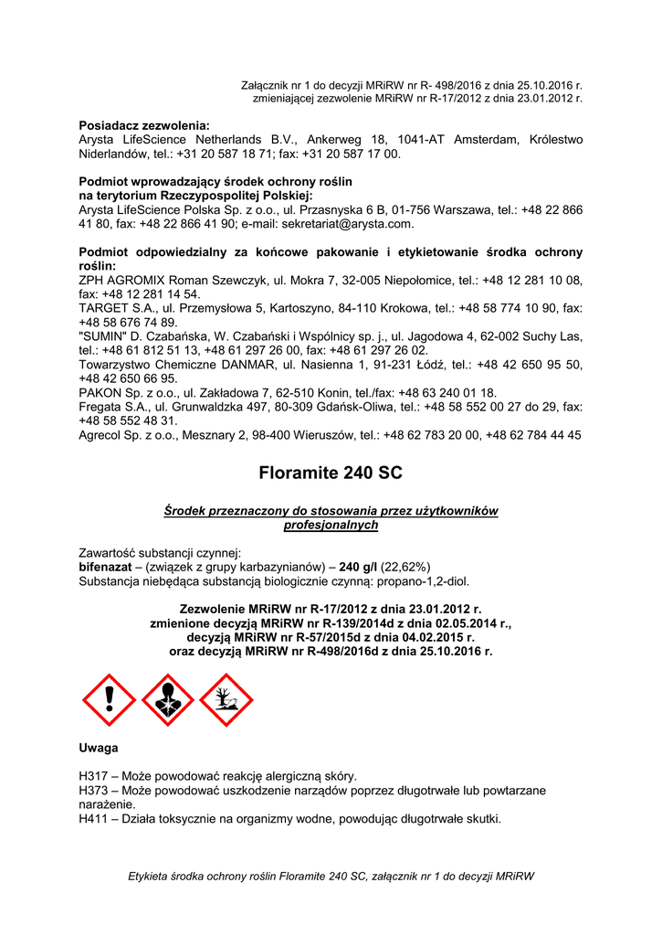 Załącznik nr 1 do decyzji MRiRW nr R- 498/2016 z dnia 25.10.2016 r. zmieniającej zezwolenie MRiRW nr R-17/2012 z dnia 23.01.2012 r. Posiadacz zezwolenia: Arysta LifeScience Netherlands B.V., Ankerweg 18, 1041-AT Amsterdam, Królestwo Niderlandów, tel.: +31 20 587 18 71; fax: +31 20 587 17 00. Podmiot wprowadzający środek ochrony roślin na terytorium Rzeczypospolitej Polskiej: Arysta LifeScience Polska Sp. z o.o., ul. Przasnyska 6 B, 01-756 Warszawa, tel.: +48 22 866 41 80, fax: +48 22 866 41 90; e-mail: [email protected]. Podmiot odpowiedzialny za końcowe pakowanie i etykietowanie środka ochrony roślin: ZPH AGROMIX Roman Szewczyk, ul. Mokra 7, 32-005 Niepołomice, tel.: +48 12 281 10 08, fax: +48 12 281 14 54. TARGET S.A., ul. Przemysłowa 5, Kartoszyno, 84-110 Krokowa, tel.: +48 58 774 10 90, fax: +48 58 676 74 89. "SUMIN" D. Czabańska, W. Czabański i Wspólnicy sp. j., ul. Jagodowa 4, 62-002 Suchy Las, tel.: +48 61 812 51 13, +48 61 297 26 00, fax: +48 61 297 26 02. Towarzystwo Chemiczne DANMAR, ul. Nasienna 1, 91-231 Łódź, tel.: +48 42 650 95 50, +48 42 650 66 95. PAKON Sp. z o.o., ul. Zakładowa 7, 62-510 Konin, tel./fax: +48 63 240 01 18. Fregata S.A., ul. Grunwaldzka 497, 80-309 Gdańsk-Oliwa, tel.: +48 58 552 00 27 do 29, fax: +48 58 552 48 31. Agrecol Sp. z o.o., Mesznary 2, 98-400 Wieruszów, tel.: +48 62 783 20 00, +48 62 784 44 45 Floramite 240 SC Środek przeznaczony do stosowania przez użytkowników profesjonalnych Zawartość substancji czynnej: bifenazat – (związek z grupy karbazynianów) – 240 g/l (22,62%) Substancja niebędąca substancją biologicznie czynną: propano-1,2-diol. Zezwolenie MRiRW nr R-17/2012 z dnia 23.01.2012 r. zmienione decyzją MRiRW nr R-139/2014d z dnia 02.05.2014 r., decyzją MRiRW nr R-57/2015d z dnia 04.02.2015 r. oraz decyzją MRiRW nr R-498/2016d z dnia 25.10.2016 r. Uwaga H317 – Może powodować reakcję alergiczną skóry. H373 – Może powodować uszkodzenie narządów poprzez długotrwałe lub powtarzane narażenie. H411 – Działa toksycznie na organizmy wodne, powodując długotrwałe skutki. Etykieta środka ochrony roślin Floramite 240 SC, załącznik nr 1 do decyzji MRiRW EUH 208 - Zawiera: 1,2 –benzisothiazol-3(2H)- one. Może powodować wystąpienie reakcji alergicznej. EUH 401 – W celu uniknięcia zagrożeń dla zdrowia ludzi i środowiska, należy postępować zgodnie z instrukcją użycia. P260 – Nie wdychać pyłu/dymu/gazu/mgły/par/rozpylonej cieczy. P280 – Stosować rękawice ochronne. P302+P352 - W przypadku kontaktu ze skórą: umyć dużą ilością wody z mydłem. P333 + P313 – W przypadku wystąpienia podrażnienia skóry lub wysypki: Zasięgnąć porady/ zgłosić się pod opiekę lekarza. P363 – Wyprać zanieczyszczoną odzież przed ponownym użyciem. P 391 – Zebrać wyciek. OPIS DZIAŁANIA Środek przędziorkobójczy w formie koncentratu stężonej zawiesiny do rozcieńczania wodą, o działaniu kontaktowym, przeznaczony do zwalczania przędziorka chmielowca w uprawianych w gruncie i pod osłonami ogórkach i truskawkach, w uprawianych pod osłonami pomidorach, oberżynie, papryce, różach i chryzantemach, oraz w uprawianych w gruncie szkółkach roślin ozdobnych. Na roślinie działa powierzchniowo. Zgodnie z klasyfikacją IRAC substancja czynna bifenazat zaliczana jest do grupy 20. Środek przeznaczony do stosowania przy użyciu samobieżnych lub ciągnikowych opryskiwaczy polowych i opryskiwaczy ręcznych. STOSOWANIE ŚRODKA ROŚLINY WARZYWNE Ogórek uprawiany pod osłonami Przędziorek chmielowiec Maksymalne/zalecane stężenie dla jednorazowego zastosowania: 0,04%. Maksymalna ilość zabiegów w sezonie wegetacyjnym: 2. Odstęp pomiędzy zabiegami: co najmniej 7 dni. Zalecana ilość wody: 1000–1500 l/ha. ROŚLINY OZDOBNE Róża, chryzantema uprawiane pod osłonami Przędziorek chmielowiec Maksymalne/zalecane stężenie dla jednorazowego zastosowania: 0,04%. Maksymalna ilość zabiegów w sezonie wegetacyjnym: 2. Odstęp pomiędzy zabiegami: co najmniej 7 dni. Zalecana ilość wody: 1500–2000 l/ha. Zalecane opryskiwanie: drobnokropliste. UWAGA! Stosować jedynie w tunelach foliowych lub szklarniach z powierzchnią izolowaną od gleby naturalnej. STOSOWANIE ŚRODKA OCHRONY ROŚLIN W UPRAWACH l ZASTOSOWANIACH MAŁOOBSZAROWYCH Odpowiedzialność za skuteczność działania i fitotoksyczność środka ochrony roślin stosowanego w uprawach małoobszarowych ponosi wyłącznie jego użytkownik Etykieta środka ochrony roślin Floramite 240 SC, załącznik nr 1 do decyzji MRiRW Pomidor, oberżyna, papryka uprawiane pod osłonami Przędziorki Termin stosowania: środek stosować po wystąpieniu szkodnika niezależnie od fazy rozwojowej rośliny uprawnej z zachowaniem okresu karencji. Maksymalne/zalecane stężenie dla jednorazowego zastosowania: 0,04%. Maksymalna ilość zabiegów w sezonie wegetacyjnym: 2. Odstęp pomiędzy zabiegami: co najmniej 7 dni. Zalecana ilość wody: 1000–1500 l/ha. Zalecane opryskiwanie: drobnokropliste. Truskawka uprawiana gruncie Przędziorek chmielowiec Termin stosowania: środek stosować po wystąpieniu szkodnika niezależnie od fazy rozwojowej rośliny uprawnej z zachowaniem okresu karencji. Maksymalna dawka dla jednorazowego zastosowania: 0,6 l/ha. Zalecana dawka dla jednorazowego zastosowania: 0,4–0,6 l/ha. Maksymalna ilość zabiegów w sezonie wegetacyjnym: 2. Odstęp pomiędzy zabiegami: co najmniej 7 dni. Zalecana ilość wody: 1000 l/ha. Zalecane opryskiwanie: drobnokropliste. Truskawka uprawiana pod osłonami Przędziorek chmielowiec Termin stosowania: środek stosować po wystąpieniu szkodnika niezależnie od fazy rozwojowej rośliny uprawnej z zachowaniem okresu karencji. Maksymalne stężenie dla jednorazowego zastosowania: 0,06%. Zalecane stężenie dla jednorazowego zastosowania: 0,04–0,06%. Maksymalna ilość zabiegów w sezonie wegetacyjnym: 2. Odstęp pomiędzy zabiegami: co najmniej 7 dni. Zalecana ilość wody: 1000 l
