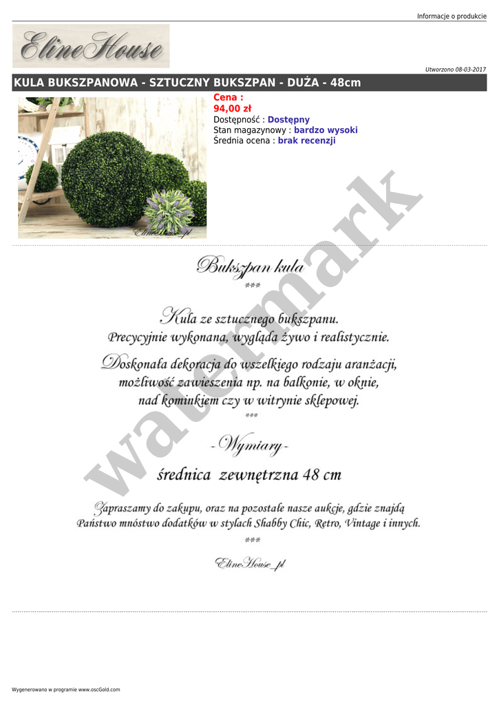 Informacje o produkcie Utworzono 08-03-2017 KULA BUKSZPANOWA - SZTUCZNY BUKSZPAN - DUŻA - 48cm Cena : 94,00 zł w at er m ar k Dostępność : Dostępny Stan magazynowy : bardzo wysoki Średnia ocena : brak recenzji Wygenerowano w programie www.oscGold.com