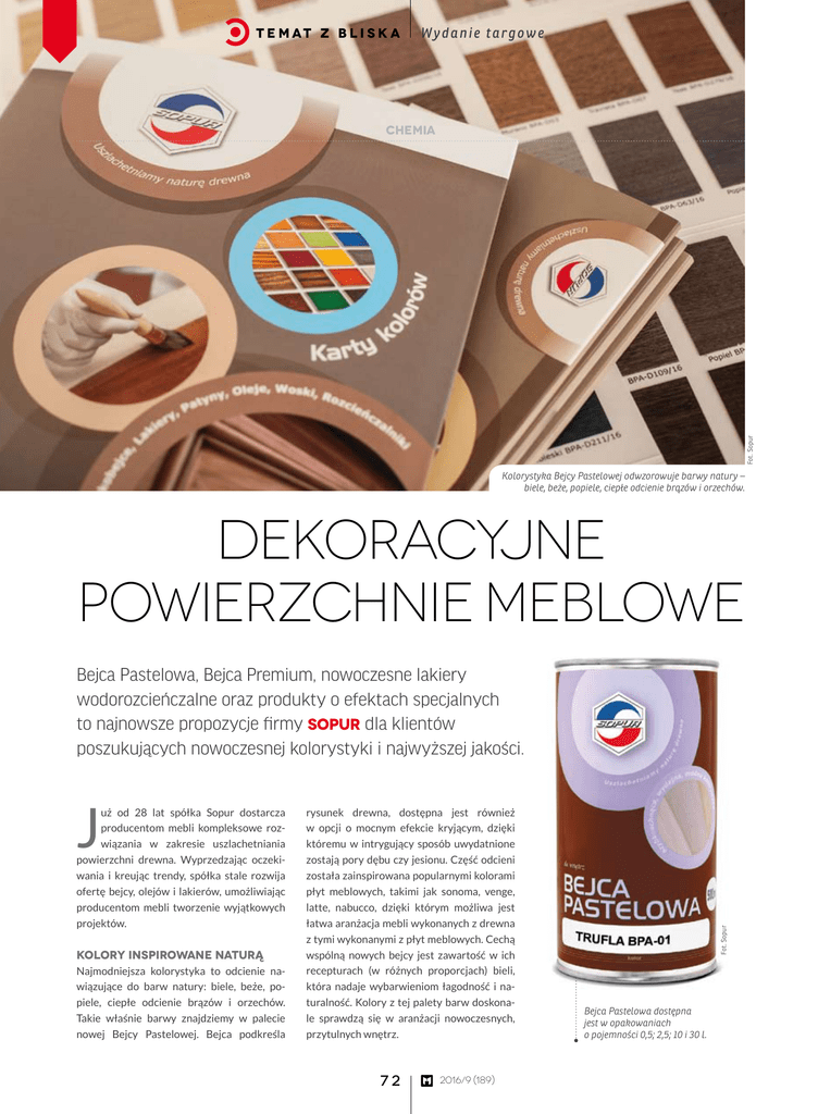 t e m at z b l i s k a Wydanie targowe Fot. Sopur chemia Kolorystyka Bejcy Pastelowej odwzorowuje barwy natury – biele, beże, popiele, ciepłe odcienie brązów i orzechów. Dekoracyjne powierzchnie meblowe J uż od 28 lat spółka Sopur dostarcza producentom mebli kompleksowe rozwiązania w zakresie uszlachetniania powierzchni drewna. Wyprzedzając oczekiwania i kreując trendy, spółka stale rozwija ofertę bejcy, olejów i lakierów, umożliwiając producentom mebli tworzenie wyjątkowych projektów. Kolory inspirowane naturą Najmodniejsza kolorystyka to odcienie nawiązujące do barw natury: biele, beże, popiele, ciepłe odcienie brązów i orzechów. Takie właśnie barwy znajdziemy w palecie nowej Bejcy Pastelowej. Bejca podkreśla rysunek drewna, dostępna jest również w opcji o mocnym efekcie kryjącym, dzięki któremu w intrygujący sposób uwydatnione zostają pory dębu czy jesionu. Część odcieni została zainspirowana popularnymi kolorami płyt meblowych, takimi jak sonoma, venge, latte, nabucco, dzięki którym możliwa jest łatwa aranżacja mebli wykonanych z drewna z tymi wykonanymi z płyt meblowych. Cechą wspólną nowych bejcy jest zawartość w ich recepturach (w różnych proporcjach) bieli, która nadaje wybarwieniom łagodność i naturalność. Kolory z tej palety barw doskonale sprawdzą się w aranżacji nowoczesnych, przytulnych wnętrz. 72 2016/9 (189) Fot. Sopur Bejca Pastelowa, Bejca Premium, nowoczesne lakiery wodorozcieńczalne oraz produkty o efektach specjalnych to najnowsze propozycje firmy Sopur dla klientów poszukujących nowoczesnej kolorystyki i najwyższej jakości. Bejca Pastelowa dostępna jest w opakowaniach o pojemności 0,5; 2,5; 10 i 30 l. t e m at z b l i s k a Powierzchnie wykończone Bejcą Specjal Efekt Szronu mają wygląd oszronionego szkła z efektem trójwymiarowości. Czar starych mebli Drewno wyrzucone na brzeg morza, zniszczone przez deszcz, słońce i upływający czas jest niepowtarzalne. Meble i elementy dekoracyjne wykonane w takim stylu stają się perełkami w „designerskich” wnętrzach. Na szczęście przemiana nowego mebla na nadgryziony zębem czasu antyk nie jest trudna. Postarzacz do Drewna to nowoczesny płynny produkt nadający powierzchniom dębowym i jesionowym wygląd naturalnie postarzonego, wystawionego na warunki atmosferyczne drewna. Produkt reaguje z substancjami zawartymi w drewnie, co powoduje uzyskanie oryginalnych wybarwień – od koloru brązowego do ciemnogranatowego. Jest łatwy w użyciu, bezzapachowy, a otrzymane wybarwienia są odporne na działanie światła. Fot. Sopur Bejca Premium – najwyższa jakość i niezawodność Dla osób poszukujących produktów wykończeniowych o najwyższej jakości i ponadczasowej elegancji Sopur przygotował nową Bejcę Premium. Jest to produkt o wyjątkowych właściwościach, pozwalający na podkreślenie rysunku słojów drewna w sposób nieporównywalny dotąd z żadną inną bejcą w ofercie. Rysunek sosny, jesionu czy dębu zyskuje niespotykaną wcześniej głębię. Doskonała czystość wybarwień, łatwość aplikacji oraz uniwersalność (bejca doskonale barwi każdy rodzaj drewna) to ogromne atuty nowego produktu. Jednak największą zaletą Bejcy Premium jest jej zdolność do maskowania różnej barwy sąsiadujących elementów drewnianych. Przełomowa receptura Bejcy Premium pozwala uzyskać niezwykle równe wybarwienia tam, gdzie do tej pory nie było to możliwe. Produkt przeznaczony jest do każdego gatunku drewna stosowanego wewnątrz pomieszczeń, a jego aplikacja może odbywać się pędzlem, tamponem lub natryskiem z przetarciem. Wydanie targowe W celu podkreślenia efektu naturalnej powierzchni otrzymane wybarwienia można pokryć Olejem Twardym do Mebli lub Olejem Nano do Podłóg (Postarzacz doskonale nadaje się do podłóg). Drewno oszronione i w klimacie industrialnym Skorodowane powierzchnie, rdzawe kolory, chropowate struktury wpisują się w najnowsze trendy stylu industrialnego. Estetyka nawiązująca do starych fabryk pełnych zaśniedziałej miedzi i przerdzewiałego metalu łamie hegemonię bieli, czerni i szarości, ocieplając wnętrza. Nowe Bejce Specjal Efekt Rdzy potrafią zamienić tradycyjne powierzchnie MDF i drewna na skorodowaną miedź lub żelazo z plamami rdzy w różnych kształtach i rozmiarach. Firma proponuje tutaj dwa produkty – Bejcę Efekt Rdzy-Miedź i Bejcę Efekt Rdzy-Żelazo. Produkty można mieszać ze sobą w różnych proporcjach, otrzymując reklama Genera l n y d y s t r y b u t o r : 73 2016/9 (189) niebanalnie postarzone powierzchnie, które staną się hitem w najnowszych aranżacjach wnętrz. Fanów „efektów specjalnych” zainteresuje również nowa w ofercie Bejca Specjal Efekt Szronu, która nada malowanym powierzchniom wygląd oszronionego szkła. Otrzymane wybarwienia charakteryzują się trójwymiarowym efektem, wyczuwalnym również poprzez dotyk. Ponieważ uzyskany kolor zależy od odcienia zastosowanego lakieru podkładowego, możliwości dekoracyjne są praktycznie nieograniczone. Szczególnie eleganckie efekty można uzyskać, stosując bejcę na czarny lub biały podkład, a następnie pokrywając ją bejcą srebrną. Meble czy ramy zyskują niepowtarzalny, luksusowy charakter, który przypadnie do gustu nawet najbardziej wymagającym klientom. Z wszystkimi nowymi propozycjami w ofercie firmy Sopur będzie można zapoznać się podczas targów Drema. • — artykuł promocyjny