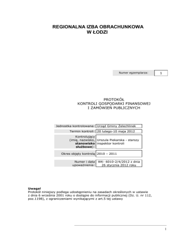 REGIONALNA IZBA OBRACHUNKOWA W ŁODZI Numer egzemplarza: 1 PROTOKÓŁ KONTROLI GOSPODARKI FINANSOWEJ I ZAMÓWIEŃ PUBLICZNYCH Jednostka kontrolowana: Urząd Gminy Żelechlinek Termin kontroli: 20 lutego-10 maja 2012 Kontrolujący (imię, nazwisko, Urszula Piekarska - starszy stanowisko inspektor kontroli służbowe): Okres objęty kontrolą 2010 – 2011 Numer i data WK- 6010-2/4/2012 z dnia upoważnienia: 26 stycznia 2012 roku Uwaga! Protokół niniejszy podlega udostępnieniu na zasadach określonych w ustawie z dnia 6 września 2001 roku o dostępie do informacji publicznej (Dz. U. nr 112, poz.1198), z ograniczeniami wynikającymi z art.5 tej ustawy ______________________________________________________ 1 ______________________________________________________ 2 PROTOKÓŁ Z KONTROLI KOMPLEKSOWEJ PRZEPROWADZONEJ W GMINIE ŻELECHLINEK Regionalna Izba Obrachunkowa w Łodzi, ul. Zamenhofa 10 90-431 Łódź, tel. (0-42) 6366896, fax (0-42) 6367424 I. INFORMACJE WSTĘPNE DANE O JEDNOSTCE Gmina Żelechlinek położona jest w województwie łódzkim, w północnej części powiatu tomaszowskiego. Sąsiaduje z siedmioma gminami: Jeżów, Głuchów, Rawa Mazowiecka, Czerniewice, Lubochnia, Budziszewice i Koluszki. Posiada bliskie połączenia komunikacyjne: - od wschodu z drogą krajową nr 8 – Warszawa Katowice - od północy z drogą krajową nr 72 – Łódź – Rawa Mazowiecka - od zachodu i południowego zachodu z drogą wojewódzką nr 715 – Ujazd – Koluszki. Powierzchnię 92km2 zamieszkuje 3426 osób. Średnia gęstość zaludnienia wynosi 38 osób na 1 km2 i jest najmniejsza w całym powiecie. Statystyka mieszkańców wg wieku i płci Wiek Mężczyzn Kobiet Ogółem 0-2 59 52 111 3 25 26 51 4-5 38 37 75 6 26 18 44 7 14 17 31 8-12 85 97 182 13-15 58 52 110 16-17 33 39 72 18 20 37 57 19-65 1114 19-60 >65 912 209 > 60 Ogółem 1114 1681 912 209 458 458 1745 3426 Na obszarze gminy położonych jest 39 miejscowości tworzących 19 sołectw. W związku z małą gęstością zaludnienia przeważają małe wsie liczące do 100 mieszkańców. Rolnictwo to podstawowa gałąź produkcji materialnej uzależniona od czynników przyrodniczych. Wartość użytkowa gleb – wyrażona wskaźnikiem bonitacji – wskazuje, że na terenie gminy występują klasy od III do VI, przy czym największy odsetek, bo aż 55% stanowią gleby klasy V, natomiast gleb klasy III jest tylko 0,05 %. Najsłabsze gleby występują we wsi Brenik, Budki Łochowskie, Lucjanów, Łochówek Mały, Nowe Byliny, Teklin i Władysławów. Najżyźniejsze zaś na obszarze Świniokierza Włościańskiego i Żelechlina. Zestawienie powierzchni w ha: użytki rolne: 7789, grunty leśne: 1156, grunty zabudowane i zurbanizowane: 168, w tym drogi: 154 grunty pod wodami: 2, Nieużytki: 69, Tereny różne: 17. Poziom bezrobocia. _____________________________________________________ 3 PROTOKÓŁ Z KONTROLI KOMPLEKSOWEJ PRZEPROWADZONEJ W GMINIE ŻELECHLINEK Regionalna Izba Obrachunkowa w Łodzi, ul. Zamenhofa 10 90-431 Łódź, tel. (0-42) 6366896, fax (0-42) 6367424 Liczba bezrobotnych na dzień 31 grudnia 2010 roku wynosiła 188 osób a na 31 grudnia 2011 roku – 202, co stanowi wzrost o 7,4%. W ogólnej liczbie bezrobotnych jest 80 kobiet (procent udziału 39,6 %).Bezrobotnych bez prawa do zasiłku jest 170 osób (procent udziału 84,2 %) a osób niepełnosprawnych - 12 (procent udziału 5,9%). Z ogólnej liczby zarejestrowanych w Powiatowym Urzędzie Pracy w Tomaszowie Mazowieckim (202 osób), struktura wg wykształcenia przedstawia się następująco:wyższe 12,- policealne i średnie zawodowe – 36, - średnie ogólnokształcące – 12,zasadnicze zawodowe – 71- gimnazjalne i poniżej – 71. Na dzień 31 grudnia 2011 roku w Gminie Żelechlinek było 122 prowadzonych działalności gospodarczych. Na terenie gminy przeważają działalności związane z obróbką mięsa, zakłady betoniarskie, kopalnie piasków, młyny a także usługi transportowe i rolnicze. Komunikacja Układ sieci drogowej na terenie gminy Żelechlinek tworzą: drogi publiczne powiatowe i gminne oraz drogi niepubliczne wewnętrzne, które nie posiadają uregulowanego statusu prawnego. Drogi powiatowe o łącznej długości 36,650 km Nowy nr drogi Stary nr drogi Przebieg Długość km 1303E 30110 30111 Lubochnia – Żelechlinek – Głuchów 11,300 4110E 30112 Żelechlinek – Dziurdzioły 9,000 4331E 30193 Józefin - Łochów - Byliny Stare 5,600 4301E 30109 Stanisławów – Węgrzynowice 2,600 Żelechlinek – Bukowiec – Czerniewice 6,300 Chociszew – Lubochnia 0,350 Wólka Jagielczyńska - Byliny Nowe 1,500 4304E 4315E 4302E 30113 Drogi gminne o łącznej długości 92,000 km Nowy nr drogi Stary nr drogi Przebieg 116061E 5108 (Węgrzynowice-Modrzewie) - gr. gm. Budziszewice Modrzewek- Żelechlin 116501E 5101 Stare Jankowice - gr. gm. Jeżów - Gutkowice - Kupiec –Czechowice 5117 Żelechlinek – Gawełków 116502E 5109 Żelechlin – Swiniokierz Nowy 116503E 5102 Dzielnica – Gutkowice 116504E 5103 Naropna – Kopiec 116505E 5104 Naropna - Budki Łochowski 116506E 5105 Żelechlinek – Ignatów 116507E 5106 Feliksów - Nowe Byliny 116508E 5107 Feliksów – Radwanka 116509E 5110 Sokołówka – Bukowiec 116510E 5111 droga przez Swiniokierz Włościański _____________________________________________________ 4 PROTOKÓŁ Z KONTROLI KOMPLEKSOWEJ PRZEPROWADZONEJ W GMINIE ŻELECHLINEK Regionalna Izba Obrachunkowa w Łodzi, ul. Zamenhofa 10 90-431 Łódź, tel. (0-42) 6366896, fax (0-42) 6367424 116511E 5112 5113 droga powiatowa nr 1303E Nowiny Nowiny - Lesisko - gr. gm. Czerniewice (Annopol) 116512E 5114 5115 Władysławów – Naropna Naropna – Brenik 116513E 5116 Feliksów – Łochów 116514E 5118 Sokołówka – Staropole 116515E 5119 droga przez Chociszew 116516E 5120 droga przez Bukowiec 116517E 5121 Żelechlinek - Żelechlinek Gaj 116518E 5122 5124 droga przez Żelechlin Mały droga przez Stanisławów 116519E 5123 Radwanka - Czerwonka - gr. 