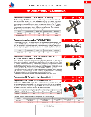 K ATA L OG SPRZĘTU POŻARNICZEGO 01 ARMATURA POŻARNICZA 01 14 005 01 14 006 01 14 007 Prądownica 52 Turbo 2000 wydajność 400 l 01 14 008 Prądownica 75 Turbo 2000 wydajność 750 l 01 14 009 Prądownica wodna TURBOMATIC (CNBOP) Prądownica typu TURBO przeznaczona jest do pracy na zakończeniu linii wężowej samochodów pożarniczych oraz wszelkiego rodzaju motopomp. Prądownica przystosowana jest opcjonalnie do założenia nakładki pianowej dzięki czemu uzyskujemy prądownicę pianową do piany ciężkiej klasy S-2 (PP-2) o wydajności 200 l/min. Montaż nastawki odbywa się poprzez nakręcenie na głowicę TURBO. Prądownica posiada skokową regulację wydajności w zakresie 100 - 400 l/min. Prądownica posiada możliwość oczyszczania grzybka. Nazwa Nasada wejścia Długość [mm] Wysokość L[mm] Masa [kg] Turbomatic Nakładka do piany Ø 52 285 370 250 135 2,500 0,600 Prądownica uniwersalna TURBOJET 2000 Prądownica TURBOJET przeznaczona jest do stosowania na zakończenie linii wężowych Ø52 szybkiego natarcia w samochodach wodno-pianowych. Prądownica przystosowana jest do wytwarzania strumieni wodnych: zwarty, rozproszony, zwarty i rozproszony jednocześnie. prądownica nie posiada regulacji wydajności. Nazwa Nasada wejścia Długość [mm] Wysokość L[mm] Masa [kg] Turbojet 2000 52/C 355 250 2,900 Prądownica wodna TURBO-MASTER - PWT 52 100/200/300/400 l/min (CNBOP) Turbo Master to prądownica z regulowaną wydajnością. Pozwala uzyskać trzy rodzaje strumienia, płynnie regulować kąt rozwarcia strumienia rozproszonego, a także posiada zintegrowaną funkcję oczyszczania (płukania). Wydajność regulowana jest przy pomocy obrotowego pierścienia. Przekręcając pierścień skrajnie w prawo uruchamiamy funkcję oczyszczania - pozwala to na wypłukanie zanieczyszczeń o średnicy do 6 mm. Regulacja wydajności 100-200-300-400 l/min - płukanie Pomiędzy strumieniem rozproszonym a parasolowym możliwa jest płynna regulacja kąta rozwarcia - max 160 stopni. Skrajne położenie uruchamia parasol ochraniający Strażaka przed uderzeniem fali ciepła podczas efektu flash over. Dane techniczne: ciśnienie robocze 0,6 MPa, wydajność 100 - 400 l/min. Prądownica TURBO 2000 wyposażona w zawór kulowy, przeznaczona jest do wytwarzania strumieni zwartych i rozproszonych z płynną regulacją kąta bryłowego strumienia rozproszonego do 120º. Posiada możliwość skokowej regulacji wydajności. Wyposażona jest w nasadę obrotową. Wielkość Przepływ [l/min.] Długość [mm] 52/C (400) 75/B (750) 130-235-400 360-550-750 290 380 Szerokość [mm] Wysokość [mm] 115 126 245 245 Masa [kg] 2,500 3,600 Przepływ i zasięgi rzutów prądownic Turbo 2000 przy ciśnieniu 6 bar Wielkość 52/C (400) 75/B (750) Strum. zwarty [l/min] 130-235-400 360-550-750 Przepływ Strum. rozprosz. [l/min] 130-235-400 360-550-750 DYSTRYBUTOR Zasięg rzutu Strum. zwarty [m] Strum. rozprosz. [m] 27-31-37 9-9,5-10 35-38-45 9-11-12 Maks. kąt strum. 120˚ 120˚