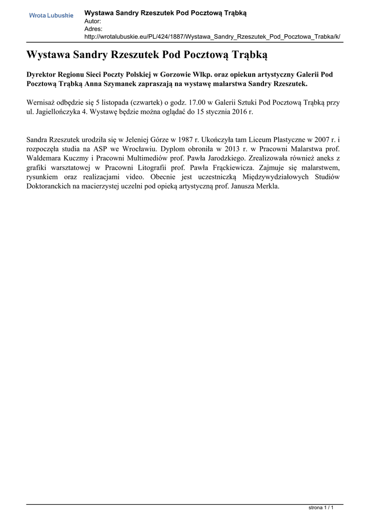 Wystawa Sandry Rzeszutek Pod Pocztową Trąbką Autor: Adres: http://wrotalubuskie.eu/PL/424/1887/Wystawa_Sandry_Rzeszutek_Pod_Pocztowa_Trabka/k/ Wystawa Sandry Rzeszutek Pod Pocztową Trąbką Dyrektor Regionu Sieci Poczty Polskiej w Gorzowie Wlkp. oraz opiekun artystyczny Galerii Pod Pocztową Trąbką Anna Szymanek zapraszają na wystawę malarstwa Sandry Rzeszutek. Wernisaż odbędzie się 5 listopada (czwartek) o godz. 17.00 w Galerii Sztuki Pod Pocztową Trąbką przy ul. Jagiellończyka 4. Wystawę będzie można oglądać do 15 stycznia 2016 r. Sandra Rzeszutek urodziła się w Jeleniej Górze w 1987 r. Ukończyła tam Liceum Plastyczne w 2007 r. i rozpoczęła studia na ASP we Wrocławiu. Dyplom obroniła w 2013 r. w Pracowni Malarstwa prof. Waldemara Kuczmy i Pracowni Multimediów prof. Pawła Jarodzkiego. Zrealizowała również aneks z grafiki warsztatowej w Pracowni Litografii prof. Pawła Frąckiewicza. Zajmuje się malarstwem, rysunkiem oraz realizacjami video. Obecnie jest uczestniczką Międzywydziałowych Studiów Doktoranckich na macierzystej uczelni pod opieką artystyczną prof. Janusza Merkla. strona 1 / 1 Powered by TCPDF (www.tcpdf.org)