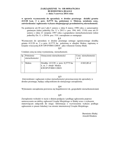 ZARZĄDZENIE Nr OR 0050.670.2014 BURMISTRZA BIAŁEJ z dnia 3 czerwca 2014 roku w sprawie wyznaczenia do sprzedaży w drodze przetargu działki gruntu 413/28 k.m. 3 o pow. 0,5775 ha, położonej w Mokrej, ustalenia ceny, zatwierdzenia i ogłoszenia wykazu obejmującego przedmiotową nieruchomość. Na podstawie art.30 ust.2 pkt.3 ustawy z dnia 8 marca 1990 roku o samorządzie gminnym (tekst jednolity Dz. U z 2013 r. poz. 594, 645, 1318) oraz art.35 ustawy z dnia 21 sierpnia 1997 roku o gospodarce nieruchomościami (tekst jednolity Dz. U. z 2014r. poz. 518 ) zarządzam co następuje: §1 Wyznaczam do sprzedaży w drodze przetargu ustnego ograniczonego działkę gruntu 413/28 m. 3 o pow. 0,5775 ha położoną w obrębie Mokra, zapisaną w księdze wieczystej KW OP1P/00011200/8 jako własność Gminy Biała §2 Ustalam cenę na niżej wymienioną nieruchomość. lp. Położenie nieruchomości Oznaczenie nieruchomości 1. Mokra Działka 413/28 o pow. 0,5775 ha k. m. 3 obręb Mokra KWOP1P/00011200/8 Cena nieruchomości w zł 4 043,00 zł §3 Zatwierdzam i ogłaszam wykaz nieruchomości przeznaczonej do sprzedaży w drodze przetargu, będący załącznikiem do niniejszego zarządzenia. §4 Wykonanie zarządzenia powierza się Inspektorowi ds. gospodarki nieruchomościami §5 Zarządzenie wchodzi w życie z dniem podjęcia i podlega ogłoszeniu poprzez umieszczenie na tablicy ogłoszeń Urzędu Miejskiego w Białej wraz z wykazem stanowiącym załącznik do niego. Informacja o wywieszeniu wykazu podlega ogłoszeniu w prasie lokalnej i na stronie internetowej Urzędu Miejskiego. Burmistrz Białej Arnold Hindera Załącznik do zarządzenia Nr OR 0050.670.2014 Burmistrza Białej z dnia 3 czerwca 2014 w sprawie przeznaczenia do sprzedaży w drodze przetargu działki gruntu. Wykaz nieruchomości przeznaczonej do sprzedaży Położenie Oznaczenie nieruchomości nieruchomości wg ewidencji gruntów Mokra Działka 413/28 o pow.0,5775 ha obręb Mokra mapa 3 KW OP1P/00011200/8 N-0,5775 ha Opis nieruchomości Działka położona na granicy wsi Krobusz i Mokra , z dala od terenów zabudowanych , w otoczeniu gruntów rolnych i wysypiska ziemi i kruszywa budowlanego. Działka o wydłużonych kształcie, kiedyś stanowiła drogę wewnętrzną. Działka o niskiej przydatności rolniczej, rozłóg niekorzystny, bez wyposażenia w urządzenia do produkcji rolnej . Nieruchomość wolna jest od obciążeń na rzecz osób trzecich i nie jest również przedmiotem roszczeń wobec osób trzecich. Przeznaczenie nieruchomości i sposób zagospodarowania Działka nie objęta planem zagospodarowania przestrzennego wg obowiązującego studium uwarunkowań i kierunków zagospodarowania przestrzennego Gminy Biała teren obejmujący działkę 413/28 oznaczony jest częściowo jako droga wewnętrzna oraz obszary węzłowe systemu ekologicznego o znaczeniu lokalnym -chronione Cena nieruchomości Forma zbycia Wartość działki 4 043,00 zł Sprzedaż zwolniona z VAT Sprzedaż w drodze przetargu ustnego ograniczonego do właścicieli działek sąsiednich. Cena uzyskana w przetargu . płatna jednorazowo przed zawarciem aktu notarialnego. Sprzedaż na własność Zgodnie z art. 35 ustawy z dnia 21 sierpnia 1997 roku o gospodarce nieruchomościami wykaz niniejszy wywiesza się na okres 21 dni. Wywieszono na okres od 4 czerwca 2014 do 26 czerwca 2014 roku Osoby, którym w odniesieniu do nieruchomości wymienionej w wykazie służy roszczenie w jej nabyciu na podstawie ustawy o gospodarce nieruchomościami lub odrębnych przepisów winne złożyć stosowny wniosek w terminie 6 tygodni, licząc od daty wywieszenia wykazu Biała dnia, 3 czerwca 2014 r.