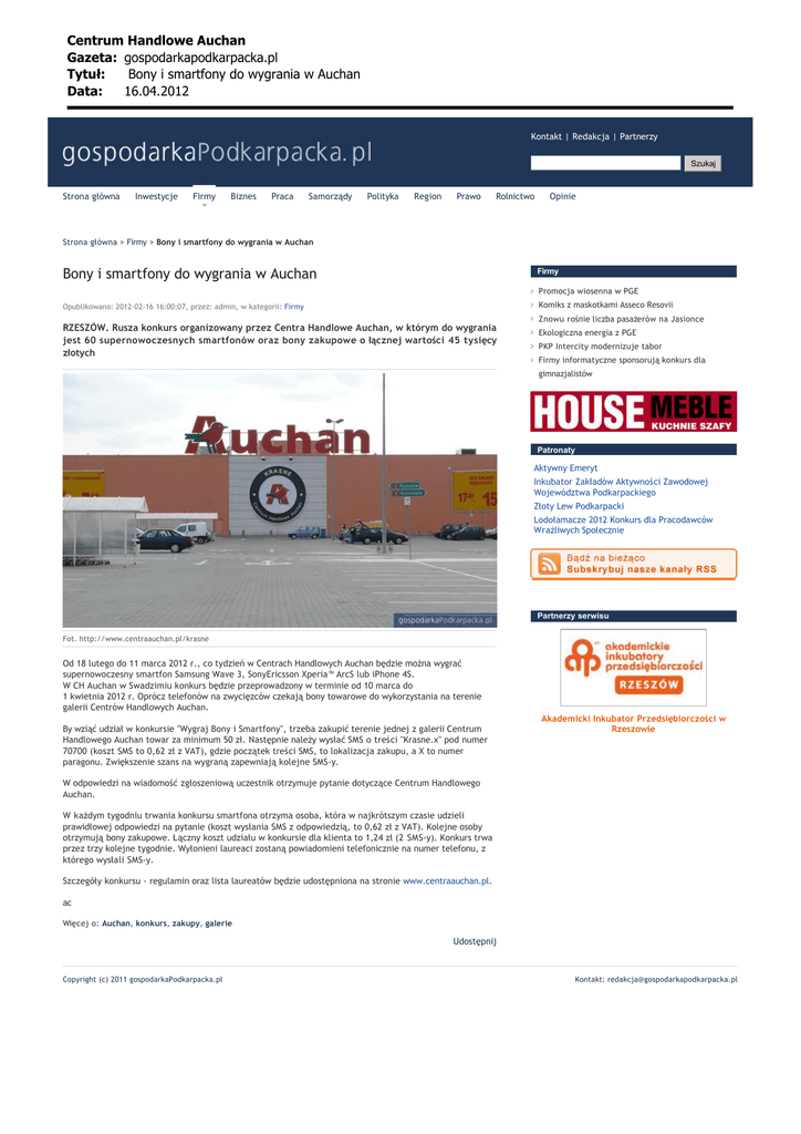 Centrum Handlowe Auchan Gazeta: gospodarkapodkarpacka.pl Tytu³: Bony i smartfony do wygrania w Auchan Data: 16.04.2012 Kontakt | Redakcja | Partnerzy Szukaj Strona główna Inwestycje Firmy Biznes Praca Samorządy Polityka Region Prawo Rolnictwo Opinie Strona główna > Firmy > Bony i smartfony do wygrania w Auchan Firmy Bony i smartfony do wygrania w Auchan Promocja wiosenna w PGE Komiks z maskotkami Asseco Resovii Opublikowano: 2012-02-16 16:00:07, przez: admin, w kategorii: Firmy Znowu rośnie liczba pasażerów na Jasionce RZESZÓW. Rusza konkurs organizowany przez Centra Handlowe Auchan, w którym do wygrania jest 60 supernowoczesnych smartfonów oraz bony zakupowe o łącznej wartości 45 tysięcy złotych Ekologiczna energia z PGE PKP Intercity modernizuje tabor Firmy informatyczne sponsorują konkurs dla gimnazjalistów Patronaty Aktywny Emeryt Inkubator Zakładów Aktywności Zawodowej Województwa Podkarpackiego Złoty Lew Podkarpacki Lodołamacze 2012 Konkurs dla Pracodawców Wrażliwych Społecznie Partnerzy serwisu Fot. http://www.centraauchan.pl/krasne Od 18 lutego do 11 marca 2012 r., co tydzień w Centrach Handlowych Auchan będzie można wygrać supernowoczesny smartfon Samsung Wave 3, SonyEricsson Xperia™ ArcS lub iPhone 4S. W CH Auchan w Swadzimiu konkurs będzie przeprowadzony w terminie od 10 marca do 1 kwietnia 2012 r. Oprócz telefonów na zwycięzców czekają bony towarowe do wykorzystania na terenie galerii Centrów Handlowych Auchan. By wziąć udział w konkursie "Wygraj Bony i Smartfony", trzeba zakupić terenie jednej z galerii Centrum Handlowego Auchan towar za minimum 50 zł. Następnie należy wysłać SMS o treści "Krasne.x" pod numer 70700 (koszt SMS to 0,62 zł z VAT), gdzie początek treści SMS, to lokalizacja zakupu, a X to numer paragonu. Zwiększenie szans na wygraną zapewniają kolejne SMS-y. Akademicki Inkubator Przedsiębiorczości w Rzeszowie W odpowiedzi na wiadomość zgłoszeniową uczestnik otrzymuje pytanie dotyczące Centrum Handlowego Auchan. W każdym tygodniu trwania konkursu smartfona otrzyma osoba, która w najkrótszym czasie udzieli prawidłowej odpowiedzi na pytanie (koszt wysłania SMS z odpowiedzią, to 0,62 zł z VAT). Kolejne osoby otrzymują bony zakupowe. Łączny koszt udziału w konkursie dla klienta to 1,24 zł (2 SMS-y). Konkurs trwa przez trzy kolejne tygodnie. Wyłonieni laureaci zostaną powiadomieni telefonicznie na numer telefonu, z którego wysłali SMS-y. Szczegóły konkursu - regulamin oraz lista laureatów będzie udostępniona na stronie www.centraauchan.pl. ac Więcej o: Auchan, konkurs, zakupy, galerie Udostępnij Copyright (c) 2011 gospodarkaPodkarpacka.pl Kontakt: [email protected]