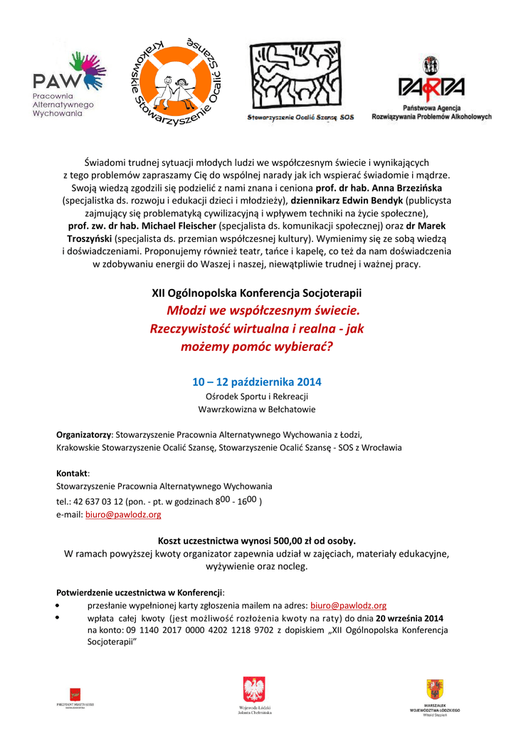 Świadomi trudnej sytuacji młodych ludzi we współczesnym świecie i wynikających z tego problemów zapraszamy Cię do wspólnej narady jak ich wspierać świadomie i mądrze. Swoją wiedzą zgodzili się podzielić z nami znana i ceniona prof. dr hab. Anna Brzezińska (specjalistka ds. rozwoju i edukacji dzieci i młodzieży), dziennikarz Edwin Bendyk (publicysta zajmujący się problematyką cywilizacyjną i wpływem techniki na życie społeczne), prof. zw. dr hab. Michael Fleischer (specjalista ds. komunikacji społecznej) oraz dr Marek Troszyński (specjalista ds. przemian współczesnej kultury). Wymienimy się ze sobą wiedzą i doświadczeniami. Proponujemy również teatr, tańce i kapelę, co też da nam doświadczenia w zdobywaniu energii do Waszej i naszej, niewątpliwie trudnej i ważnej pracy. XII Ogólnopolska Konferencja Socjoterapii Młodzi we współczesnym świecie. Rzeczywistość wirtualna i realna - jak możemy pomóc wybierać? 10 – 12 października 2014 Ośrodek Sportu i Rekreacji Wawrzkowizna w Bełchatowie Organizatorzy: Stowarzyszenie Pracownia Alternatywnego Wychowania z Łodzi, Krakowskie Stowarzyszenie Ocalić Szansę, Stowarzyszenie Ocalić Szansę - SOS z Wrocławia Kontakt: Stowarzyszenie Pracownia Alternatywnego Wychowania tel.: 42 637 03 12 (pon. - pt. w godzinach 800 - 1600 ) e-mail: [email protected] Koszt uczestnictwa wynosi 500,00 zł od osoby. W ramach powyższej kwoty organizator zapewnia udział w zajęciach, materiały edukacyjne, wyżywienie oraz nocleg. Potwierdzenie uczestnictwa w Konferencji: przesłanie wypełnionej karty zgłoszenia mailem na adres: [email protected] wpłata całej kwoty (jest możliwość rozłożenia kwoty na raty) do dnia 20 września 2014 na konto: 09 1140 2017 0000 4202 1218 9702 z dopiskiem „XII Ogólnopolska Konferencja Socjoterapii” Program XII Ogólnopolskiej Konferencji Socjoterapii 10 - 12.10.2014 r. Piątek 10.10.2014 r. 9.30 – 11.00 Zakwaterowanie uczestników Konferencji 11.00 – 11.15 Uroczyste rozpoczęcie Konferencji 11.15 – 12.45 Wykład dr Marek Troszyński Centrum Badań nad Nowymi Mediami Collegium Civitas Socjolog, absolwent historii i socjologii na UAM w Poznaniu, kierownik Centrum Badań nad Nowymi Mediami Collegium Civitas, wykładowca Polsko-Japońskiej Wyższej Szkoły Technik Komputerowych, prezes Fundacji Wiedza Lokalna (zajmującej się badaniami społecznymi na potrzeby wspólnot lokalnych i organizacji pozarządowych). Członek Rady Konsultacyjnej przy Radzie ds. Przeciwdziałaniu Dyskryminacji Rasowej, Ksenofobii i związanej z nim Nietolerancji. Twórca i realizator projektu raportmniejszosci.pl, badania monitorującego język wrogości / mowę nienawiści wobec mniejszości w polskim Internecie. Ostatnie publikacje: „Kultura instytucjonalna w sieci. Treści i odbiorcy”, Warszawa 2014. „Prosumpcjonizm pop-przemysłów. Analiza polskich przedsiębiorstw z branży rozrywkowej”, Warszawa 2013. „Normy i sieci społeczne w kulturze. Zadania publiczne w północno-wschodniej Polsce”, Warszawa 2013. 13.00 – 13.45 Obiad 14.30 – 16.00 Wykład prof. dr hab. Anna Brzezińska Uniwersytet im. Adama Mickiewicza w Poznaniu Psycholożka, profesorka Uniwersytetu im. Adama Mickiewicza w Poznaniu. Kierownik Zakładu Psychologii Socjalizacji i Wspomagania Rozwoju oraz członek Komisji Etyki ds. Projektów Badawczych Instytutu Psychologii UAM. Członek Rady Naukowej i opiekun naukowy Zespołu Wczesnej Edukacji Instytutu Badań Edukacyjnych w Warszawie. Członek Komitetu Psychologii Polskiej Akademii Nauk. Zastępca Przewodniczącego Komitetu Rozwoju Edukacji Narodowej PAN. Interesuje się problemami rozwoju i edukacji oraz zdrowia publicznego. Autorka monografii Społeczna psychologia rozwoju, współautorka książki W poszukiwaniu złotego środka. Rozmowy o rozwoju człowieka, redaktorka i autorka podręczników akademickich. Redaktorka serii publikacji oświęconych aktywizacji zawodowej integracji społecznej osób z ograniczeniami sprawności. 16.30 – 18.30 Spotkanie w grupach warsztatowych 19.00 - 19.45 Kolacja 20.30 Spektakl „Manifest” Teatr im. Stefana Batorego z Chorzowa Teatr im. Stefana Batorego to społeczność złożona z młodych i ambitnych uczniów III Liceum im. Stefana Batorego w Chorzowie. Teatr choć dopiero raczkuje w poważnym świecie sztuki, ma już na swoim koncie kilka sukcesów. Spektakle takie jak “Jacuś”, ”Uczta”, “Było Dobre”, czy “Manifest”, wystawiane są na różnych konkursach pod szyldem owego Teatru i udaje im się zająć znaczące miejsca, czy wyróżnienia, np. na Spotkaniach Teatralnych “Bez Maski” w Knurowie. Tworzone spektakle ocierają się o tematy aktualnych problemów politycznych, przedstawiają życie w krzywym zwierciadle, takie, jakie widzą je młodzi ludzie wkraczający w dorosłość. Scenariusz spektaklu “Manifest” powstał w oparciu o krótkie artykuły z gazet i internetu, sensacje, a także z własnych przemyśleń. 22.00 Śpiewanki przy gitarze Sobota 11.10.2014 r. 08.30 – 09.00 Śniadanie 09.30 – 11.00 Wykład prof. zw. dr hab. Michael Fleischer Instytut Dziennikarstwa i Komunikacji Społecznej Uniwersytet Wrocławski Profesor Corporate Identity w Szkole Wyższej Psychologii Społecznej w Warszawie (wydział zamiejscowy we Wrocławiu). W 2005 roku otrzymał Medal Komisji Edukacji Narodowej Ministerstwa Edukacji Narodowej i Sportu. Od kilu lat zaproszany do wygłoszenia wykładów na licznych Uniwersytetach (między innymi: Amsterdam, Hamburg, Berlin, Kiel, Kolonia, Monachium, Brema, Würzburg). 11.30 – 13.30 Warsztaty twórcze w grupach 14.00 – 14.45 Obiad 15.15 – 16.45 Wykład Artur Lutarewicz i Paweł Siłakowski Artur Lutarewicz – psycholog w Młodzieżowym Ośrodku Socjoterapii nr 2 „Kąt” w Warszawie, członek Społecznego Komitetu ds. AIDS, doradca Anonimowego Punktu Testowania HIV, profilaktyk, zajmuje się problemami młodzieży. Paweł Siłakowski – psycholog, st
