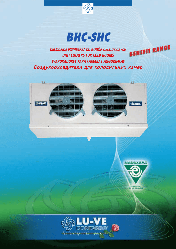 BHC-SHC CHŁODNICE POWIETRZA DO KOMÓR CHŁODNICZYCH UNIT COOLERS FOR COLD ROOMS EVAPORADORES PARA CÁMARAS FRIGORÍFICAS оздухоохладители для холодильных камер B2HC BENEFIT S2HC SUPER Chłodnice powietrza do komór chłodniczych Wymiary i funkcje, które wyróżniają nową serię chłodnic powietrza super scalonych i super wydajnych są następujące: Super wydajna wymiana termiczna Zredukowane osuszanie Zredukowane tworzenie się szronu Zwiększony wydmuch powietrza Znacznie zredukowana pojemność układu chłodzącego Niski poziom hałasu Niskie zużycie energii Zredukowane wymiary całkowite 1400 ÷ 9400 W 18 MODELS 72 VERSIONS Unit coolers for cold rooms. KORZYŚĆ Chłodnice powietrza typu B2HC z: Nowym rozdzielaczem JET-O-MATIC® opatentowanym przez LU-VE Contardo. SUPER Chłodnice powietrza serii S2HC standard. The dimensional and functional characteristics that distinguish the new Unit coolers range Gama de evaporadores :амма воздухоохладителей super compact - super efficient unit B2HC with: B2HC con: B2HC с: cooler range are: New patented Nuevo distribuidor pa- овым распределителем Super efficient heat exchanger JET-O-MATIC® distributor tentado JET-O-MATIC®, JET-O-MATIC® LU-VE Contardo. de LU-VE Contardo запатентованным LU-VE Reduced dehumidification Reduced frost formation Contardo. Increased air throw Greatly reduced internal volume Low noise levels Low energy consumption ,У"() SUPER SUPER Very compact overall dimensions. :амма стандартных BENEFIT BENEFIT Standard unit coolers range S2HC. Gama de evaporadores standard S2HC. 7((89+ воздухоохладителей S2HC. Evaporadores para cámaras frigoríficas. Estas son las características dimensionales y funcionales de la nueva gama de evaporadores compactos y potentes: Supereficaz intercambiador térmico Deshumidificación reducida Poca acumulación de escarcha Mayor flujo de aire Volumen interno muy reducido Bajo nivel de ruido Bajo consumo Tamaño compacto B3HC BENEFIT S3HC SUPER 3900 ÷ 27200 W 27 MODELS 108 VERSIONS оздухоохладители для холодильных камер овая серия суперкомпактных и высокоэффективных воздухоохладителей отличается следующими рабочими и KORZYŚĆ BENEFIT BENEFIT 7((89+ размерными характеристиками: Chłodnice powietrza typu Unit coolers range Gama de evaporadores :амма воздухоохладителей ысокая эффективность теплообмена B3HC z: B3HC with: B3HC con: B3HC с: Nowym rozdzielaczem New patented Nuevo distribuidor pa- овым распределителем Уменьшенный уровень осушки "ониженное выпадение инея JET-O-MATIC® opaten- JET-O-MATIC® distributor tentado JET-O-MATIC®, JET-O-MATIC® towanym przez LU-VE LU-VE Contardo. de LU-VE Contardo запатентованным LU-VE Увеличенная длина воздушного факела Contardo. Contardo. %инимальный внутренний объем контура SUPER ,У"() SUPER SUPER изкий уровень шума :амма стандартных Chłodnice powietrza Standard unit coolers Gama de evaporadores изкий расход энергии воздухоохладителей serii S3HC standard. range S3HC. standard S3HC. %аксимальная компактность. S3HC. Wszystkie chłodnice powietrza posiadają certyfikat EUROVENT Dane potwierdzone certyfikatem: - Moc (ENV 328) - Przepływ powietrza - Zużycie energii - Powierzchnie zewnętrzne All ranges of unit coolers are EUROVENT certified Certified data: - Capacities (ENV 328) - Air quantities - Motor power consumption - External surfaces Todas las gamas de evaporadores han sido certificadas por EUROVENT Datos certificados: - Potencia (ENV 328) - Caudal de aire - Consumo eléctrico del motor - Superficies externas есь модельный ряд воздухоохладителей имеет сертификаты ()О(+ ,ертифицированные параметры: - "роизводительность (ENV 328) - )асход воздуха - "отребление энергии - аружная поверхность Nuevo intercambiador térmico Turbocoil 2 (SHS) Nowy wymiennik ciepła Turbocoil 2 Nowy super wydajny wymiennik ciepła Turbocoil 2, wyróżnia się nową, wyższą wydajnością w stosunku do poniesionego kosztu. Posiada on: Rurki Nowe, o wysokiej wydajności miedziane rurki, o małej średnicy z wewnętrznymi rowkami zostały zaprojektowane w celu odprowadzania nowych cieczy chłodniczych. Lamele Turbofin 2 Nowe, aluminiowe lamele o wysokiej wydajności i specjalnym kształcie profilu turbulencji obniżają osuszanie i tworzenie się szronu. Odstępy lameli W celu osiągnięcia wszystkich właściwości chłodniczych w wysokiej, średniej i niskiej temperaturze oraz w różnych warunkach wilgotności, zostały zaprojektowane trzy nowe serie chłodnic powietrza. Seria 50 = odstęp lameli 4,8 mm Seria 65 = odstęp lameli 6,3 mm Seria 80 = odstęp lameli 7,7 mm Rozdzielacze i obieg czynnika chłodniczego Rozdzielacze i obiegi czynnika chłodniczego zostały zaprojektowane w celu zapewnienia maksymalnej wydajności wymiennika ciepła w różnych warunkach pracy chłodnicy powietrza. Seria BENEFIT (B): rozdzielacz JETO-MATIC®. SUPER range (S): rozdzielacz Venturi. Zawór do manometru Pozwala na pomiar ciśnienia przy wylocie z chłodnicy co umożliwia kontrolę właściwej pracy urządzenia. Wentylatory elektryczne Wszystkie modele posiadają nowe typy wentylatorów o wysokiej wydajności i niskim zużyciu energii, z wbudowanym zabezpieczeniem termicznym. Łopatki wentylatorów są wyważone statycznie i dynamicznie. Wentylatory są połączone z puszką rozgałęźną. Wentylato