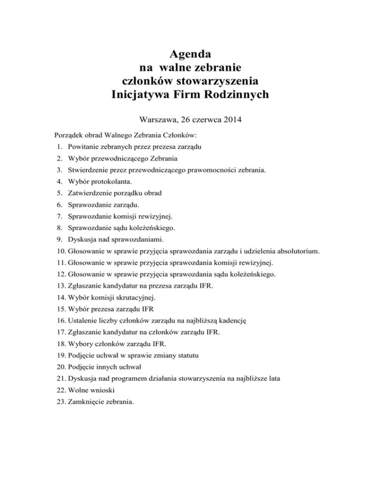 Agenda na walne zebranie członków stowarzyszenia Inicjatywa Firm Rodzinnych Warszawa, 26 czerwca 2014 Porządek obrad Walnego Zebrania Członków: 1. Powitanie zebranych przez prezesa zarządu 2. Wybór przewodniczącego Zebrania 3. Stwierdzenie przez przewodniczącego prawomocności zebrania. 4. Wybór protokolanta. 5. Zatwierdzenie porządku obrad 6. Sprawozdanie zarządu. 7. Sprawozdanie komisji rewizyjnej. 8. Sprawozdanie sądu koleżeńskiego. 9. Dyskusja nad sprawozdaniami. 10. Głosowanie w sprawie przyjęcia sprawozdania zarządu i udzielenia absolutorium. 11. Głosowanie w sprawie przyjęcia sprawozdania komisji rewizyjnej. 12. Głosowanie w sprawie przyjęcia sprawozdania sądu koleżeńskiego. 13. Zgłaszanie kandydatur na prezesa zarządu IFR. 14. Wybór komisji skrutacyjnej. 15. Wybór prezesa zarządu IFR 16. Ustalenie liczby członków zarządu na najbliższą kadencję 17. Zgłaszanie kandydatur na członków zarządu IFR. 18. Wybory członków zarządu IFR. 19. Podjęcie uchwał w sprawie zmiany statutu 20. Podjęcie innych uchwał 21. Dyskusja nad programem działania stowarzyszenia na najbliższe lata 22. Wolne wnioski 23. Zamknięcie zebrania.
