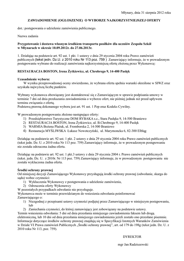 Młynary, dnia 31 sierpnia 2012 roku ZAWIADOMIENIE (OGŁOSZENIE) O WYBORZE NAJKORZYSTNIEJSZEJ OFERTY dot.: postępowania o udzielenie zamówienia publicznego. Nazwa zadania Przygotowanie i dostawa własnym środkiem transportu posiłków dla uczniów Zespołu Szkół w Młynarach w okresie 10.09.2012r. do 27.06.2013r. 1. Działając na podstawie art. 92 ust. 1 pkt. 1 ustawy z dnia 29 stycznia 2004 roku Prawo zamówień publicznych (tekst jedn. Dz.U. z 2010 roku Nr 113 poz. 759 ) Zamawiający informuje, że w prowadzonym postępowaniu wybrano do realizacji zamówienia najkorzystniejszą ofertę złożoną przez Wykonawcę: RESTAURACJA BOSTON, Irena Żytkiewicz, ul. Chrobrego 9, 14-400 Pasłęk Uzasadnienie wyboru: W wyniku przeprowadzonej oceny stwierdzono, że wybrana oferta spełnia warunki określone w SIWZ oraz uzyskała najwyższą liczbę punktów. Wybrany wykonawca obowiązany jest skontaktować się z Zamawiającym w sprawie podpisania umowy w terminie 7 dni od dnia przekazania zawiadomienia o wyborze ofert, nie później jednak niż przed upływem terminu związania z ofertą. Podstawą prawną dokonanego wyboru jest art. 91 ust. 1 Pzp oraz Kodeks Cywilny. W prowadzonym postępowaniu złożono następujące oferty: 1) Przedsiębiorstwo Turystyczne DOM RYBAKA s.c., Stara Pasłęka 9, 14-500 Braniewo 2) RESTAURACJA BOSTON, Irena Żytkiewicz, ul. B.Chrobrego 9, 14-400 Pasłęk 3) WARMIA Bożena Plażuk, ul. Fromborska 2, 14-500 Braniewo 4) Restauracja MYŚLIWSKA Łukasz Nowotczyński, ul. Marymoncka 6, 82-300 Elbląg Działając na podstawie art. 92 ust. 1 pkt. 2 ustawy z dnia 29 stycznia 2004 roku Prawo zamówień publicznych (tekst jedn. Dz. U. z 2010 roku Nr 113 poz. 759) Zamawiający informuje, że w prowadzonym postępowaniu nie została odrzucona żadna oferta. Działając na podstawie art. 92 ust. 1 pkt.3 ustawy z dnia 29 stycznia 2004 r. Prawo zamówień publicznych (tekst. jedn. Dz. U. z 2010r. Nr 113 poz. 759) Zamawiający informuje, że w prowadzonym postępowaniu nie została wykluczona żadna oferta. Środki ochrony prawnej Od niniejszej decyzji Zamawiającego Wykonawcy przysługują środki ochrony prawnej (odwołanie, skarga do sądu) wobec czynności: 1) Wykluczenia Wykonawcy z postępowania o udzielenie zamówienia, 2) Odrzucenia oferty Wykonawcy W pozostałych przypadkach odwołanie nie przysługuje. Wykonawca może w terminie przewidzianym do wniesienia odwołania poinformować Zamawiającego o: 1) Niezgodnej z przepisami ustawy czynności podjętej przez Zamawiającego w niniejszym postępowaniu, lub 2) Zaniechania czynności, do której zamawiający jest zobowiązany na podstawie ustawy. Termin wniesienia odwołania: 5 dni od dnia przesłania niniejszego zawiadomienia faksem lub drogą elektroniczną, lub 10 dni od dnia przesłania niniejszego zawiadomienia jeżeli zostało ono przesłane pisemnie. Informacje dotyczące środków ochrony prawnej znajdują się w Specyfikacji Istotnych Warunków Zamówienia w Dziale VI Prawa zamówień Publicznych „Środki ochrony prawnej”, art. od 179 do 198g (tekst jedn. Dz. U. z 2010 roku Nr 113, poz. 759). DYREKTOR mgr Jan Radziszewski