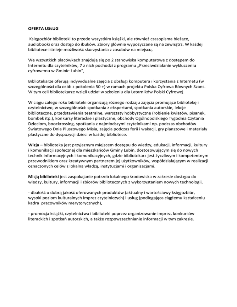 OFERTA USŁUG Księgozbiór biblioteki to przede wszystkim książki, ale również czasopisma bieżące, audiobooki oraz dostęp do ibuków. Zbiory głównie wypożyczane są na zewnątrz. W każdej bibliotece istnieje możliwość skorzystania z zasobów na miejscu, We wszystkich placówkach znajdują się po 2 stanowiska komputerowe z dostępem do Internetu dla czytelników, 7 z nich pochodzi z programu „Przeciwdziałanie wykluczeniu cyfrowemu w Gminie Lubin”, Bibliotekarze oferują indywidualne zajęcia z obsługi komputera i korzystania z Internetu (w szczególności dla osób z pokolenia 50 +) w ramach projektu Polska Cyfrowa Równych Szans. W tym celi bibliotekarze wzięli udział w szkoleniu dla Latarników Polski Cyfrowej. W ciągu całego roku biblioteki organizują różnego rodzaju zajęcia promujące bibliotekę i czytelnictwo, w szczególności: spotkania z ekspertami, spotkania autorskie, lekcje biblioteczne, przedstawienia teatralne, warsztaty hobbystyczne (robienie kwiatów, pisanek, bombek itp.), konkursy literackie i plastyczne, obchody Ogólnopolskiego Tygodnia Czytania Dzieciom, boockrossing, spotkania z najmłodszymi czytelnikami np. podczas obchodów Światowego Dnia Pluszowego Misia, zajęcia podczas ferii i wakacji, gry planszowe i materiały plastyczne do dyspozycji dzieci w każdej bibliotece. Wizja – biblioteka jest przyjaznym miejscem dostępu do wiedzy, edukacji, informacji, kultury i komunikacji społecznej dla mieszkańców Gminy Lubin, dostosowującym się do nowych technik informacyjnych i komunikacyjnych, gdzie bibliotekarz jest życzliwym i kompetentnym przewodnikiem oraz kreatywnym partnerem jej użytkowników, współdziałającym w realizacji oznaczonych celów z lokalną władzą, instytucjami i organizacjami. Misją biblioteki jest zaspokajanie potrzeb lokalnego środowiska w zakresie dostępu do wiedzy, kultury, informacji i zbiorów bibliotecznych z wykorzystaniem nowych technologii, - dbałość o dobrą jakość oferowanych produktów (aktualny i wartościowy księgozbiór, wysoki poziom kulturalnych imprez czytelniczych) i usług (podlegająca ciągłemu kształceniu kadra pracowników merytorycznych), - promocja książki, czytelnictwa i biblioteki poprzez organizowanie imprez, konkursów literackich i spotkań autorskich, a także rozpowszechnianie informacji w tym zakresie.