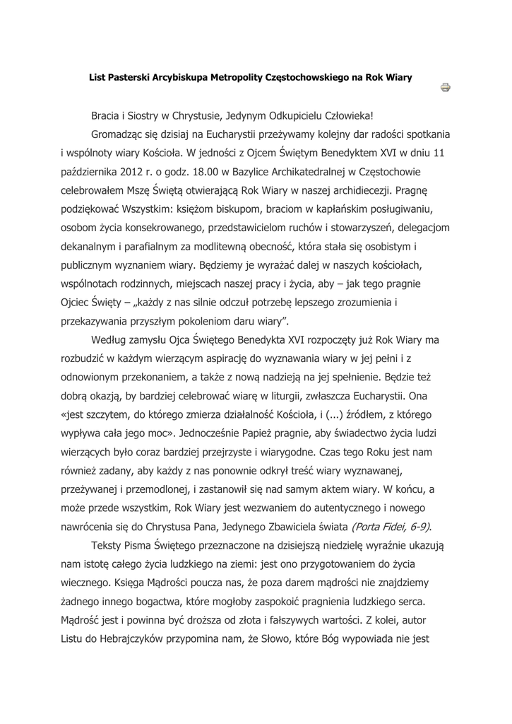 List Pasterski Arcybiskupa Metropolity Częstochowskiego na Rok Wiary Bracia i Siostry w Chrystusie, Jedynym Odkupicielu Człowieka! Gromadząc się dzisiaj na Eucharystii przeżywamy kolejny dar radości spotkania i wspólnoty wiary Kościoła. W jedności z Ojcem Świętym Benedyktem XVI w dniu 11 października 2012 r. o godz. 18.00 w Bazylice Archikatedralnej w Częstochowie celebrowałem Mszę Świętą otwierającą Rok Wiary w naszej archidiecezji. Pragnę podziękować Wszystkim: księżom biskupom, braciom w kapłańskim posługiwaniu, osobom życia konsekrowanego, przedstawicielom ruchów i stowarzyszeń, delegacjom dekanalnym i parafialnym za modlitewną obecność, która stała się osobistym i publicznym wyznaniem wiary. Będziemy je wyrażać dalej w naszych kościołach, wspólnotach rodzinnych, miejscach naszej pracy i życia, aby – jak tego pragnie Ojciec Święty – „każdy z nas silnie odczuł potrzebę lepszego zrozumienia i przekazywania przyszłym pokoleniom daru wiary”. Według zamysłu Ojca Świętego Benedykta XVI rozpoczęty już Rok Wiary ma rozbudzić w każdym wierzącym aspirację do wyznawania wiary w jej pełni i z odnowionym przekonaniem, a także z nową nadzieją na jej spełnienie. Będzie też dobrą okazją, by bardziej celebrować wiarę w liturgii, zwłaszcza Eucharystii. Ona «jest szczytem, do którego zmierza działalność Kościoła, i (...) źródłem, z którego wypływa cała jego moc». Jednocześnie Papież pragnie, aby świadectwo życia ludzi wierzących było coraz bardziej przejrzyste i wiarygodne. Czas tego Roku jest nam również zadany, aby każdy z nas ponownie odkrył treść wiary wyznawanej, przeżywanej i przemodlonej, i zastanowił się nad samym aktem wiary. W końcu, a może przede wszystkim, Rok Wiary jest wezwaniem do autentycznego i nowego nawrócenia się do Chrystusa Pana, Jedynego Zbawiciela świata (Porta Fidei, 6-9). Teksty Pisma Świętego przeznaczone na dzisiejszą niedzielę wyraźnie ukazują nam istotę całego życia ludzkiego na ziemi: jest ono przygotowaniem do życia wiecznego. Księga Mądrości poucza nas, że poza darem mądrości nie znajdziemy żadnego innego bogactwa, które mogłoby zaspokoić pragnienia ludzkiego serca. Mądrość jest i powinna być droższa od złota i fałszywych wartości. Z kolei, autor Listu do Hebrajczyków przypomina nam, że Słowo, które Bóg wypowiada nie jest martwą literą, ani zapisem odległej historii. Jest ono zawsze aktualne, żywe, skuteczne i przenikające aż do rozdzielenia duszy i ciała, dane by osądzić pragnienia i myśli serca. To ono prowadzi nas do nawrócenia i do większej niż dotychczas gorliwości i życia zgodnego z Ewangelią. W dzisiejszej Ewangelii św. Marek kreśli przed nami scenę spotkania Jezusa z pewnym człowiekiem, który upadłszy przed Nim na kolana zadaje jedno z najważniejszych pytań ludzkiej egzystencji: „Nauczycielu dobry, co mam czynić, aby osiągnąć życie wieczne?” Gest zgiętych kolan zdaje się sugerować, że ów człowiek uznaje w Jezusie Kogoś wyjątkowego. Potwierdzają to słowa „Nauczycielu dobry”, a więc w jakimś sensie on wierzy już w Jezusa i Jego posłannictwo. Odpowiedź Jezusa jest zdecydowana: nie wystarczy zwykłe przestrzeganie Prawa Bożego: nie zabijałem, nie kradłem – by usprawiedliwić swoją mierność. Spotykamy już nawet w naszej polskiej rzeczywistości podobne deklaracje ateistów na bilbordach: „nie zabijam, nie kradnę, nie wierzę”. Człowiek z dzisiejszej Ewangelii, choć od swojej młodości strzegł Bożych przykazań, odchodzi ostatecznie zasmucony. Przywiązany do bogactw i dóbr tego świata, nie był w stanie do końca zawierzyć Chrystusowi i pójść za Jego słowem. Czyż nieraz nie czujemy się do niego podobni ? Wielu naszych braci i sióstr, nawet osoby z najbliższej rodziny, decyduje się porzucić dar wiary otrzymany na chrzcie świętym i odchodzi od Jezusa oraz Jego Kościoła z powodu ułudy bogactwa, trosk doczesnych czy też prześladowań. Nie możemy być spokojni i bezczynni wobec tych aktów apostazji. Wobec odejścia, kryzysu wiary wielu chrześcijan i ataków pogańskiego świata, nie możemy - jak mówi Benedykt XVI - zgodzić się na to, aby sól wiary utraciła swój smak, a światło było umieszczone pod korcem (por. Mt 5, 13-16). Nie możemy dopuścić do tego, aby zabrakło naszego odważnego głoszenia prawdy o Jezusie i dawania o Nim wiarygodnego świadectwa. Musimy zatem z odnowionym zapałem karmić się Słowem Bożym, wiernie przekazywanym przez Kościół, i Chlebem życia, danymi jako wsparcie tym, którzy są Jego uczniami (por. J 6, 51) (Porta Fidei, 3). Już dzisiaj, po przekroczeniu progu Roku Wiary, każdy z nas musi stanąć w prawdzie i zapytać siebie samego o osobiste związanie z Chrystusem. Czy nasza wiara jest na tyle dojrzała i silna, abyśmy z radością i entuzjazmem podejmowali dzieło nowej ewangelizacji? Błogosławiony Jan Paweł II wskazywał, iż „czas, w którym przyszło nam żyć, nadal naznaczony jest zapomnieniem i głuchotą wobec Boga”. Dlatego trzeba nam na nowo odkryć, że chrześcijaństwo w swej istocie polega na wierze w Boga Ojca i Syna i Ducha Świętego oraz na indywidualnym i wspólnotowym spotkaniu z Chrystusem, który ukierunkowuje i prowadzi nasze życie. W zadaniach Roku Wiary, kolejny następca św. Piotra, Benedykt XVI kładzie nacisk na dwie kwestie. Po pierwsze, by spojrzenie Kościoła skoncentrowane było na Jezusie Chrystusie, a nie na naszych ludzkich planach. Po drugie, by przypomnieć każdemu z nas, że wiara ma konkretną treść. Nie jest jakąś emocją czy odczuciem, którym każdy mógłby nadać takie znaczenie, jakie by mu pasowało. Zawsze bowiem jest to wiara Kościoła, który z woli Chrystusa jest „stróżem i filarem prawdy”. Jaki więc mamy program na ten Rok Wiary? Odpowiadając na to pytanie, za bł. Janem Pawłem II, chciałoby się najpierw pow