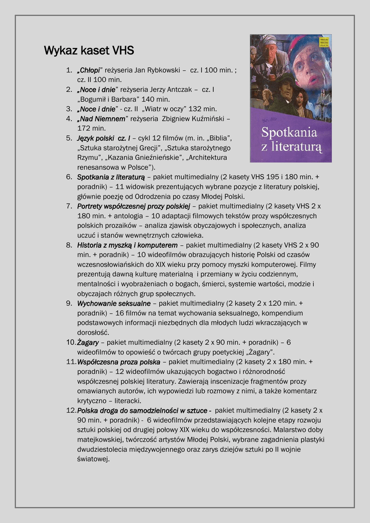Wykaz kaset VHS 1. „Chłopi” reżyseria Jan Rybkowski – cz. I 100 min. ; cz. II 100 min. 2. „Noce i dnie” reżyseria Jerzy Antczak – cz. I „Bogumił i Barbara” 140 min. 3. „Noce i dnie” - cz. II „Wiatr w oczy” 132 min. 4. „Nad Niemnem” reżyseria Zbigniew Kuźmiński – 172 min. 5. Język polski cz. I – cykl 12 filmów (m. in. „Biblia”, „Sztuka starożytnej Grecji”, „Sztuka starożytnego Rzymu”, „Kazania Gnieźnieńskie”, „Architektura renesansowa w Polsce”). 6. Spotkania z literaturą – pakiet multimedialny (2 kasety VHS 195 i 180 min. + poradnik) – 11 widowisk prezentujących wybrane pozycje z literatury polskiej, głównie poezję od Odrodzenia po czasy Młodej Polski. 7. Portrety współczesnej prozy polskiej – pakiet multimedialny (2 kasety VHS 2 x 180 min. + antologia – 10 adaptacji filmowych tekstów prozy współczesnych polskich prozaików – analiza zjawisk obyczajowych i społecznych, analiza uczuć i stanów wewnętrznych człowieka. 8. Historia z myszką i komputerem – pakiet multimedialny (2 kasety VHS 2 x 90 min. + poradnik) – 10 wideofilmów obrazujących historię Polski od czasów wczesnosłowiańskich do XIX wieku przy pomocy myszki komputerowej. Filmy prezentują dawną kulturę materialną i przemiany w życiu codziennym, mentalności i wyobrażeniach o bogach, śmierci, systemie wartości, modzie i obyczajach różnych grup społecznych. 9. Wychowanie seksualne – pakiet multimedialny (2 kasety 2 x 120 min. + poradnik) – 16 filmów na temat wychowania seksualnego, kompendium podstawowych informacji niezbędnych dla młodych ludzi wkraczających w dorosłość. 10. Żagary – pakiet multimedialny (2 kasety 2 x 90 min. + poradnik) – 6 wideofilmów to opowieść o twórcach grupy poetyckiej „Żagary”. 11. Współczesna proza polska – pakiet multimedialny (2 kasety 2 x 180 min. + poradnik) – 12 wideofilmów ukazujących bogactwo i różnorodność współczesnej polskiej literatury. Zawierają inscenizacje fragmentów prozy omawianych autorów, ich wypowiedzi lub rozmowy z nimi, a także komentarz krytyczno – literacki. 12. Polska droga do samodzielności w sztuce - pakiet multimedialny (2 kasety 2 x 90 min. + poradnik) - 6 wideofilmów przedstawiających kolejne etapy rozwoju sztuki polskiej od drugiej połowy XIX wieku do współczesności. Malarstwo doby matejkowskiej, twórczość artystów Młodej Polski, wybrane zagadnienia plastyki dwudziestolecia międzywojennego oraz zarys dziejów sztuki po II wojnie światowej. 13. Sztuka przekonywania Jak zostać dobrym mówcą? – pakiet multimedialny (2 kasety 2 x 75 min. + poradnik) – 10 wideofilmów, w których autorzy przekonują, że każdy może zostać dobrym mówcą i uczą, jak dojść do perfekcji w tym względzie. 14. Bajki nie tylko dla dzieci głuchych – pakiet multimedialny (2 kasety 2 x 90 min. + poradnik) – 8 eksperymentalnych propozycji programowych zawierających oprócz ciekawej formy edukacyjnej elementy integrujące środowisko dzieci słyszących z niesłyszącymi. 15. Sarmacja czyli Polska – pakiet multimedialny (2 kasety 80 i 40 min. + poradnik) – 3 wideofilmy próbujące ukazać główne aspekty sarmackiego modelu życia: wolności politycznej, religijności i rodzinnego domu. 16. Małżeństwo doskonałe – pakiet multimedialny (2 kasety 2 x 120 min. + poradnik)– 16 wideofilmów 17. Kultura duchowa narodu – pakiet multimedialny 2 kasety 2 x 120 min. + poradnik) – 4 wideofilmy przedstawiające twórców , którzy wyraźnie zaznaczyli swoją obecność w dziejach kultury polskiej w różnych jej okresach. 18. Pierwsze kroki pod koszem – pakiet multimedialny (2 kasety 2 x75 min. + poradnik) – 12 wideofilmów wprowadzających krok po kroku w tajniki opanowywania sztuki gry w koszykówkę. 19. Potęga smaku – Zbigniew Herbert – pakiet multimedialny (2 kasety 90 i 180 min. + poradnik) – 3 wideofilmy kreślą sylwetkę jednego z najwybitniejszych polskich poetów, analizując dzieje życia. 20. Polskie pisma literackie – pakiet multimedialny (2 kasety 2 x 60 min. + poradnik) – 6 wideofilmów przybliżających sześć pism literackich, które po drugiej wojnie światowej pełniły ważną rolę kulturotwórczą. 21. Spotkania z literaturą – pakiet multimedialny (2 kasety 85 i 130 min. + poradnik) – 8 wideofilmów będących prezentacją twórczości wybitnych poetów, od symbolizmu do współczesności. 22. Dzieci i rodzice. Jak szukać porozumienia? – 1 kaseta 13 min. + broszurka – film prezentuje konflikty typowe dla poszczególnych etapów relacji rodzic – dziecko, jak również sposoby ich rozwiązywania. 23. Historia obyczaju (dwór polski, dom, chata) – pakiet multimedialny (2 kasety 2 x 90 min. + poradnik) – 9 wideofilmów prezentujących najbardziej charakterystyczne dla przedstawionego środowiska obyczaje. 24. Konwencje teatralne – pakiet multimedialny (2 kasety 2 x 90 min. + poradnik) – 8 wideofilmów prezentujących: powstanie i rozwój teatru antycznego, teatr średniowieczny, teatr nowożytny, inscenizację romantyczną i kierunki rozwoju teatru w XX wieku. 25. Opowieści bałtyckie – pakiet multimedialny – (2 kasety 2 x 90 min. + poradnik) – 9 wideofilmów układających się w opowieść o Morzu Bałtyckim, jego odrębnościach, historii i związkach człowieka z morzem. 26. Łyk matematyki – pakiet multimedialny – (2 kasety 2 x 120 min + poradnik) – 16 wideofilmów obrazujących matematykę poprzez ciekawostki, niekonwencjonalne sposoby rozwiązywania problemów, anegdoty, oryginalne skojarzenia myślowe. 27. Czym jest… - pakiet multimedialny (2 kasety 2 x 125 min. + poradnik) – 10 wideofilmów w atrakcyjnej formie widowisk, które prezentują dawne i współczesne definicje takich pojęć, jak materia, grawitacja… Pojawiają się też wielkie postacie nauki m in. Izaak Newton, Albert Einstein. 28. Tu jest Ojczyzna – pakiet multimedialny –