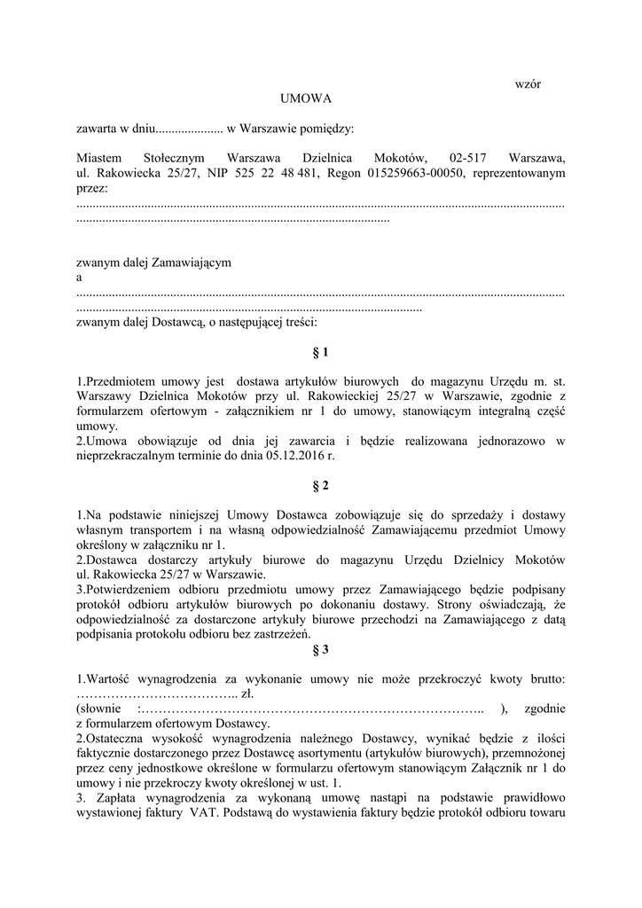 wzór UMOWA zawarta w dniu..................... w Warszawie pomiędzy: Miastem Stołecznym Warszawa Dzielnica Mokotów, 02-517 Warszawa, ul. Rakowiecka 25/27, NIP 525 22 48 481, Regon 015259663-00050, reprezentowanym przez: ....................................................................................................................................................... ................................................................................................. zwanym dalej Zamawiającym a ....................................................................................................................................................... ........................................................................................................... zwanym dalej Dostawcą, o następującej treści: §1 1.Przedmiotem umowy jest dostawa artykułów biurowych do magazynu Urzędu m. st. Warszawy Dzielnica Mokotów przy ul. Rakowieckiej 25/27 w Warszawie, zgodnie z formularzem ofertowym - załącznikiem nr 1 do umowy, stanowiącym integralną część umowy. 2.Umowa obowiązuje od dnia jej zawarcia i będzie realizowana jednorazowo w nieprzekraczalnym terminie do dnia 05.12.2016 r. §2 1.Na podstawie niniejszej Umowy Dostawca zobowiązuje się do sprzedaży i dostawy własnym transportem i na własną odpowiedzialność Zamawiającemu przedmiot Umowy określony w załączniku nr 1. 2.Dostawca dostarczy artykuły biurowe do magazynu Urzędu Dzielnicy Mokotów ul. Rakowiecka 25/27 w Warszawie. 3.Potwierdzeniem odbioru przedmiotu umowy przez Zamawiającego będzie podpisany protokół odbioru artykułów biurowych po dokonaniu dostawy. Strony oświadczają, że odpowiedzialność za dostarczone artykuły biurowe przechodzi na Zamawiającego z datą podpisania protokołu odbioru bez zastrzeżeń. §3 1.Wartość wynagrodzenia za wykonanie umowy nie może przekroczyć kwoty brutto: ……………………………….. zł. (słownie :…………………………………………………………………….. ), zgodnie z formularzem ofertowym Dostawcy. 2.Ostateczna wysokość wynagrodzenia należnego Dostawcy, wynikać będzie z ilości faktycznie dostarczonego przez Dostawcę asortymentu (artykułów biurowych), przemnożonej przez ceny jednostkowe określone w formularzu ofertowym stanowiącym Załącznik nr 1 do umowy i nie przekroczy kwoty określonej w ust. 1. 3. Zapłata wynagrodzenia za wykonaną umowę nastąpi na podstawie prawidłowo wystawionej faktury VAT. Podstawą do wystawienia faktury będzie protokół odbioru towaru bez zastrzeżeń, przez przedstawiciela Wydziału Administracyjno-Gospodarczego dla Dzielnicy Mokotów. Płatność nastąpi przelewem w terminie 21 dni od daty otrzymania przez Zamawiającego faktury, na konto bankowe prowadzone w …………………………………… nr………………………………………………… 4.Zmiana nr rachunku bankowego Dostawcy nie wymaga zmiany umowy. Dostawca zobowiązany jest o takiej zmianie powiadomić na piśmie Zamawiającego. 5.Za dzień zapłaty uznaje się dzień obciążenia rachunku Zamawiającego poleceniem zapłaty. 6.Za artykuły biurowe niedostarczone przez Dostawcę, wynagrodzenie nie przysługuje. Dostawcy nie przysługuje jakiekolwiek roszczenie z tytułu niewykorzystania w całości maksymalnego wynagrodzenia określonego w ust. 1. 7.Faktura VAT będzie wystawiona w następujący sposób: 1) Nabywca: Miasto Stołeczne Warszawa, 00-950 Warszawa, Pl. Bankowy 3/5, NIP 525-22-48-481, a dostarczona do: 2) Odbiorca (płatnik): Urząd Miasta Stołecznego Warszawy Dzielnica Mokotów, 02-517 Warszawa, ul. Rakowiecka 25/27. §4 1.Dostawca udziela 12 miesięcznej gwarancji na dostarczone Zamawiającemu artykuły biurowe , liczonej od daty odbioru przedmiotu umowy bez zastrzeżeń przez przedstawiciela Zamawiającego. 2. Dostawca jest odpowiedzialny względem Zamawiającego, jeżeli przedmiot umowy ma wadę zmniejszającą jego wartość ze względu na cel oznaczony w umowie albo wynikający z okoliczności lub z przeznaczenia, jeżeli przedmiot umowy nie ma właściwości, o których istnieniu Dostawca zapewnił Zamawiającego, albo jeżeli przedmiot umowy został wydany Zamawiającemu w stanie niezupełnym. 3. Jeżeli Zamawiający stwierdzi, że zakupione artykuły biurowe są wadliwe , zobowiązuje się niezwłocznie, mailowo lub faksem, poinformować o tym fakcie Dostawcę. Dostawca zobowiązuje się do gwarancyjnej wymiany przedmiotu umowy na nowy, wolny od wad, w terminie 5 dni roboczych od chwili zgłoszenia wadliwego towaru przez Zamawiającego. Wymiana nastąpi w siedzibie Zamawiającego na koszt i ryzyko Dostawcy. 4.W przypadku wymiany artykułów biurowych na nowe, wolne od wad, okres 12 miesięcznej gwarancji biegnie na nowo, licząc od daty jego odbioru przez przedstawiciela Zamawiającego. 5. Jeżeli uszkodzenie przedmiotu umowy nastąpiło w czasie trwania transportu, odpowiedzialność za wynikłe szkody ponosi Dostawca. §5 1.W przypadku nie wykonania przedmiotu umowy w terminie określonym §1ust.2 Zamawiający naliczy kary umowne w wysokości 0,2% wartości brutto przedmiotu umowy wynikającej z postanowień §1ust.1 za każdy rozpoczęty dzień zwłoki. 2.W przypadku odstąpienia od umowy z winy Dostawcy, zapłaci on Zamawiającemu karę umowną w wysokości 20% wartości umowy brutto określonej w § 3 ust. 1. 3.Naliczenie kar umownych nie upoważnia Dostawcy do pomniejszenia wartości wystawionej faktury o ich wysokość. 4.Dostawca, w przypadku odstąpienia od umowy z własnej winy nie będzie obciążał Zamawiającego kosztami wynikającymi z niezrealizowanej części umowy. 5.Dostawca wyraża zgodę na potrącenie kar z należnego mu wynagrodzenia. 6.Zamawiający może dochodzić od Dostawcy odszkodowania uzupełniającego za poniesioną szkodę przekraczającą wysokość naliczonych kar umownych, na zasadach ogólnych przewidzianych w kodeksie cywilnym. §6 1.Zamawiający może 