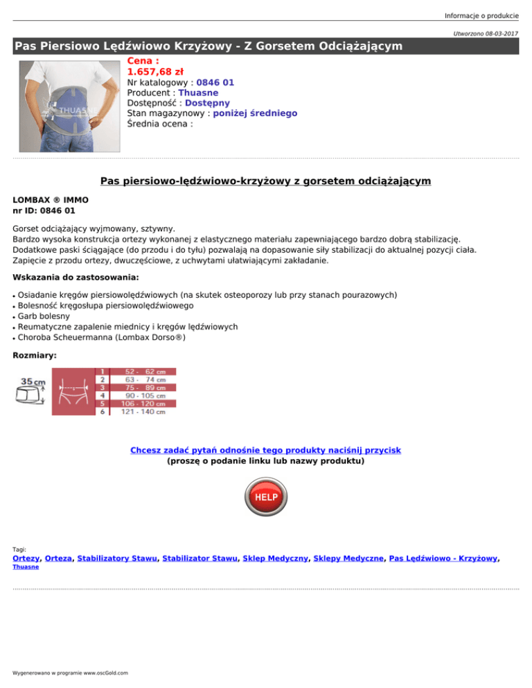 Informacje o produkcie Utworzono 08-03-2017 Pas Piersiowo Lędźwiowo Krzyżowy - Z Gorsetem Odciążającym Cena : 1.657,68 zł Nr katalogowy : 0846 01 Producent : Thuasne Dostępność : Dostępny Stan magazynowy : poniżej średniego Średnia ocena : Pas piersiowo-lędźwiowo-krzyżowy z gorsetem odciążającym LOMBAX ® IMMO nr ID: 0846 01 Gorset odciążający wyjmowany, sztywny. Bardzo wysoka konstrukcja ortezy wykonanej z elastycznego materiału zapewniającego bardzo dobrą stabilizację. Dodatkowe paski ściągające (do przodu i do tyłu) pozwalają na dopasowanie siły stabilizacji do aktualnej pozycji ciała. Zapięcie z przodu ortezy, dwuczęściowe, z uchwytami ułatwiającymi zakładanie. Wskazania do zastosowania: ● ● ● ● ● Osiadanie kręgów piersiowolędźwiowych (na skutek osteoporozy lub przy stanach pourazowych) Bolesność kręgosłupa piersiowolędźwiowego Garb bolesny Reumatyczne zapalenie miednicy i kręgów lędźwiowych Choroba Scheuermanna (Lombax Dorso®) Rozmiary: Chcesz zadać pytań odnośnie tego produkty naciśnij przycisk (proszę o podanie linku lub nazwy produktu) Tagi: Ortezy, Orteza, Stabilizatory Stawu, Stabilizator Stawu, Sklep Medyczny, Sklepy Medyczne, Pas Lędźwiowo - Krzyżowy, Thuasne Wygenerowano w programie www.oscGold.com