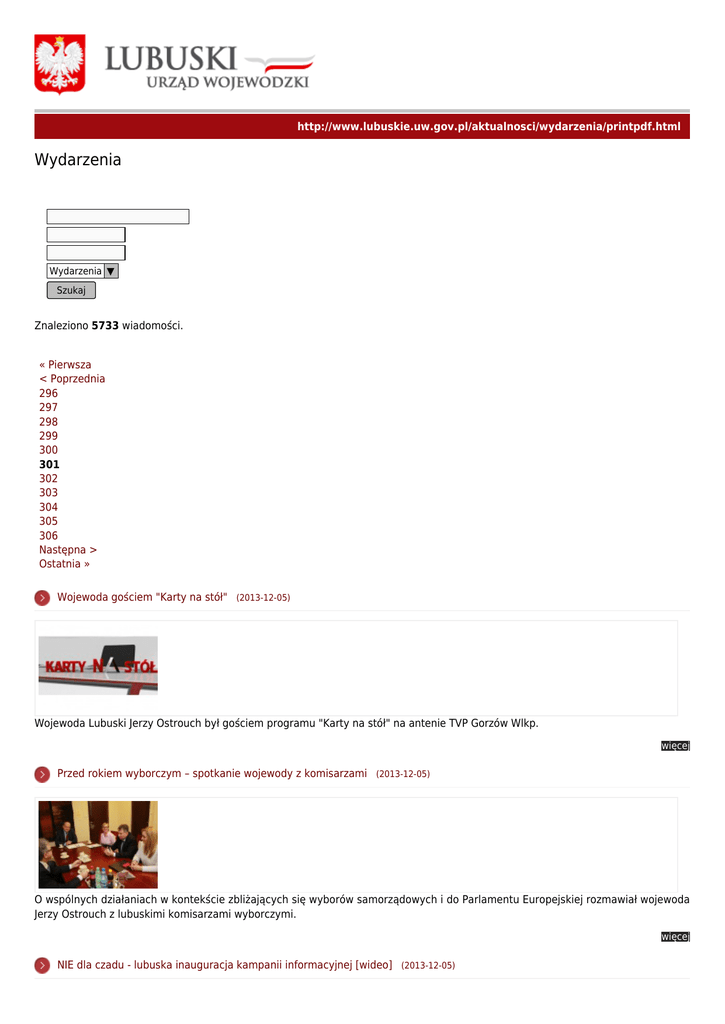 http://www.lubuskie.uw.gov.pl/aktualnosci/wydarzenia/printpdf.html Wydarzenia Wydarzenia ▼ Szukaj Znaleziono 5733 wiadomości. « Pierwsza < Poprzednia 296 297 298 299 300 301 302 303 304 305 306 Następna > Ostatnia » Wojewoda gościem "Karty na stół" (2013-12-05) Wojewoda Lubuski Jerzy Ostrouch był gościem programu "Karty na stół" na antenie TVP Gorzów Wlkp. więcej Przed rokiem wyborczym – spotkanie wojewody z komisarzami (2013-12-05) O wspólnych działaniach w kontekście zbliżających się wyborów samorządowych i do Parlamentu Europejskiej rozmawiał wojewoda Jerzy Ostrouch z lubuskimi komisarzami wyborczymi. więcej NIE dla czadu - lubuska inauguracja kampanii informacyjnej [wideo] (2013-12-05) Nie dla czadu - kampanię informacyjno-edukacyjną pod takim hasłem zainaugurowano w Lubuskiem. Honorowy patronat nad nią sprawuje wojewoda Jerzy Ostrouch. więcej Stan sanitarny pod kontrolą (2013-12-04) Kontrole lubuskich wodociągów oraz typowe dla okresu zimowego zagrożenia epidemiologiczne. Wojewódzki Inspektor Sanitarny Dorota Konaszczuk przekazała najważniejsze informacje Wojewodzie więcej Rozwój przedsiębiorczości w Lubuskiem (2013-12-04) O możliwościach inwestycyjnych w Lubuskiem, ze szczególnym uwzględnieniem okolic Krosna Odrzańskiego rozmawiał wojewoda lubuski Jerzy Ostrouch z burmistrzem miasta Markiem Cebulą. więcej Ponad 100 najlepszych uczniów w Lubuskiem [wideo] (2013-12-04) W środę, 4 grudnia br. wojewoda Jerzy Ostrouch wręczy uczniom z Lubuskiego stypendia Prezesa Rady Ministrów i Ministra Edukacji Narodowej na rok szkolny 2013/2014. więcej Kontakt z Wydziałem SOCiC (2013-12-04) W dniach 4-5 grudnia br. utrudniony jest kontakt z pracownikami Wydziału Spraw Obywatelskich, Cudzoziemców i Cyfryzacji w LUW. Powód: przenosimy wydziału z IX na V piętro w budynku. więcej Lubuska „Barbórka” (2013-12-04) Dziś obchodzimy Dzień Górnika. Wojewoda Lubuski Jerzy Ostrouch składa górnikom życzenia zdrowia, satysfakcji z pracy i pomyślności na następny rok. więcej Wały w Słubicach - Wojewoda odwiesza postępowanie (2013-12-04) Wojewoda Lubuski, na wniosek burmistrza Miasta Słubice postanowił podjąć zawieszone postępowanie dotyczące rozbudowy wałów przeciwpowodziowych w Słubicach oraz budowy nowego zabezpieczenia. więcej Biblioteka coraz bardziej nowoczesna (2013-12-03) Propozycja objęcia przez Wojewodę patronatu nad XX edycją konkursu Lubuski Wawrzyn Literacki 2014 oraz zaawansowana cyfryzacja w procesach bibliotecznych to wiodące tematy dzisiejszego spotkania przedstawicieli Wojewódzkiej i Miejskiej Biblioteki Publicznej im. Cypriana K. Norwida - dyrektora Andrzeja Bucka oraz dr. Przemysława Bartkowiaka z Wojewodą Jerzym Ostrouchem. więcej « Pierwsza < Poprzednia 296 297 298 299 300 301 302 303 304 305 306 Następna > Ostatnia »