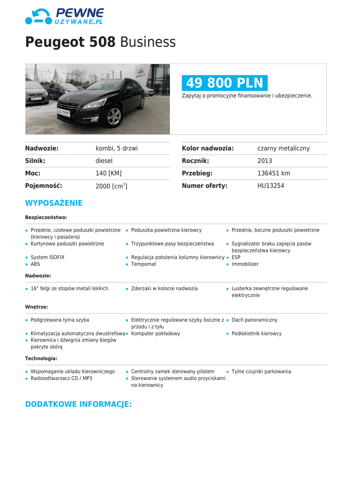 Peugeot 508 Business 49 800 PLN Zapytaj o promocyjne finansowanie i ubezpieczenie. Nadwozie: kombi, 5 drzwi Kolor nadwozia: czarny metaliczny Silnik: diesel Rocznik: 2013 Moc: 140 [KM] Przebieg: 136451 km Pojemność: 2000 [cm ] Numer oferty: HU13254 3 WYPOSAŻENIE Bezpieczeństwo: Przednie, czołowe poduszki powietrzne (kierowcy i pasażera) Kurtynowe poduszki powietrzne Poduszka powietrzna kierowcy Przednie, boczne poduszki powietrzne Trzypunktowe pasy bezpieczeństwa System ISOFIX ABS Regulacja położenia kolumny kierownicy Tempomat Sygnalizator braku zapięcia pasów bezpieczeństwa kierowcy ESP Immobilizer Nadwozie: 16" felgi ze stopów metali lekkich Zderzaki w kolorze nadwozia Lusterka zewnętrzne regulowane elektrycznie Elektrycznie regulowane szyby boczne z przodu i z tyłu Komputer pokładowy Dach panoramiczny Centralny zamek sterowany pilotem Sterowanie systemem audio przyciskami na kierownicy Tylne czujniki parkowania Wnętrze: Podgrzewana tylna szyba Klimatyzacja automatyczna dwustrefowa Kierownica i dźwignia zmiany biegów pokryte skórą Podłokietnik kierowcy Technologia: Wspomaganie układu kierowniczego Radioodtwarzacz CD / MP3 DODATKOWE INFORMACJE: Peugeot 508 Business Sprzedajemy tylkopewne samochody używane, stan techniczny weryfikujemy w naszymautoryzowanym serwisie Ford / Nissan / Suzuki / Hyundai / Seat Możliwośćzakupu dodatkowej gwarancji : Wariant STANDARD Wariant COMFORT Finansowanie -Możliwość finansowania pojazdu poprzez kredyt lub leasing Ubezpieczenia -Pakiety dealerskie ubezpieczeń komunikacyjnych Zapraszamy dosalonu! SALON CZYNNY ODPONIEDZIAŁKU DO PIĄTKU 9-19 W SOBOTY 10-15 Pewne Używane Kraków Jasnogórska 60 ul. Jasnogórska 60, tel.:12 662 00 02 www.blog.pgd.pl Nota prawna Dane zawarte w niniejszej propozycji handlowej mają wyłącznie charakter informacyjny. Podane informacje nie stanowią oferty ani zapewnienia, w szczególności w rozumieniu art. 66 § 1 oraz art. 5561 Kodeksu cywilnego. Wiążące ustalenie ceny, wyposażenia oraz specyfikacji samochodu następuje w pisemnej umowie sprzedaży/zamówienia samochodu. Ze względu na ograniczenia techniczne (np. odwzorowanie kolorów przez monitor lub sposób wydruku), kolory przedstawione w niniejszej propozycji handlowej mogą się różnić od rzeczywistych kolorów nadwozia i tapicerki. Niniejsza propozycja handlowa oraz wszelkie załączniki z nią związane są poufne i nie mogą być przekazywane osobom trzecim. Prezentowane zdjęcia mogą zawierać wyposażenie opcjonalne (akcesoryjne), dodatkowo płatne. Warunki oferty maja charakter orientacyjny i mogą zostać zmienione w momencie uaktualnienia cen lub warunków promocji.