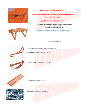 Kompletna ława kominiarska z nowym wzmocnionym wspornikiem uniwersalnym jednoelementowym - podklejonym poliuretanem - prosty montaż nie wymagający stosowania dodatkowej łaty nośnej do dachówek ceramicznych i cementowych Zawartość zestawu: • wspornik uniwersalny jednoelementowy z podklejony poliuretanem – 2 szt. • mocownik ławy (kołyska) – 2 szt. • ława kominiarska – 1 szt. • komplet śrub montażowych Montaż ławy kominiarskiej 1) Montaż wsporników ławy kominiarskiej ze wspornikiem 1 elementowym – wzmocnionym Aby uzyskać jednolitą powierzchnię dachówek należy usunąć (szlifierką lub młotkiem) · zamek dolny w przypadku dachówki cementowej · zamek górny w przypadku dachówki ceramicznej. Nasunąć wspornik na dachówkę jednocześnie zahaczając go o łatę nośną. Przykręcić wspornik od góry do łaty nośnej dołączonym wkrętem. Ułożyć pozostałe dachówki. 2) Do zamontowanych wsporników przymocować mocownik (kołyskę) wraz z ławą – wypoziomować (do odpowiedniego konta dachu) i dokręcić śruby montażowe. Źródło Firma IVT oraz MDM Opracowanie Firma IZOBUD