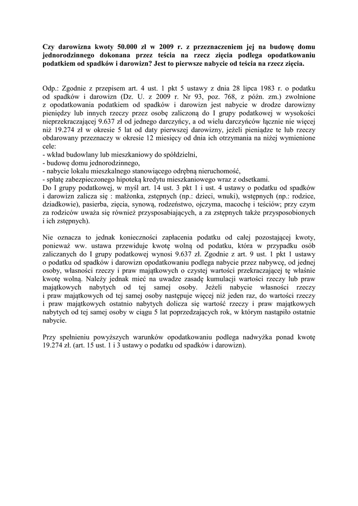 Czy darowizna kwoty 50.000 zł w 2009 r. z przeznaczeniem jej na budowę domu jednorodzinnego dokonana przez teścia na rzecz zięcia podlega opodatkowaniu podatkiem od spadków i darowizn? Jest to pierwsze nabycie od teścia na rzecz zięcia. Odp.: Zgodnie z przepisem art. 4 ust. 1 pkt 5 ustawy z dnia 28 lipca 1983 r. o podatku od spadków i darowizn (Dz. U. z 2009 r. Nr 93, poz. 768, z późn. zm.) zwolnione z opodatkowania podatkiem od spadków i darowizn jest nabycie w drodze darowizny pieniędzy lub innych rzeczy przez osobę zaliczoną do I grupy podatkowej w wysokości nieprzekraczającej 9.637 zł od jednego darczyńcy, a od wielu darczyńców łącznie nie więcej niż 19.274 zł w okresie 5 lat od daty pierwszej darowizny, jeżeli pieniądze te lub rzeczy obdarowany przeznaczy w okresie 12 miesięcy od dnia ich otrzymania na niżej wymienione cele: - wkład budowlany lub mieszkaniowy do spółdzielni, - budowę domu jednorodzinnego, - nabycie lokalu mieszkalnego stanowiącego odrębną nieruchomość, - spłatę zabezpieczonego hipoteką kredytu mieszkaniowego wraz z odsetkami. Do I grupy podatkowej, w myśl art. 14 ust. 3 pkt 1 i ust. 4 ustawy o podatku od spadków i darowizn zalicza się : małżonka, zstępnych (np.: dzieci, wnuki), wstępnych (np.: rodzice, dziadkowie), pasierba, zięcia, synową, rodzeństwo, ojczyma, macochę i teściów; przy czym za rodziców uważa się również przysposabiających, a za zstępnych także przysposobionych i ich zstępnych). Nie oznacza to jednak konieczności zapłacenia podatku od całej pozostającej kwoty, ponieważ ww. ustawa przewiduje kwotę wolną od podatku, która w przypadku osób zaliczanych do I grupy podatkowej wynosi 9.637 zł. Zgodnie z art. 9 ust. 1 pkt 1 ustawy o podatku od spadków i darowizn opodatkowaniu podlega nabycie przez nabywcę, od jednej osoby, własności rzeczy i praw majątkowych o czystej wartości przekraczającej tę właśnie kwotę wolną. Należy jednak mieć na uwadze zasadę kumulacji wartości rzeczy lub praw majątkowych nabytych od tej samej osoby. Jeżeli nabycie własności rzeczy i praw majątkowych od tej samej osoby następuje więcej niż jeden raz, do wartości rzeczy i praw majątkowych ostatnio nabytych dolicza się wartość rzeczy i praw majątkowych nabytych od tej samej osoby w ciągu 5 lat poprzedzających rok, w którym nastąpiło ostatnie nabycie. Przy spełnieniu powyższych warunków opodatkowaniu podlega nadwyżka ponad kwotę 19.274 zł. (art. 15 ust. 1 i 3 ustawy o podatku od spadków i darowizn).