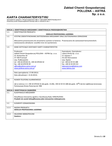 Zakład Chemii Gospodarczej POLLENA – ASTRA Sp. z o.o. KARTA CHARAKTERYSTYKI sporządzona zgodnie z Rozporządzeniem WE nr 1907/2006 (REACH)załącznik II zmieniony przez Rozporządzenie Komisji (UE) nr 453/2010 zał. I. SEKCJA 1: IDENTYFIKACJA MIESZANINY I IDENTYFIKACJA PRZEDSIĘBIORSTWA 1.1. IDENTYFIKATOR PRODUKTU SIDOLUX PROFESSIONAL ŁAZIENKA 1.2. ISTOTNE ZIDENTYFIKOWANE ZASTOSOWANIA MIESZANINY ORAZ ZASTOSOWANIA ODRADZANE Mieszanina przeznaczona do utrzymania czystości w łazience. Przeznaczona do zastosowań konsumenckich. Zastosowania odradzane: wszelkie inne niż wymienione. 1.3. DANE DOTYCZĄCE DOSTAWCY KARTY CHARAKTERYSTYKI Producent: Zakład Chemii Gospodarczej POLLENA – ASTRA Sp. z o.o. Ul. Herburtów 34 37-700 Przemyśl woj. Podkarpackie tel. +48 16 678 66 31, +48 16 678 66 32 fax. +48 16 678 99 39 [email protected] www.pollena-astra.com.pl Dystrybutor: Dystrybutor: Lakma Strefa Sp. z o.o. Ul. Gajowa 7 43-254 Warszowice woj. śląskie tel. +48 32 43 53 188 fax. +48 32 43 49 213 [email protected] www.lakma.com Data sporządzenia: 17.09.2012r. Data aktualizacji: I. 8.10.2013r. 1.4. NUMER TELEFONU ALARMOWEGO 00 Jak w wierszu 1.3. +48 16 678 66 31 (do godz. 15.00), +48 32 43 53 188 (do godz. 16 ) lub do najbliższej terenowej Państwowej Straży Pożarnej tel. 998 SEKCJA 2: IDENTYFIKACJA ZAGROŻEŃ: 2.1. KLASYFIKACJA MIESZANINY Klasyfikacja mieszaniny zgodna z Dyrektywą Rady 1999/45/EWG Produkt nie został sklasyfikowany jako mieszanina niebezpieczna. 2.2. ELEMENTY OZNAKOWANIA 2.2.1 NAZWA PRODUKTU SIDOLUX PROFESSIONAL ŁAZIENKA 2.2.2 SKŁADNIKI NIEBEZPIECZNE Zawiera: - Strona 1 z 10 Zakład Chemii Gospodarczej POLLENA – ASTRA Sp. z o.o. KARTA CHARAKTERYSTYKI sporządzona zgodnie z Rozporządzeniem WE nr 1907/2006 (REACH)załącznik II zmieniony przez Rozporządzenie Komisji (UE) nr 453/2010 zał. I. 2.2.3 SYMBOLE, ZWROTY I NAPISY OSTRZEGAWCZE Mieszanina nie wymaga oznakowania opakowań jednostkowych znakami i napisami ostrzegawczymi. Zwroty R: Nie dotyczy Zwroty S: Nie dotyczy Napisy dodatkowe: - 2.3. INNE ZAGROŻENIA Nieznane SEKCJA 3: SKŁAD/INFORMACJA O SKŁADNIKACH 3.2 MIESZANINY NIEBEZPIECZNE SKŁADNIKI MIESZANINY (WE) 1272/2008 Nazwa substancji/ INCI Nr indeksowy Nr WE Nr CAS Nr rejestru % wagowy name Alkohole C12-14, etoksylowane (1-2.5 TE) i siarczanowane; sole sodowe, INCI name: Sodium Laureth Sulfate Kwas cytrynowy INCI name: citric acid Eter n-butylowy glikolu propylenowego INCI name: propylene glycol monobutyl ether. Nazwa substancji/ INCI name Alkohole C12-14, etoksylowane (1-2.5 TE) i siarczanowane; sole sodowe, INCI name: Sodium Laureth Sulfate Kwas cytrynowy INCI name: citric acid Eter n-butylowy glikolu propylenowego INCI name: propylene glycol monobutyl ether. - 500-234-8 68891-38-3 - 201-069-1 5949-29-1 603-052-00-8 255-878-4 5131-66-8 Klasa zagrożenia Zwroty H 01211948863916-xxxx 1,0 ÷ 2,0% 3.2-Skin Irrit. 2, 3.3-Eye Dam. 1, H315 H318 01211945702642-xxxx 01211947552728-xxxx 1,0 ÷ 3,0% 3.1-Eye Irrit.2; H319 1,0 ÷ 3,0% 3.1-Eye Ieeit.2; 3.2- Skin Irrit.2; H319 H315 Symbole zagrożenia Zwroty R NIEBEZPIECZNE SKŁADNIKI MIESZANINY wg Dyrektywy 67/548 /EWG Nr indeksowy Nr WE Nr CAS Nr rejestru % wagowy - 500-234-8 68891-38-3 01211948863916-xxxx 1,0 ÷ 2,0% Xi R41 R38 - 201-069-1 5949-29-1 1,0 ÷ 3,0% Xi, R36 603-052-00-8 255-878-4 5131-66-8 01211945702642-xxxx 01211947552728-xxxx 1,0 ÷ 3,0% Xi, R36/38 Pełny tekst klas zagrożeń, symboli zagrożeń, zwrotów R i zwrotów H jak powyżej podano w sekcji 16. SEKCJA 4: ŚRODKI PIERWSZEJ POMOCY 4.1. OPIS ŚRODKÓW PIERWSZEJ POMOCY Strona 2 z 10 Zakład Chemii Gospodarczej POLLENA – ASTRA Sp. z o.o. KARTA CHARAKTERYSTYKI sporządzona zgodnie z Rozporządzeniem WE nr 1907/2006 (REACH)załącznik II zmieniony przez Rozporządzenie Komisji (UE) nr 453/2010 zał. I. 4.2. 4.3. Uwagi ogólne: Natychmiast wyprowadzić poszkodowanego na świeże powietrze. W przypadku wystąpienia jakichkolwiek niepokojących objawów wezwać natychmiast lekarza lub odwieźć poszkodowanego do szpitala, pokazać opakowanie preparatu lub etykietę. Wdychanie: W przypadku zatrzymania oddechu zastosować sztuczne oddychanie. Zapewnić poszkodowanemu ciepło i warunki do odpoczynku. Wezwać natychmiast pomoc medyczną. Skóra: Zdjąć skażoną odzież. Natychmiast umyć skórę dużą ilością letniej wody, najlepiej bieżącej. W przypadku podrażnienia skóry (zaczerwienienie) skonsultować się natychmiast z lekarzem. Oczy: Zdjąć szkła kontaktowe. Natychmiast przemywać oczy dużą ilością letniej wody- co najmniej 15 min. (przy odwiniętych powiekach), unikać silnego strumienia wody ze względu na ryzyko uszkodzenia rogówki, w przypadku zanieczyszczenia jednego oka, chronić w trakcie przemywania drugie oko przed zanieczyszczeniem. Skonsultować się natychmiast z lekarzem okulistą! Uwaga: osoby narażone na skażenie oczu powinny być pouczone o konieczności i sposobie ich natychmiastowego płukania. Połknięcie: Wypłukać usta wodą. Nie powodować wymiotów. Podać do wypicia wodę. Wezwać natychmiast pomoc medyczną UWAGA! Pacjenta nieprzytomnego ułożyć w pozycji bocznej ustalonej, zapewnić zatrutemu spokój, chronić przed utratą ciepła, kontrolować oddech i puls. Nigdy nie wywoływać wymiotów ani nie podawać niczego doustnie osobie nieprzytomnej lub zamroczonej. NAJWAŻNIEJSZE OSTRE I OPÓŹNIONE OBJAWY ORAZ SKUTKI NARAŻENIA Patrz sekcja 11 WSKAZANIA DOTYCZĄCE WSZELKIEJ NATYCHMIASTOWEJ POMOCY LEKARSKIEJ I SZCZEGÓLNEGO POSTĘPOWANIA Z POSZKODOWANYM Brak danych SEKCJA 5: POSTĘPOWANIE W PRZYPADKU POŻARU 5.1. ŚRODKI GAŚNICZE Piany, dwutlenek węgla, proszki gaśnicze, natrysk wodny lub mgła. Nie stosować zwartych strumieni wody na powierzchnię cieczy. 5.2. SZCZEGÓLNE ZAGROŻENIE ZWIĄZANE Z SUBSTANCJĄ LUB MIESZANINĄ Podczas pożaru powstają niebezpieczne dla zdrowia pary i dymy zawierające toksyczne i żrące produkty rozkładu. Nie wydychać dymów. 5.3. INFORMACJE DLA STRAŻY POŻARNEJ No