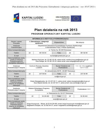 Plan działania na rok 2013 dla Priorytetu I Zatrudnienie i integracja społeczna – wer. 05.07.2013 r. Plan działania na rok 2013 PROGRAM OPERACYJNY KAPITAŁ LUDZKI INFORMACJE O INSTYTUCJI POŚREDNICZĄCEJ Numer i nazwa Priorytetu I. Zatrudnienie i integracja społeczna Województwo Nie dotyczy Instytucja Pośrednicząca Departament Wdrażania Europejskiego Funduszu Społecznego w Ministerstwie Pracy i Polityki Społecznej Adres korespondencyjny ul. Tamka 3a, 00-349 Warszawa Telefon 22 461 63 04 Faks 22 461 62 64 E-mail [email protected] Dane kontaktowe osoby (osób) w Instytucji Pośredniczącej do kontaktów roboczych Marlena Kończak, tel. 22 461 63 46, adres email: [email protected] Ewa Szlaga, tel. 22 461 63 43, adres email: [email protected] Instytucja Pośrednicząca II stopnia Centrum Rozwoju Zasobów Ludzkich Adres korespondencyjny Telefon Numer Działania lub Poddziałania 1.1, 1.2, 1.3 z wyjątkiem 1.3.1 i 1.3.2 Al. Jerozolimskie 65/79 , 00-697 Warszawa 22 237 00 00 Faks 22 237 00 99 E-mail [email protected] Dane kontaktowe osoby (osób) w Instytucji Pośredniczącej II stopnia do kontaktów roboczych Edyta Niewęgłowska, tel. 22 237 00 11, adres email: [email protected] Ewa Ślęzak-Samek, tel. 22 237 00 11, adres email: [email protected] Instytucja Pośrednicząca II stopnia Władza Wdrażająca Programy Europejskie Adres korespondencyjny Telefon E-mail Dane kontaktowe osoby (osób) w Instytucji Pośredniczącej II stopnia do kontaktów roboczych Numer Działania lub Poddziałania Poddziałanie 1.3.1 ul. Rakowiecka 2a, 02-517 Warszawa 22 54 28 400 Faks 22 54 28 444 [email protected] Kinga Krzyszczuk – Micek, tel 22 54 28 440, email: [email protected] Magdalena Świątek, tel. 22 542 84 37, email: [email protected] 1 Plan działania na rok 2013 dla Priorytetu I Zatrudnienie i integracja społeczna – wer. 05.07.2013 r. KARTA DZIAŁANIA 1.1 Projekty, któr ych realizacja jest kontynuow ana B1.1 PROJEKT REALIZOWANY W TRYBIE SYSTEMOWYM Nr umowy z KSI i tytuł projektu POKL.01.01.00-00-013/08-07 „Analiza procesów zachodzących na polskim rynku pracy i w obszarze integracji społecznej w kontekście prowadzonej polityki gospodarczej” Beneficjent systemowy Centrum Rozwoju Zasobów Ludzkich Okres realizacji projektu 01.2009 – 12.2014 Kwota poniesionych/planowanych wydatków w projekcie w latach 2007-2012 (w tym krajowy wkład publiczny) 11 295 265,26 PLN (1 694 289,79 PLN) w roku 2013 (w tym krajowy wkład publiczny) ogółem w projekcie (w tym krajowy wkład publiczny) 6 693 309,37 PLN (1 003 996,41 PLN) 21 050 809,00 PLN (3 157 621,35 PLN) B1.2 PROJEKT REALIZOWANY W TRYBIE SYSTEMOWYM Nr umowy z KSI i tytuł projektu POKL.01.01.00-00-001/08 "Stworzenie bazy danych na temat projektów realizowanych w obszarach zatrudnienia i integracji społecznej - Działania: 1.1; 1.2; 1.3; 1.4; 1.5; 1.6 SPORZL, Działania 2.1; 2.2; 2.3; 2.4; 2.5; 2.6 ZPORR oraz POKL” Beneficjent systemowy Centrum Rozwoju Zasobów Ludzkich Okres realizacji projektu 10.2008-12.2013 Kwota poniesionych/planowanych wydatków w projekcie w latach 2007-2012 (w tym krajowy wkład publiczny) 4 738 829,68 PLN (710 824,45 PLN) w roku 2013 (w tym krajowy wkład publiczny) ogółem w projekcie (w tym krajowy wkład publiczny) 2 095 648,00 PLN (314 347,20 PLN) 6 834 477,68 PLN (1 025 171,65 PLN) B1.3 PROJEKT REALIZOWANY W TRYBIE SYSTEMOWYM Nr umowy z KSI i tytuł projektu POKL.01.01.00-00-012/08-06 „Implementacja i rozwój systemu informacyjnego publicznych służb zatrudnienia” Beneficjent systemowy Centrum Rozwoju Zasobów Ludzkich Okres realizacji projektu 07.2008 – 12.2013 Kwota poniesionych/planowanych wydatków w projekcie w latach 2007-2012 (w tym krajowy wkład publiczny) w roku 2013 (w tym krajowy wkład publiczny) 2 ogółem w projekcie (w tym krajowy wkład publiczny) Plan działania na rok 2013 dla Priorytetu I Zatrudnienie i integracja społeczna – wer. 05.07.2013 r. 65 547 071,69 PLN (9 832 060,75 PLN) 123 452 982,31 PLN (18 517 947,35PLN) 187 000 000,00 PLN (28 050 000,00 PLN) B1.4 PROJEKT REALIZOWANY W TRYBIE SYSTEMOWYM Nr umowy z KSI i tytuł projektu POKL.01.01.00-00-018/10-03 „Wyrównywanie szans na rynku pracy dla osób 50+” Beneficjent systemowy Centrum Rozwoju Zasobów Ludzkich – projekt realizowany w partnerstwie z Uniwersytetem Łódzkim Okres realizacji projektu 02.2010 - 12.2014 Kwota poniesionych/planowanych wydatków w projekcie w latach 2007-2012 (w tym krajowy wkład publiczny) 4 831 154,68 PLN (724 823,20 PLN) w roku 2013 (w tym krajowy wkład publiczny) ogółem w projekcie (w tym krajowy wkład publiczny) 14 463 756,04 PLN (2 169 563,41 PLN) 20 434 744 PLN (3 065 211,60 PLN) Zmiana rezultatów twardych ogółem: 1 analiza dotycząca zrealizowanych programów skierowanych do osób 50+ w Polsce, służąca do wypracowania przykładowych propozycji wspierania osób 50+ przez IRP i JOPS; 1 Raport dotyczący zrealizowanych programów skierowanych do osób 50+ w Polsce, służąca do wypracowania przykładowych propozycji wspierania osób 50+ przez IRP i JOPS; Publikacja 1630 egz. ww. raportu; Zespół merytoryczny ds. koordynacji działań pod nazwą Rada Programowa 50+; 1 narodowy raport dla Polski wykonany przez OECD; Publikacja 100 egz. Raportu; 2 zagraniczne wizyty studyjne członków Rady Programowej 50+; 1 katalog rekomendacji dla działań na rzecz aktywizacji osób po 50 roku życia realizowanych w ramach środków UE; Publikacja 150 egz. Katalogu; 1 katalog rekomendacji dla programów zwiększających aktywność os. Po 50 i po 60 r.ż.; Publikacja 150 egz. Katalogu. B1.5 PROJEKT REALIZOWANY W TRYBIE SYSTEMOWYM Nr umowy z KSI i tytuł projektu POKL.01.01.00-00-019/10-01 „Rozwijanie zbioru krajowych standardów kompetencji zawodowych wymaganych przez pracodawców” Beneficjent systemowy Centrum Rozwoju Zasobów Ludzkich Okres realizacji projektu 03.2011-12.2013 Kwota poniesionych/planowanych wydatków w projekcie w latach 2007-2012 (w tym krajowy wkład publi