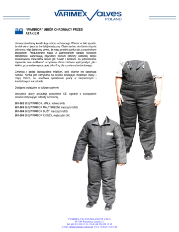 “WARRIOR” UBIÓR CHRONIĄCY PRZED ATAKIEM Unowocześniliśmy konstrukcję ubioru ochronnego Warrior w taki sposób, że stał się on jeszcze bardziej elastyczny. Obyło się bez obniżania stopnia ochronny, więc jesteśmy pewni, że nasz projekt spotka się z przychylnym przyjęciem. Produkowane nadal z zachowaniem bardzo wysokich standardów, zapewniają najwyższy poziom ochrony osobistej dzięki zastosowaniu materiałów takich jak Kevlar i Cordura, co jednocześnie zapewniło nam możliwość uczynienia ubioru zarówno wytrzymałym, jak i lekkim, przy wadze wynoszącej tylko 6 kg dla rozmiaru standardowego. Chroniąc i będąc jednocześnie miękkim, strój Warrior nie ogranicza ruchów. Kurtka jest zamykana na szybko działające metalowe klipsy i rzepy Velcro, co umożliwia operatorowi pracę w bezpiecznych i komfortowych warunkach. Dostępne wyłącznie w kolorze czarnym. Wszystkie ubiory posiadają zezwolenie CE, zgodnie z europejskim prawem dotyczącym odzieży ochronnej. 201-502 Strój WARRIOR, MAŁY, kobiety (48) 201-503 Strój WARRIOR MAŁY/ŚREDNI, mężczyźni (50) 201-504 Strój WARRIOR DUŻY, mężczyźni (52) 201-505 Strój WARRIOR X-DUŻY, mężczyźni (54) VARIMEX-VALVES POLAND SP. Z O.O. 01-199 Warszawa, Leszno 21 Tel. (48 22) 828 15 31, FAX (48 22) 828 15 32 e-mail: [email protected]; www.varimex-valves.pl