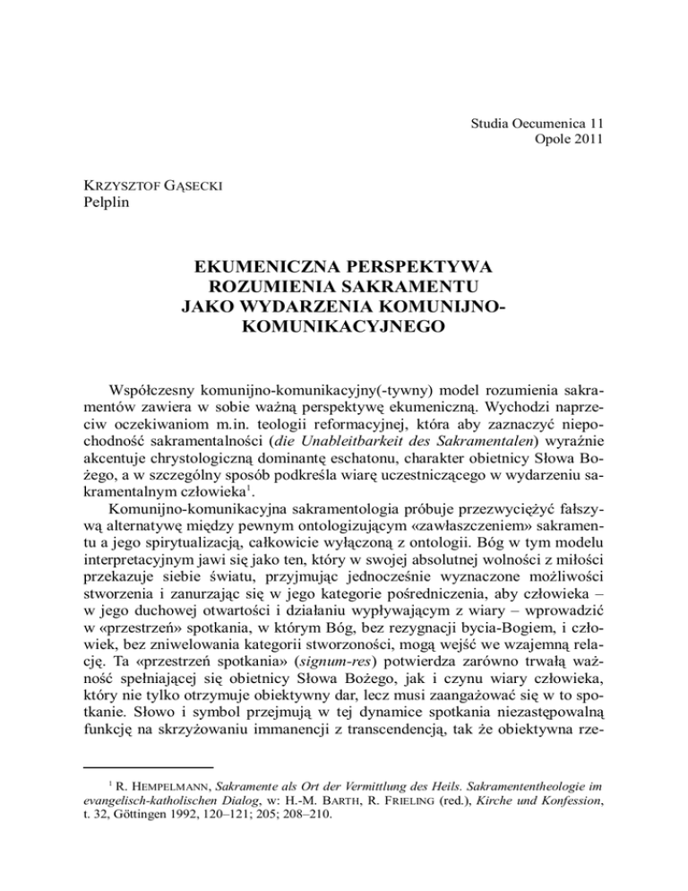 Studia Oecumenica 11 Opole 2011 KRZYSZTOF G SECKI Pelplin EKUMENICZNA PERSPEKTYWA ROZUMIENIA SAKRAMENTU JAKO WYDARZENIA KOMUNIJNOKOMUNIKACYJNEGO Wspó czesny komunijno-komunikacyjny(-tywny) model rozumienia sakra mentów zawiera w sobie wa n perspektyw ekumeniczn . Wychodzi naprzeciw oczekiwaniom m.in. teologii reformacyjnej, która aby zaznaczy niepochodno sakramentalno ci (die Unableitbarkeit des Sakramentalen) wyra nie akcentuje chrystologiczn dominant eschatonu, charakter obietnicy S owa Boego, a w szczególny sposób podkre la wiar uczestnicz cego w wydarzeniu sakramentalnym cz owieka1. Komunijno-komunikacyjna sakramentologia próbuje przezwyci y fa szyw alternatyw mi dzy pewnym ontologizuj cym «zaw aszczeniem» sakramentu a jego spirytualizacj , ca kowicie wy czon z ontologii. Bóg w tym modelu interpretacyjnym jawi si jako ten, który w swojej absolutnej wolno ci z mi o ci przekazuje siebie wiatu, przyjmuj c jednocze nie wyznaczone mo liwo ci stworzenia i zanurzaj c si w jego kategorie po redniczenia, aby cz owieka – w jego duchowej otwarto ci i dzia aniu wyp ywaj cym z wiary – wprowadzi w «przestrze » spotkania, w którym Bóg, bez rezygnacji bycia-Bogiem, i cz owiek, bez zniwelowania kategorii stworzono ci, mog wej we wzajemn rela cj . Ta «przestrze spotkania» (signum-res) potwierdza zarówno trwa wa no spe niaj cej si obietnicy S owa Bo ego, jak i czynu wiary cz owieka, który nie tylko otrzymuje obiektywny dar, lecz musi zaanga owa si w to spotkanie. S owo i symbol przejmuj w tej dynamice spotkania niezast powaln funkcj na skrzy owaniu immanencji z transcendencj , tak e obiektywna rze- 1 R. HEMPELMANN, Sakramente als Ort der Vermittlung des Heils. Sakramententheologie im evangelisch-katholischen Dialog, w: H.-M. BARTH, R. FRIELING (red.), Kirche und Konfession, t. 32, Göttingen 1992, 120–121; 205; 208–210. 126 Krzysztof G secki czywisto zbawienia musi by zrozumiana jako wydarzenie, które obejmuje wszystkie wymiary bosko-ludzkiej relacji i wi zi. 1. Podstawowa zasada: dogmatyka jako forma teologii komunijnej Kiedy dzisiaj zadaje si pytanie o krótkie formu y czy krótk formu wiary chrze cija skiej, natrafia si cz sto na poj cie komunii. Uwa a si je za poj cie kluczowe dogmatyki i rozumie przez nie „uj ty w postaci szyfru, najdalej id cy skrót tre ci wiary chrze cija skiej”2. Ma to oznacza nie tylko «najkrótsze uj cie wiary» w sensie tre ciowym – Tomasz z Akwinu wymienia jako takie Trójc i Wcielenie3 – lecz tak e formalnym. Wiara chrze cija ska ma w tym poj ciu swoj jedno . Komunia – to wyartyku owanie tej rzeczywisto ci, która w Bogu jest najbardziej fundamentaln ; jest tym, w czym urzeczywistniaj si jedno i ró no Osób Boskich. I nie idzie w tym przypadku po prostu o jak wspólnot , lecz o bardzo intensywn i cis form wspó istnienia, o znalezienie to samoci w czym wspólnym, o wzajemne udzielanie tego, co ka dego w asne, o wymian ycia. Wydarzenie Chrystusa wyra nie ujawnia, e Bóg nie jest w sobie zamkni t substancj , jedn niezmienn monad ; Bóg jest udzielaj cym si yciem, relacj , komuni 4. Teologia mówi zatem o Bogu jako o «mi dzyosobowowspólnotowej jedno ci», «wzajemnie obdarowuj cej si komunii», «byciu w dialogu mi o ci». Boski byt jest wspólnot mi o ci trzech Osób, tzn. jest tak komuni , w której trzy Boskie Osoby prowadz w trialogicznej dynamice mi oci jedno Boskie ycie jako wzajemne samoudzielanie si . Boski zamys obda rowania stworzenia wspólnot z Bogiem i mi dzy sob zostaje w sposób ostateczny zrealizowany w Chrystusie. Przez pos anie Syna i Ducha ukszta towa Bóg w Jezusie Chrystusie doskona i nierozerwaln wspólnot bosko-ludzk . W ten sposób nam stworzeniom otworzy ca kowicie i raz na zawsze wewn trztrynitarne ycie. „Bóg urzeczywistnia odt d swoje w asne, wewn trzne ycie po ród nas i z nami, poniewa w i przez wcielonego Syna oraz w i przez wype niaj cego wiat Ducha ca kowicie «uwik a si » w stworzenie”5. „Communio – podkre la Gisbert Greshake – daje hermeneutyczn perspektyw , niejako nadaj c sens i puent , z jakiej nale y rozumie i spe nia prawdy wiary, praktyki Ko cio a, religijne formy wyrazu i dzia ania. Ale rozu- 2 G. GRESHAKE, Communio – Schlüsselbegriff der Dogmatik, w: G. BIEMER I IN. (red.), Gemeinsam Kirche sein. Theorie und Praxis der Communio, Freiburg 1992, 90–121, cytat 91. 3 Por. STh II/III, 1,6 ad 1. 4 Por. G. GRESHAKE, An den drei-einen Gott glauben. Ein Schlüssel zum Verstehen, Freiburg – Basel – Wien 1998, 15; 28. 5 Tam e 73. Ekumeniczna perspektywa rozumienia sakramentu 127 mienie kieruje si nie tylko na immanentne prawdy wiary, lecz w ogóle na wszystko, co jest dane. Je li determinuj c wszystko moc jest Bóg, to dopiero dzi ki Jego samoobjawieniu rzeczywisto staje si jasna, przejrzysta, zrozumia a. Bóg za jest dla cz owieka wierz cego pe nym komunijnym yciem, mi o ci , która urzeczywistnia si w jedno ci to samo ci z ró no ci ”6. Dogmatyka komunijna, która uwa a komuni za podstawow zasad i kluczowe poj cie ca ej wiary chrze cija skiej, nie idzie w swym rozwoju jak «szczególn drog », lecz podkre la, czy i systematyzuje szeroko akceptowany materia dzisiejszej dogmatyki, aby poprzez teologiczn ide przewodni , jak jest komunia, ukaza swój w asny profil. 2. Eklezjalne urzeczywistnienie komunii mi dzy Bogiem i wiatem Komunia w Bogu znajduje odzwierciedlenie w komunijnym wymiarze ca ego dzie a zbawienia. W aspekcie dzia ania mo na mówi o communicare; autentyczna posta Boga (communio) zaznacza si bowiem równie w zewn trznym dziele zbawienia; historia zbawienia jest Bo wol komunikacji. Chrystologia, pneumatologia, soteriologia i nauka o asce wskazuj na ruch Boga ku wiatu. Jezus Chrystus wypowiada na krzy u nowe «tak» wobec komunii mi dzy Bogiem i wiatem. «Poszerzenie» wydarzenia Chrystusa zostaje urzeczywistnione w Ko ciele, w owej wspólnocie, w której ca y wiat ma by sprowadzony do jedno ci – jedno ci z Bogiem i jedno ci wzajemnej7. Aby Koció móg tego dokona , mus