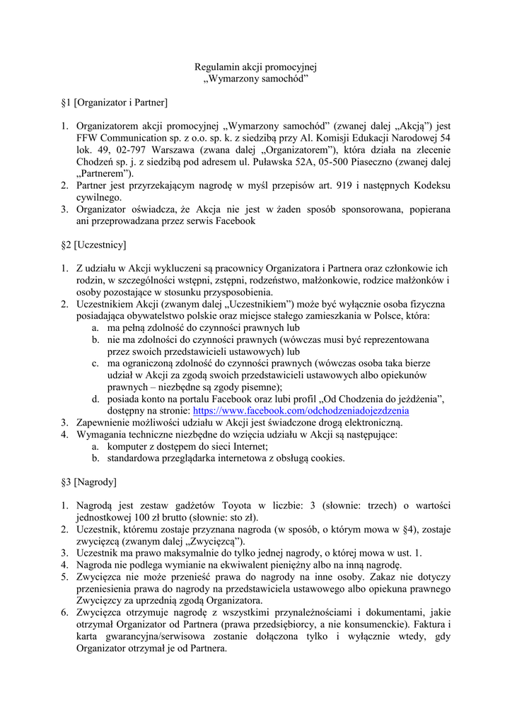 Regulamin akcji promocyjnej „Wymarzony samochód” §1 [Organizator i Partner] 1. Organizatorem akcji promocyjnej „Wymarzony samochód” (zwanej dalej „Akcją”) jest FFW Communication sp. z o.o. sp. k. z siedzibą przy Al. Komisji Edukacji Narodowej 54 lok. 49, 02-797 Warszawa (zwana dalej „Organizatorem”), która działa na zlecenie Chodzeń sp. j. z siedzibą pod adresem ul. Puławska 52A, 05-500 Piaseczno (zwanej dalej „Partnerem”). 2. Partner jest przyrzekającym nagrodę w myśl przepisów art. 919 i następnych Kodeksu cywilnego. 3. Organizator oświadcza, że Akcja nie jest w żaden sposób sponsorowana, popierana ani przeprowadzana przez serwis Facebook §2 [Uczestnicy] 1. Z udziału w Akcji wykluczeni są pracownicy Organizatora i Partnera oraz członkowie ich rodzin, w szczególności wstępni, zstępni, rodzeństwo, małżonkowie, rodzice małżonków i osoby pozostające w stosunku przysposobienia. 2. Uczestnikiem Akcji (zwanym dalej „Uczestnikiem”) może być wyłącznie osoba fizyczna posiadająca obywatelstwo polskie oraz miejsce stałego zamieszkania w Polsce, która: a. ma pełną zdolność do czynności prawnych lub b. nie ma zdolności do czynności prawnych (wówczas musi być reprezentowana przez swoich przedstawicieli ustawowych) lub c. ma ograniczoną zdolność do czynności prawnych (wówczas osoba taka bierze udział w Akcji za zgodą swoich przedstawicieli ustawowych albo opiekunów prawnych – niezbędne są zgody pisemne); d. posiada konto na portalu Facebook oraz lubi profil „Od Chodzenia do jeżdżenia”, dostępny na stronie: https://www.facebook.com/odchodzeniadojezdzenia 3. Zapewnienie możliwości udziału w Akcji jest świadczone drogą elektroniczną. 4. Wymagania techniczne niezbędne do wzięcia udziału w Akcji są następujące: a. komputer z dostępem do sieci Internet; b. standardowa przeglądarka internetowa z obsługą cookies. §3 [Nagrody] 1. Nagrodą jest zestaw gadżetów Toyota w liczbie: 3 (słownie: trzech) o wartości jednostkowej 100 zł brutto (słownie: sto zł). 2. Uczestnik, któremu zostaje przyznana nagroda (w sposób, o którym mowa w §4), zostaje zwycięzcą (zwanym dalej „Zwycięzcą”). 3. Uczestnik ma prawo maksymalnie do tylko jednej nagrody, o której mowa w ust. 1. 4. Nagroda nie podlega wymianie na ekwiwalent pieniężny albo na inną nagrodę. 5. Zwycięzca nie może przenieść prawa do nagrody na inne osoby. Zakaz nie dotyczy przeniesienia prawa do nagrody na przedstawiciela ustawowego albo opiekuna prawnego Zwycięzcy za uprzednią zgodą Organizatora. 6. Zwycięzca otrzymuje nagrodę z wszystkimi przynależnościami i dokumentami, jakie otrzymał Organizator od Partnera (prawa przedsiębiorcy, a nie konsumenckie). Faktura i karta gwarancyjna/serwisowa zostanie dołączona tylko i wyłącznie wtedy, gdy Organizator otrzymał je od Partnera. 7. Akcja nie stanowi konkursu w rozumieniu ustawy o podatku dochodowym od osób fizycznych. Przychód z nagrody (głównej, pocieszenia) jest opodatkowany na zasadach ogólnych. Organizator może uzależnić wydanie nagrody od uprzedniego podania przez Zwycięzcę danych niezbędnych do sporządzenia rocznej informacji o przychodach z innych źródeł, która zostanie przekazana Zwycięzcy oraz właściwemu dla Uczestnika urzędowi skarbowemu. Zgodnie z przepisami, Zwycięzca powinien wykazać przychód z tytułu nagrody w swoim rocznym zeznaniu podatkowym i odprowadzić stosowny podatek dochodowy z tego tytułu w przewidzianym w prawie podatkowym terminie. §4 [Mechanika Akcji] 1. Akcja prowadzona jest od 01.06 do 08.06 lub do jednostronnego jej odwołania przez Organizatora lub Partnera i jest prowadzona za pośrednictwem strony internetowej udostępnionej pod adresem: www.facebook.pl/odchodzeniadojezdzenia („Strona www”), na której może zostać zamieszczona informacja o odwołaniu Akcji. 2. Akcja polega na opublikowaniu przez Uczestnika w komentarzu pod postem konkursowym zdjęcia lub skanu rysunku wykonanego przez dziecko przedstawiającego samochód. Przy czym publikując rysunek uczestnik zapewnia jednocześnie Organizatora pod rygorem odpowiedzialności odszkodowawczej, że posiada prawa autorskie lub jest uprawniony do wykonywania praw autorskich do rysunku. 3. Komisja powołana przez Organizatora (zwana dalej „Komisją”) wyłania trzech Zwycięzców w terminie do 7 dni kalendarzowych od daty zakończenia Akcji kierując się subiektywną oceną zgłoszonej pracy. Zwycięzca jest zawiadamiany o wygraniu nagrody za pośrednictwem wiadomości prywatnej poprzez portal facebook.com. 4. W skład Komisji wchodzą: a. Aneta Bereda – przedstawiciel Partnera; b. Edyta Przybysz– przedstawiciel Organizatora. 5. Zwycięzca traci prawo do nagrody, a Organizator jest zobowiązany do przyznania nagrody Uczestnikowi, którego odpowiedź jest kolejną najlepszą według Komisji, w przypadku: a. niepodania przez Zwycięzcę pełnych danych (o których mowa w §6) w terminie 7 dni kalendarzowych od dnia wysłania wiadomości, o której mowa w ust. 3 b. podania fałszywych danych; c. podania nieprawidłowego adresu e-mail. 6. Organizator w imieniu Partnera wyśle nagrody w terminie 14 dni kalendarzowych od dnia wysłania wiadomości, o której mowa w ust. 3 z tym zastrzeżeniem, że Organizator nie ponosi odpowiedzialności za podanie przez Uczestnika niewłaściwych lub nieprawdziwych danych uniemożliwiających lub opóźniających doręczenie Nagrody. §5 [Reklamacje i wykluczenia] 1. Wszelkie reklamacje w związku z przeprowadzeniem Akcji powinny być: a. pisemne i zawierać: imię, nazwisko, adres e-mail, adres do korespondencji Uczestnika oraz uzasadnienie reklamacji; b. przesłane listem poleconym na adres Organizatora (ul. Podchorążych 71 lok. 8, 00-722 Warszawa); c. wysłane najpóźniej w terminie 3 dni kalendarzowych od dnia wyłonienia Zwycięzców (reklamacja wysłana po tym terminie nie wywołuje skutków prawnych; dla oceny zachow