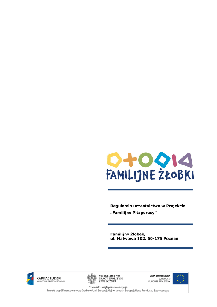 Regulamin uczestnictwa w Projekcie „Familijne Pitagorasy” Familijny Żłobek, ul. Malwowa 102, 60-175 Poznań Strona |1 Regulamin uczestnictwa w Projekcie „Familijne Pitagorasy” §1 Postanowienia ogólne 1. Projekt „Familijne Pitagorasy” realizowany jest przez Fundację Familijny Poznań, ul. Staszica 15 60-526 Poznań, na podstawie umowy o dofinansowanie projektu numer UDA.POKL.01.05.00-00350/12-00 zawartej z Ministerstwem Pracy i Polityki Społecznej, ul. Nowogrodzka 1/3/5, 00-513 Warszawa, w ramach Priorytetu I Zatrudnienie i integracja społeczna, Działanie 1.5 Wsparcie rozwiązań na rzecz godzenia życia zawodowego i rodzinnego, Programu Operacyjnego Kapitał Ludzki 2007 -2013. 2. Celem projektu jest powrót na rynek pracy, rodziców/opiekunów prawnych dzieci do lat 3, którzy przebywają na urlopach macierzyńskich lub wychowawczych lub są osobami bezrobotnymi, poprzez zapewnienie opieki nad ich dziećmi w nowoutworzonych żłobkach. 3. Projekt jest realizowany w okresie od 01.09.2013 do 31.12.2014 roku. 4. Regulamin Uczestnictwa w Projekcie „Familijne Pitagorasy” określa: a) Zakres wsparcia dla Uczestników Projektu, b) Kryteria uczestnictwa w Projekcie, c) Procedurę rekrutacji, d) Prawa i obowiązki Uczestników Projektu, e) Zasady monitoringu Uczestników Projektu, f) Zasady rezygnacji i skreślenia z listy uczestników Projektu. 5. Regulamin Uczestnictwa ma charakter aktu wewnętrznego. 6. Ogólny nadzór nad realizacją Projektu, a także rozstrzyganie spraw nie uwzględnionych w regulaminie, pozostaje w gestii Koordynatora Projektu: Krzysztof Kocowski, [email protected], Familijny Wrocław, Dolnośląski Oddział Fundacji Familijny Poznań, ul. Roosevelta 15, 50-236 Wrocław. 7. Decyzje Koordynatora Projektu oraz Komisji Rekrutacyjnej są ostateczne i nie przysługuje od nich odwołanie. 8. Wszystkie informacje dotyczące realizacji projektu dostępne są na stronie internetowej www.familijny.pl oraz w Biurze Projektu: Familijny Wrocław, Dolnośląski Oddział Fundacji Familijny Poznań, ul. Roosevelta 15, 50-236 Wrocław, wrocł[email protected]. §2 Definicje Wyjaśnienie pojęć używanych w niniejszym regulaminie: Projektodawca – Fundacja Familijny Poznań, ul. Staszica 15, 60-526 Poznań. Uczestnik Projektu – rodzic lub opiekun prawny dziecka do lat 3 zakwalifikowany do Projektu, otrzymujący wsparcie. Kandydat – rodzic lub opiekun prawny dziecka do lat 3 ubiegający się o udział w Projekcie tj. ubiegający się o miejsce w żłobku. Projekt – Projekt pt. „Familijne Pitagorasy” realizowany przez Fundację Familijny Poznań, ul. Staszica 15 60-526 Poznań. Koordynator Projektu – osoba zarządzająca projektem. Biuro Projektu – Familijny Wrocław, Dolnośląski Oddział Fundacji Familijny Poznań, ul. Roosevelta 15, 50-236 Wrocław, [email protected]. Żłobek – placówka opiekuńczo – edukacyjna utworzona w ramach Projektu „Familijne Pitagorasy”. Osoba samotnie wychowująca dziecko - jedno z rodziców albo opiekun prawny dziecka/dzieci, którego drugi rodzic nie żyje, nie uznał ojcostwa, został pozbawiony, zawieszony lub ograniczony w wykonywaniu władzy rodzicielskiej albo odbywa karę pozbawienia wolności. Rodzina w trudnej sytuacji finansowej - rodzina w trudnej sytuacji materialnej przyjmuje się, zgodnie z ustawą z dnia 28 listopada 2003 o świadczeniach rodzinnych (Dz. U. z 2006 r. Nr 139, Strona |2 poz. 992 + zm.), rodzinę, w której dochód w przeliczeniu na osobę nie przekracza kwoty 539,00 zł netto. W przypadku gdy członkiem rodziny jest dziecko legitymujące się orzeczeniem o niepełnosprawności lub orzeczeniem o umiarkowanym albo o znacznym stopniu niepełnosprawności, jeżeli dochód rodziny w przeliczeniu na osobę nie przekracza kwoty 623,00zł netto §3 Zakres wsparcia dla Uczestników Projektu 1. Wsparcie na terenie Miasta Poznań jest skierowane do 15 rodziców/opiekunów prawnych dzieci do lat 3 (w tym 12 kobiet i 3 mężczyzn) – osób powracających na rynek pracy po urlopie macierzyńskim i/lub wychowawczym lub osób bezrobotnych planujących powrót na rynek pracy. 2. Wsparcie polega na zapewnieniu fachowej opieki nad dziećmi od 20 tygodnia do lat 3 w formie żłobka, mieszczącego się przy ul. Malwowej 102 w Poznaniu. 3. Żłobki powstałe w ramach Projektu funkcjonują od poniedziałku do piątku, w godzinach od 7:00 do 17:00, bez przerwy wakacyjnej. 4. W żłobkach zapewnione będzie całodzienne wyżywienie w formie cateringu. 5. Od Uczestników Projektu pobierana jest stała opłata miesięczna wynosząca 350 zł. Opłata będzie pobierana od pierwszego miesiąca pobytu dziecka w żłobku, za cały miesiąc pobytu z góry, bez względu na faktyczną liczbę dni pobytu dziecka w żłobku w danym miesiącu. Opłata stała od Uczestników Projektu stanowi wkład własny finansowy Projektu. §4 Kryteria uczestnictwa w Projekcie 1. Głównym kryterium rekrutacji Uczestników Projektu jest wsparcie rodziców/opiekunów prawnych dzieci do lat 3, w powrocie na rynek pracy w tym: a) rodziców/opiekunów powracający na rynek pracy po urlopie macierzyńskim i/lub wychowawczym. b) rodziców/opiekunów będących osobami bezrobotnymi i planującymi powrót na rynek pracy. 2. W pierwszej kolejności premiowani będą (poprzez przyznawanie punktów) kandydaci, którzy: a) do formularzy zgłoszeniowych załączą dokumenty poświadczające powrót na rynek pracy, tj. - w przypadku osób powracających po urlopie macierzyńskim i/lub wychowawczym: zaświadczenia od pracodawcy; - w przypadku osób bezrobotnych planujących powrót na rynek pracy: dokumenty poświadczające podjęcie konkretnych działań w celu powrotu na rynek pracy; b) rodzice/opiekunowie, którzy nie mają zapewnionej opieki domowej czy instytucjonalnej w godzinach pracy (w tym rodzice/opiekunowie którzy nie dostali się do publicznych żłobków); c) rodzice/opiekunowie niepełnosprawni; d) rodzice/opiekunowie samotnie wychowu