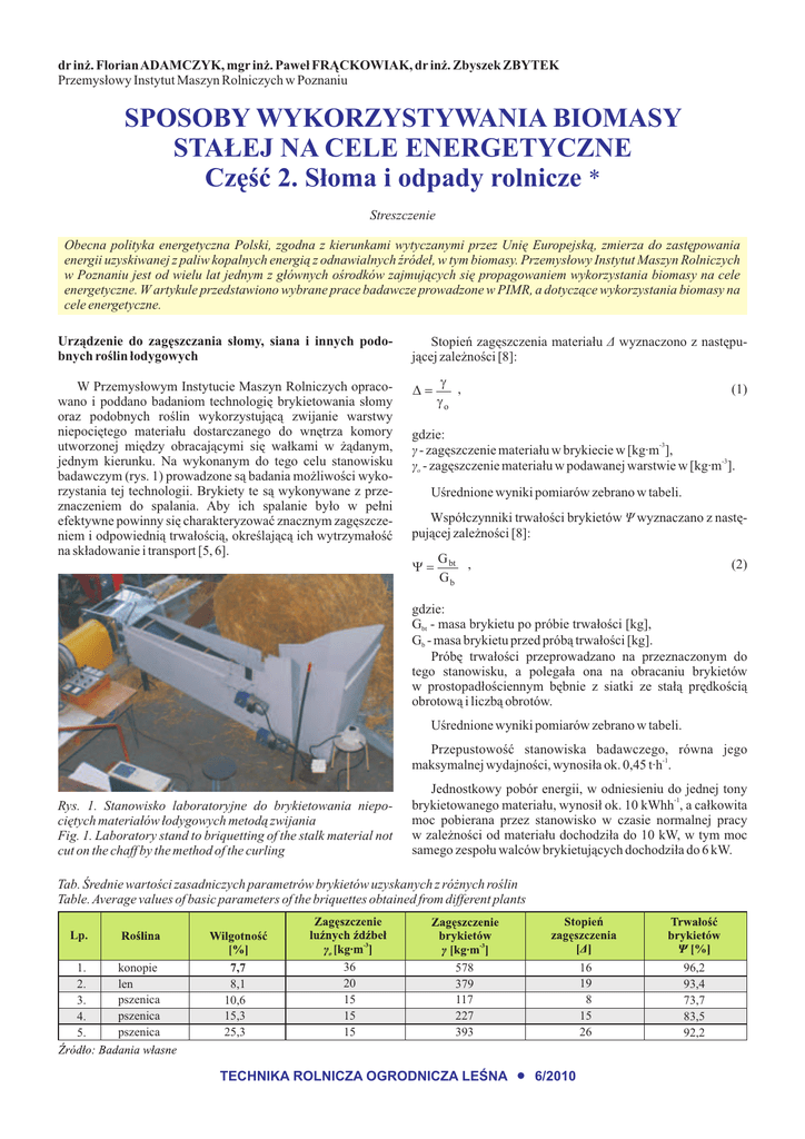 dr in¿. FlorianADAMCZYK, mgr in¿. Pawe³ FR¥CKOWIAK, dr in¿. Zbyszek ZBYTEK Przemys³owy Instytut Maszyn Rolniczych w Poznaniu SPOSOBY WYKORZYSTYWANIA BIOMASY STA£EJ NA CELE ENERGETYCZNE Czêœæ 2. S³oma i odpady rolnicze * Streszczenie Obecna polityka energetyczna Polski, zgodna z kierunkami wytyczanymi przez Uniê Europejsk¹, zmierza do zastêpowania energii uzyskiwanej z paliw kopalnych energi¹ z odnawialnych Ÿróde³, w tym biomasy. Przemys³owy Instytut Maszyn Rolniczych w Poznaniu jest od wielu lat jednym z g³ównych oœrodków zajmuj¹cych siê propagowaniem wykorzystania biomasy na cele energetyczne. W artykule przedstawiono wybrane prace badawcze prowadzone w PIMR, a dotycz¹ce wykorzystania biomasy na cele energetyczne. Urz¹dzenie do zagêszczania s³omy, siana i innych podobnych roœlin ³odygowych Stopieñ zagêszczenia materia³u Ä wyznaczono z nastêpuj¹cej zale¿noœci [8]: W Przemys³owym Instytucie Maszyn Rolniczych opracowano i poddano badaniom technologiê brykietowania s³omy oraz podobnych roœlin wykorzystuj¹c¹ zwijanie warstwy niepociêtego materia³u dostarczanego do wnêtrza komory utworzonej miêdzy obracaj¹cymi siê wa³kami w ¿¹danym, jednym kierunku. Na wykonanym do tego celu stanowisku badawczym (rys. 1) prowadzone s¹ badania mo¿liwoœci wykorzystania tej technologii. Brykiety te s¹ wykonywane z przeznaczeniem do spalania. Aby ich spalanie by³o w pe³ni efektywne powinny siê charakteryzowaæ znacznym zagêszczeniem i odpowiedni¹ trwa³oœci¹, okreœlaj¹c¹ ich wytrzyma³oœæ na sk³adowanie i transport [5, 6]. D= g , go (1) gdzie: -3 ã - zagêszczenie materia³u w brykiecie w [kg·m ], -3 ão - zagêszczenie materia³u w podawanej warstwie w [kg·m ]. Uœrednione wyniki pomiarów zebrano w tabeli. Wspó³czynniki trwa³oœci brykietów Ø wyznaczano z nastêpuj¹cej zale¿noœci [8]: Y= G bt , Gb (2) gdzie: Gbt - masa brykietu po próbie trwa³oœci [kg], Gb - masa brykietu przed prób¹ trwa³oœci [kg]. Próbê trwa³oœci przeprowadzano na przeznaczonym do tego stanowisku, a polega³a ona na obracaniu brykietów w prostopad³oœciennym bêbnie z siatki ze sta³¹ prêdkoœci¹ obrotow¹ i liczb¹ obrotów. Uœrednione wyniki pomiarów zebrano w tabeli. Przepustowoœæ stanowiska badawczego, równa jego -1 maksymalnej wydajnoœci, wynosi³a ok. 0,45 t·h . Rys. 1. Stanowisko laboratoryjne do brykietowania niepociêtych materia³ów ³odygowych metod¹ zwijania Fig. 1. Laboratory stand to briquetting of the stalk material not cut on the chaff by the method of the curling Jednostkowy pobór energii, w odniesieniu do jednej tony -1 brykietowanego materia³u, wynosi³ ok. 10 kWhh , a ca³kowita moc pobierana przez stanowisko w czasie normalnej pracy w zale¿noœci od materia³u dochodzi³a do 10 kW, w tym moc samego zespo³u walców brykietuj¹cych dochodzi³a do 6 kW. Tab. Œrednie wartoœci zasadniczych parametrów brykietów uzyskanych z ró¿nych roœlin Table. Average values of basic parameters of the briquettes obtained from different plants Lp. 1. 2. 3. 4. 5. konopie len pszenica pszenica pszenica 7,7 8,1 10,6 15,3 25,3 36 20 15 15 15 16 19 8 15 26 578 379 117 227 393 TECHNIKA ROLNICZA OGRODNICZA LEŒNA 6/2010 96,2 93,4 73,7 83,5 92,2 Biogaz - przysz³oœciowy dostawca energii Podsumowanie W ostatnim czasie Przemys³owy Instytut Maszyn Rolniczych we wspó³pracy z Instytutem In¿ynierii Rolniczej Uniwersytetu Przyrodniczego w Poznaniu prowadzi prace i badania zwi¹zane z mo¿liwoœciami wykorzystywania fazy glicerynowej powsta³ej po estryfikacji t³uszczów odpadowych jako dodatku do produkcji biogazu [11]. Wagê tych badañ podnosi fakt, i¿ w Polsce planuje siê budowê biogazowni ró¿nych typów. Wed³ug zamierzeñ Rz¹du, do 2020 r. w ka¿dej gminie w naszym kraju powinna funkcjonowaæ przynajmniej jedna biogazownia rolnicza produkuj¹ca energiê elektryczn¹ i ciepln¹. Moc ka¿dego obiektu ma wynosiæ 0,7-3,0 MW, a ³¹cznie do 2-3 tysiêcy MW. Surowcem do produkcji biogazu w tych biogazowniach powinny byæ roœliny energetyczne (g³ównie kukurydza) i odpady rolnicze (gnojowica, resztki poubojowe, odpady z wytwarzania biopaliw). Wykorzystanie odpadów do produkcji biogazu, takich jak: obornik, gnojowica, odpady zwierzêce, t³uszcze poflotacyjne, odpady z przemys³u spo¿ywczego, przetwórczego oraz innych odpadów organicznych, mo¿e byæ Ÿród³em zarobku dla ma³ych i œrednich gospodarstw rolno-hodowlanych oraz przyczyniæ siê do restrukturyzacji wsi. Z praktyki innych krajów wiadomo, ¿e biogazownie rolnicze maj¹ racjê bytu w gospodarstwach o powierzchni powy¿ej 20 ha [10]. Typowa instalacja biogazowni rolniczej sk³ada siê z uk³adu podawania biomasy, komory fermentacyjnej, zbiornika biogazu, zbiornika magazynuj¹cego przefermentowany substrat oraz agregatu kogeneracyjnego (rys. 2). Prace, jakie prowadzi Przemys³owy Instytut Maszyn Rolniczych, dotycz¹ ró¿nych sk³adników biomasy i sposobów jej wykorzystywania. Opracowywane i dopracowywane nastêpuj¹ce urz¹dzenia oraz technologie: wytwórnia biopaliwa, prasa do wyt³aczania oleju z nasion drobnoziarnistych, czy technologia brykietowania s³omy metod¹ zwijania, to konstrukcje pomagaj¹ce racjonalnie, ekonomicznie i bezpiecznie przerabiaæ ró¿nego rodzaju sk³adniki biomasy na energiê ciepln¹, mechaniczn¹ lub elektryczn¹. Rys. 2. Schemat instalacji biogazowni rolniczej [12]: 1 - obiekty inwentarskie, 2 - dó³ na gnojowicê, 3 - pojemnik zbiorczy, 4 - zbiornik higienizuj¹cy, 5 - reaktor biogazowy, 6 - zbiornik magazynowy gazu, 7 - zblokowana elektrociep³ownia gazowa, 8 - zbiornik sk³adowy na gnojowice, 9 - grunt uprawny Fig. 2. The schema of typical agricultural biogas plant [12]: 1 - livestock objects, 2 - manure pit, 3 - collecting container, 4 - hygienic container, 5 - biogas reactor, 6 - gas container, 7 - block-type gaseous thermal-electric power station, 8 - manure collecting container, 9 - arable land Literatura [1] Sulewski M., Ga