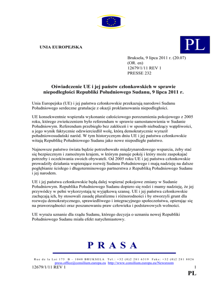 PL UNIA EUROPEJSKA Bruksela, 9 lipca 2011 r. (20.07) (OR. en) 12679/1/11 REV 1 PRESSE 232 Oświadczenie UE i jej państw członkowskich w sprawie niepodległości Republiki Południowego Sudanu, 9 lipca 2011 r. Unia Europejska (UE) i jej państwa członkowskie przekazują narodowi Sudanu Południowego serdeczne gratulacje z okazji proklamowania niepodległości. UE konsekwentnie wspierała wykonanie całościowego porozumienia pokojowego z 2005 roku, którego zwieńczeniem było referendum w sprawie samostanowienia w Sudanie Południowym. Referendum przebiegło bez zakłóceń i w sposób niebudzący wątpliwości, a jego wynik faktycznie odzwierciedlił wolę, którą demokratycznie wyraził południowosudański naród. W tym historycznym dniu UE i jej państwa członkowskie witają Republikę Południowego Sudanu jako nowe niepodległe państwo. Najnowsze państwo świata będzie potrzebowało międzynarodowego wsparcia, Ŝeby stać się bezpiecznym i zamoŜnym krajem, w którym panuje pokój i który moŜe zaspokajać potrzeby i oczekiwania swoich obywateli. Od 2005 roku UE i jej państwa członkowskie prowadziły działania wspierające rozwój Sudanu Południowego i mają nadzieję na dalsze pogłębianie ścisłego i długoterminowego partnerstwa z Republiką Południowego Sudanu i jej narodem. UE i jej państwa członkowskie będą dalej wspierać pokojowe zmiany w Sudanie Południowym. Republika Południowego Sudanu dopiero się rodzi i mamy nadzieję, Ŝe jej przywódcy w pełni wykorzystają tę wyjątkową szansę. UE i jej państwa członkowskie zachęcają ich, by stosowali zasadę pluralizmu i róŜnorodności i by stworzyli grunt dla rozwoju demokratycznego, sprawiedliwego i integracyjnego społeczeństwa, opierając się na praworządności oraz poszanowaniu praw człowieka i podstawowych wolności. UE wyraŜa uznanie dla rządu Sudanu, którego decyzja o uznaniu nowej Republiki Południowego Sudanu miała efekt natychmiastowy. PRASA Rue de la Loi 175 B – 1048 BRUKSELA Tel.: +32 (0)2 281 6319 Faks: +32 (0)2 281 8026 [email protected] http://www.consilium.europa.eu/Newsroom 12679/1/11 REV 1 1 PL UE i jej państwa członkowskie korzystają z tej okazji, by ponownie zapewnić o swoim wsparciu dla rozwoju pokojowych stosunków dobrosąsiedzkich między Sudanem a Sudanem Południowym. UE wyraŜa uznanie dla ONZ, UA i IGAD za to, Ŝe wspierają proces pokojowy w Sudanie. UE jest gotowa uczestniczyć w podtrzymywaniu rozwoju dwóch samodzielnych państw i najwaŜniejszych ustaleń podjętych po wygaśnięciu całościowego porozumienia pokojowego, które to ustalenia będą kształtować stosunki Północ-Południe przez dłuŜszy czas. Kraje kandydujące: Turcja, Chorwacja*, Była Jugosłowiańska Republika Macedonii*, Czarnogóra* i Islandia+; państwa uczestniczące w procesie stabilizacji i stowarzyszenia i potencjalne kraje kandydujące: Albania, Bośnia i Hercegowina, Serbia; państwa EFTA będące członkami Europejskiego Obszaru Gospodarczego: Liechtenstein i Norwegia; a takŜe Ukraina, Republika Mołdowy, Armenia, i Gruzja przyłączają się do niniejszego oświadczenia. * Chorwacja, Była Jugosłowiańska Republika Macedonii i Czarnogóra nadal uczestniczą w procesie stabilizacji i stowarzyszenia. + Islandia jest nadal członkiem EFTA i Europejskiego Obszaru Gospodarczego. 12679/1/11 REV 1 2 PL