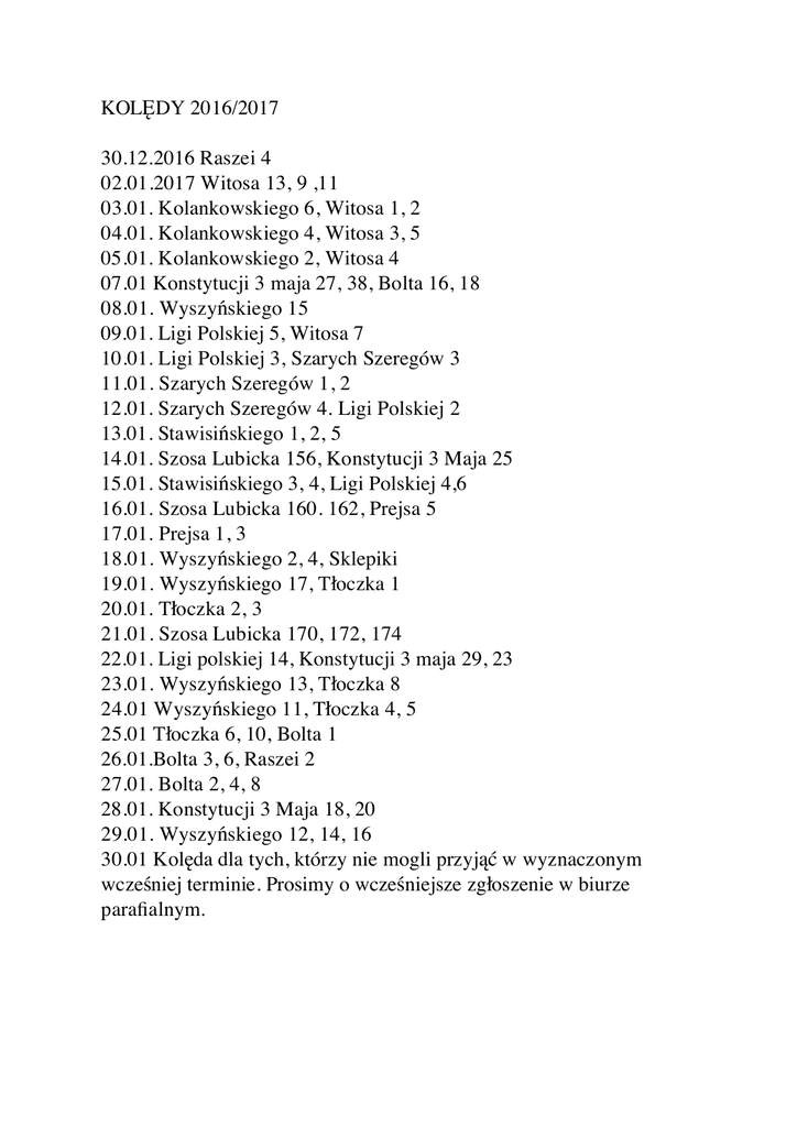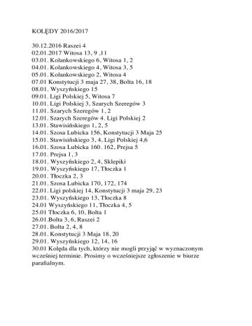 KOLĘDY 2016/2017 30.12.2016 Raszei 4 02.01.2017 Witosa 13, 9 ,11 03.01. Kolankowskiego 6, Witosa 1, 2 04.01. Kolankowskiego 4, Witosa 3, 5 05.01. Kolankowskiego 2, Witosa 4 07.01 Konstytucji 3 maja 27, 38, Bolta 16, 18 08.01. Wyszyńskiego 15 09.01. Ligi Polskiej 5, Witosa 7 10.01. Ligi Polskiej 3, Szarych Szeregów 3 11.01. Szarych Szeregów 1, 2 12.01. Szarych Szeregów 4. Ligi Polskiej 2 13.01. Stawisińskiego 1, 2, 5 14.01. Szosa Lubicka 156, Konstytucji 3 Maja 25 15.01. Stawisińskiego 3, 4, Ligi Polskiej 4,6 16.01. Szosa Lubicka 160. 162, Prejsa 5 17.01. Prejsa 1, 3 18.01. Wyszyńskiego 2, 4, Sklepiki 19.01. Wyszyńskiego 17, Tłoczka 1 20.01. Tłoczka 2, 3 21.01. Szosa Lubicka 170, 172, 174 22.01. Ligi polskiej 14, Konstytucji 3 maja 29, 23 23.01. Wyszyńskiego 13, Tłoczka 8 24.01 Wyszyńskiego 11, Tłoczka 4, 5 25.01 Tłoczka 6, 10, Bolta 1 26.01.Bolta 3, 6, Raszei 2 27.01. Bolta 2, 4, 8 28.01. Konstytucji 3 Maja 18, 20 29.01. Wyszyńskiego 12, 14, 16 30.01 Kolęda dla tych, którzy nie mogli przyjąć w wyznaczonym wcześniej terminie. Prosimy o wcześniejsze zgłoszenie w biurze parafialnym.