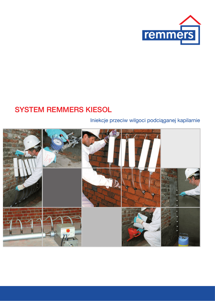 SYSTEM REMMERS KIESOL Iniekcje przeciw wilgoci podciąganej kapilarnie Jedną z najczęstszych przyczyn zawilgocenia murów w starych budynkach jest kapilarne podciąganie wilgoci w materiale ściennym (najczęściej cegle ceramicznej) i spoinie. Zjawisko to jest niemożliwe w murach ze skutecznymi, całkowicie ciągłymi izolacjami poziomymi i pionowymi. Zawilgocenie murów powoduje ich destrukcję i znacznie zmniejsza wartość budynków oraz niekorzystnie wpływa na zdrowie jego użytkowników: - Wysoka względna wilgotność powietrza, niezdrowy klimat w pomieszczeniach. - Rozwój szkodliwych mikroorganizmów - glony, zgnilizna, pleśń, grzyb (w tym grzyby wytwarzające rakotwórcze zarodniki). - Uszkodzenia materiałów budowlanych, takich jak powłoki malarskie, drewno, tapety. - Korozja chemiczna - wykwity, rozsadzanie w wyniku krystalizacji soli. - Korozja mechaniczna - odspojenia, piaszczenie, łuszczenie. - Zmniejszenie termoizolacyjności ściany. Iniekcje przeciw wilgoci podciąganej kapilarnie polegają na wywierceniu otworów i nasączeniu muru preparatem wlewanym w otwory lub wprowadzanym pod ciśnieniem. Preparat iniekcyjny zmienia właściwości nasączanego materiału budowlanego, powodując jego strukturalną hydrofobizację z ewentualnym uszczelnieniem. Firma Remmers od ponad czterdziestu lat opracowuje i wdraża profesjonalne preparaty iniekcyjne, których skuteczność udowadniają tysiące zabezpieczonych obiektów oraz liczne atesty, orzeczenia i aprobaty. Kiesol IK Hydrofobizujący koncentrat mikroemulsji silikonowej (SMK). Produkt wodorozcieńczalny, stosowany metodą iniekcji ciśnieniowej lub bezciśnieniowej. Kiesol IK nie tworzy żadnych soli szkodliwych dla budowli. W normalnym przypadku (stopień zawilgocenia muru maksymalnie 60%) preparat Kiesol IK rozcieńcza się w proporcji 1:12. Przy iniekcjach w utrudnionych warunkach roztwór należy wprowadzać metodą niskociśnieniową. Preparaty iniekcyjne: Injektionscreme Gotowy do użycia, opatentowany nowy produkt, który dzięki konsystencji kremu umożliwia iniekcję bezciśnieniową, także w otworach wywierconych poziomo. Emulsja oparta na silanach/siloksanach. Kiesol Płynny, wodorozcieńczalny preparat krzemionkujący. Powoduje hydrofobizację i zwęża pory materiału budowlanego. Nie wykazuje tworzenia się produktów ubocznych w stężeniu szkodliwym dla budowli i środowiska. Nie zmniejsza przepuszczalności pary wodnej, wzmacnia podłoże i podwyższa jego odporność chemiczną. Najlepiej nadaje się do porowatych materiałów budowlanych o stopniu zawilgocenia do 60%. Aprobata Techniczna ITB AT-15-3110/2001. Materiał uzupełniający: Bohrlochsuspension Sucha zaprawa mineralna przeznaczona do wypełniania wywierconych otworów i pustek. Produkt odporny na siarczany i wyróżniający się dobrą płynnością. Po związaniu i stwardnieniu Bohrlochsuspension jest porowatą, bezskurczową, białą zaprawą o właściwościach podobnych do właściwości wapna. gruboœæ muru d < 60 cm gruboœæ muru d > 60 cm k¹t nachylenia 25° - metoda bezciœnieniowa 0-20° - metoda ciœnieniowa 10-12 10-12 10-12 10-12 10-12 cm cm cm cm cm poziom terenu 5 cm poziom terenu 2/3 d 2/3 d W przypadku murów o grubości do 60 cm otwory należy wiercić z jednej strony (od strony pomieszczenia lub z zewnątrz) i muszą się one kończyć ok. 5 cm przed drugą stroną muru. W murach o grubości powyżej 60 cm otwory wierci się z obydwu stron na głębokość równą 2/3 grubości muru. Iniekcja bezciśnieniowa Średnica otworów: 24-30 mm Odstęp między otworami: 10-12 cm Kąt nachylenia: 25° Zaleca się stosowanie zasobników (w przypadku Injektionscreme nachylenie 0°, wiercenie otworów w spoinie, iniekcja bez zasobników). Iniekcja ciśnieniowa Średnica otworów: 12 - 20 mm Odstęp między otworami: 10 - 12 cm Kąt nachylenia: 0° - 20° Ciśnienie przy metodzie ciśnieniowej - wypełnianie pustek: ok. 2 - 3 bar - iniekcja: ok. 5 bar Czas działania ciśnienia: ok. 10 - 20 min. Iniekcja wieloetapowa Maksymalny stopień zawilgocenia: 80% Mur niejednorodny i zawierający pustki: Etap 1: Wtłoczenie cementowego zaczynu iniekcyjnego Bohrlochsuspension pod ciśnieniem ok. 2 - 3 bar Etap 2: Po odczekaniu ok. 1 godz. przekłuć kanał iniekcyjny i wtłoczyć pod ciśnieniem ok. 5 bar mikroemulsję silikonową Kiesol IK, rozcieńczoną wodą w odpowiednim stosunku. Mur jednorodny i zawierający niewiele pustek: Wtłoczyć pod ciśnieniem ok. 5 bar mikroemulsję silikonową Kiesol IK, rozcieńczoną wodą w odpowiednim stosunku. stopieñ zawilgocenia muru metoda iniekcji: bezciœnieniowa z zasobnikami metoda iniekcji: bezciœnieniowa bez zasobników metoda iniekcji: ciœnieniowa metoda iniekcji: wieloetapowa mury jednorodne bez pustek poni¿ej 60% wilg. wzgl. >85% Kiesol Injektionscreme Kiesol poni¿ej 60% wilg. wzgl. <85% Kiesol Injektionscreme Kiesol lub Kiesol IK Kiesol IK powy¿ej 60% wilg. wzgl. >85% - - - powy¿ej 60% wilg. wzgl. <85% - - Kiesol lub Kiesol IK - Kiesol IK - mury niejednorodne z pustkami poni¿ej 60% - powy¿ej 60% - Rzeczywiste zużycie preparatu iniekcyjnego zależy w dużym stopniu od porowatości podłoża i jego wilgotności. Kiesol orientacyjnie 1,5 kg na każde 10 cm grubości ściany i na każdy metr jej długości Kiesol IK orientacyjnie 0,15 - 0,20 kg koncentratu na każde 10 cm grubości ściany i na każdy metr jej długości Injektionscreme - - Bohrlochsuspension + Kiesol IK - Bohrlochsuspension + Kiesol IK Orientacyjne zu¿ycie w przypadku iniekcji preparatu Kiesol gruboœæ œciany w cm g³êbokoœæ otworu (rzeczywista) ok. cm œrednie zu¿ycie na otwór iloœæ materia³u na mb (8 otworów) 25 22 0,4 3,5 kg 38 34 0,6 5,0 kg 51 50 0,9 7,0 kg 64 64 1,2 10,0 kg 77 78 1,4 11,0 kg 90 94 1,6 13,0 kg 103 107 2,0 16,0 kg 120 125 2,2 18,0 kg S³abo nasi¹kliwe kamienie: do 20% mniej, mur bardzo porowaty do 30% wiêcej. Remmers Polska Sp. z o.o. • ul. Sowia 8 • 62-080 Tarnowo Podgórne 