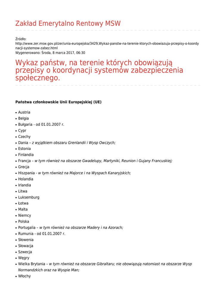Zakład Emerytalno Rentowy MSW Źródło: http://www.zer.msw.gov.pl/zer/unia-europejska/3429,Wykaz-panstw-na-terenie-ktorych-obowiazuja-przepisy-o-koordy nacji-systemow-zabez.html Wygenerowano: Środa, 8 marca 2017, 06:30 Wykaz państw, na terenie których obowiązują przepisy o koordynacji systemów zabezpieczenia społecznego. Państwa członkowskie Unii Europejskiej (UE) ● Austria ● Belgia ● Bułgaria - od 01.01.2007 r. ● Cypr ● Czechy ● Dania – z wyjątkiem obszaru Grenlandii i Wysp Owczych; ● Estonia ● Finlandia ● Francja – w tym również na obszarze Gwadelupy, Martyniki, Reunion i Gujany Francuskiej; ● Grecja ● Hiszpania - w tym również na Majorce i na Wyspach Kanaryjskich; ● Holandia ● Irlandia ● Litwa ● Luksemburg ● Łotwa ● Malta ● Niemcy ● Polska ● Portugalia – w tym również na obszarze Madery i na Azorach; ● Rumunia - od 01.01.2007 r. ● Słowenia ● Słowacja ● Szwecja ● Węgry ● Wielka Brytania – w tym również na obszarze Gibraltaru; nie obowiązują natomiast na obszarze Wysp Normandzkich oraz na Wyspie Man; ● Włochy Państwa Europejskiego Obszaru Gospodarczego (EOG), nie będące członkami Unii Europejskiej - na podstawie umowy o Europejskim Obszarze Gospodarczym: ● Islandia ● Lichtenstein ● Norwegia Szwajcaria - na podstawie umowy między Wspólnotą Europejską i Jej państwami członkowskimi z jednej strony a Konfederacją Szwajcarską z drugiej Strony w sprawie swobodnego przepływu osób, która od 1 kwietnia 2006 r. ma zastosowanie w stosunku do Polski.