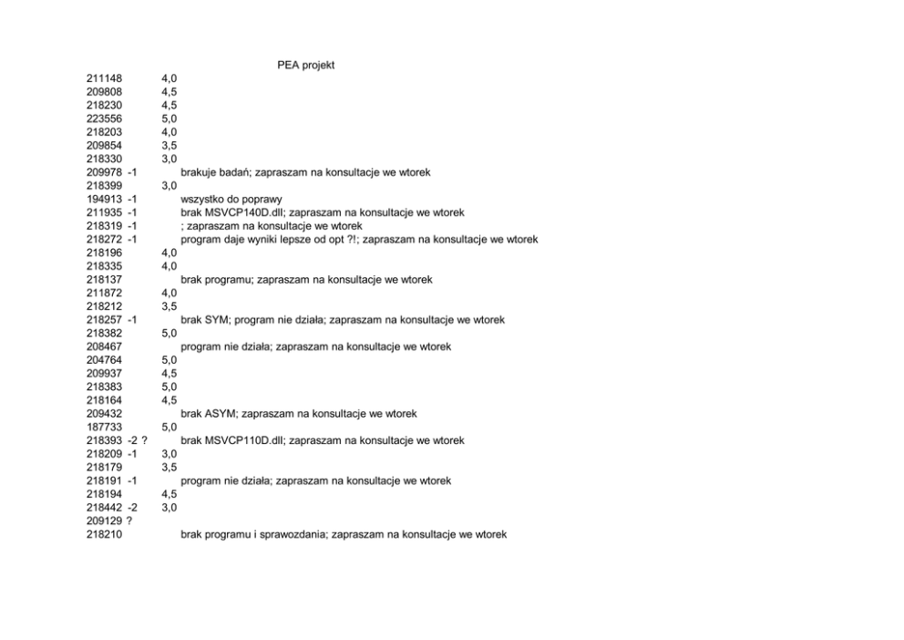 PEA projekt 211148 209808 218230 223556 218203 209854 218330 209978 218399 194913 211935 218319 218272 218196 218335 218137 211872 218212 218257 218382 208467 204764 209937 218383 218164 209432 187733 218393 218209 218179 218191 218194 218442 209129 218210 4,0 4,5 4,5 5,0 4,0 3,5 3,0 brakuje badań; zapraszam na konsultacje we wtorek -1 3,0 -1 -1 -1 -1 wszystko do poprawy brak MSVCP140D.dll; zapraszam na konsultacje we wtorek ; zapraszam na konsultacje we wtorek program daje wyniki lepsze od opt ?!; zapraszam na konsultacje we wtorek 4,0 4,0 brak programu; zapraszam na konsultacje we wtorek 4,0 3,5 brak SYM; program nie działa; zapraszam na konsultacje we wtorek -1 5,0 program nie działa; zapraszam na konsultacje we wtorek 5,0 4,5 5,0 4,5 brak ASYM; zapraszam na konsultacje we wtorek 5,0 -2 ? -1 brak MSVCP110D.dll; zapraszam na konsultacje we wtorek 3,0 3,5 program nie działa; zapraszam na konsultacje we wtorek -1 -2 ? 4,5 3,0 brak programu i sprawozdania; zapraszam na konsultacje we wtorek
