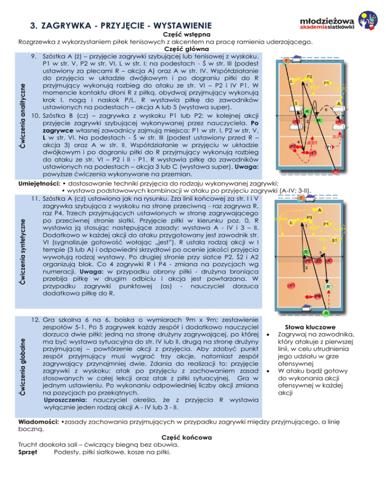 3. ZAGRYWKA - PRZYJĘCIE - WYSTAWIENIE Ćwiczenia analityczne Część wstępna Rozgrzewka z wykorzystaniem piłek tenisowych z akcentem na pracę ramienia uderzającego. Część główna 9. Szóstka A (ż) – przyjęcie zagrywki szybującej lub tenisowej z wyskoku. P1 w str. V, P2 w str. VI, L w str. I; na podestach - Ś w str. III (podest ustawiony za plecami R – akcja A) oraz A w str. IV. Współdziałanie do przyjęcia w układzie dwójkowym i po dograniu piłki do R przyjmujący wykonują rozbieg do ataku ze str. VI – P2 i IV P1. W momencie kontaktu dłoni R z piłką, obydwaj przyjmujący wykonują krok l. nogą i naskok P/L. R wystawia piłkę do zawodników ustawionych na podestach – akcja A lub 5 (wystawa super). 10. Szóstka B (cz) – zagrywka z wyskoku P1 lub P2; w kolejnej akcji przyjęcie zagrywki szybującej wykonywanej przez nauczyciela. Po zagrywce własnej zawodnicy zajmują miejsca: P1 w str. I, P2 w str. V, L w str. VI. Na podestach - Ś w str. III (podest ustawiony przed R – akcja 3) oraz A w str. II. Współdziałanie w przyjęciu w układzie dwójkowym i po dograniu piłki do R przyjmujący wykonują rozbieg do ataku ze str. VI – P2 i II - P1. R wystawia piłkę do zawodników ustawionych na podestach – akcja 3 lub C (wystawa super). Uwaga: powyższe ćwiczenia wykonywane na przemian. Ćwiczenia globalne Ćwiczenia syntetyczne Umiejętności: • dostosowanie techniki przyjęcia do rodzaju wykonywanej zagrywki; • wystawa podstawowych kombinacji w ataku po przyjęciu zagrywki (A-IV; 3-II). 11. Szóstka A (cz) ustawiona jak na rysunku. Zza linii końcowej za str. I i V zagrywka szybująca z wyskoku na stronę przeciwną - raz zagrywa R, raz P4. Trzech przyjmujących ustawionych w stronę zagrywającego po przeciwnej stronie siatki. Przyjęcie piłki w kierunku poz. 0, R wystawia ją stosując następujące zasady: wystawa A - IV i 3 – II. Dodatkowo w każdej akcji do ataku przygotowany jest zawodnik str. VI (sygnalizuje gotowość wołając „jest”). R ustala rodzaj akcji w I tempie (3 lub A) i odpowiedni skrzydłowi po ocenie jakości przyjęcia wywołują rodzaj wystawy. Po drugiej stronie przy siatce P2, Ś2 i A2 organizują blok. Co 4 zagrywki R i P4 - zmiana na pozycjach wg numeracji. Uwaga: w przypadku obrony piłki - drużyna broniąca przebija piłkę w drugim odbiciu i akcja jest powtarzana. W przypadku zagrywki punktowej (as) - nauczyciel dorzuca dodatkowa piłkę do R. 12. Gra szkolna 6 na 6, boiska o wymiarach 9m x 9m; zestawienie zespołów 5-1. Po 5 zagrywek każdy zespół i dodatkowo nauczyciel dorzuca dwie piłki: jedną na stronę drużyny zagrywającej, po której ma być wystawa sytuacyjna do str. IV lub II, drugą na stronę drużyny przyjmującej – powtórzenie akcji z przyjęcia. Aby zdobyć punkt zespół przyjmujący musi wygrać trzy akcje, natomiast zespół zagrywający przynajmniej dwie. Zdania do realizacji to: przyjęcie zagrywki z wyskoku; atak po przyjęciu z zachowaniem zasad stosowanych w całej lekcji oraz atak z piłki sytuacyjnej. Gra w jednym ustawieniu. Po wykonaniu odpowiedniej liczby akcji zmiana na pozycjach po przekątnych. Uproszczenia: nauczyciel określa, że z przyjęcia R wystawia wyłącznie jeden rodzaj akcji A - IV lub 3 - II. Słowa kluczowe Zagrywaj na zawodnika, który atakuje z pierwszej linii, w celu utrudnienia jego udziału w grze ofensywnej W ataku bądź gotowy do wykonania akcji ofensywnej w każdej akcji Wiadomości: •zasady zachowania przyjmujących w przypadku zagrywki między przyjmującego, a linię boczną. Część końcowa Trucht dookoła sali – ćwiczący biegną bez obuwia. Sprzęt Podesty, piłki siatkowe, kosze na piłki.