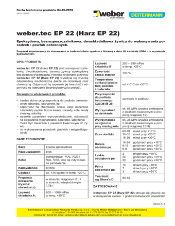 Karta techniczna produktu 04.10.2010 (DE 30.7.2009) weber.tec EP 22 (Harz EP 22) Epoksydowa, bezrozpuszczalnikowa, dwuskładnikowa żywica do wykonywania posadzek i powłok ochronnych. Preparat dopuszczony do stosowania w budownictwie zgodnie z Ustawą z dnia 16 kwietnia 2004 r. o wyrobach budowlanych. OPIS PRODUKTU weber.tec EP 22 (Harz EP 22) jest bezrozpuszczalnikową, dwuskładnikową, barwną żywicą epoksydową bez dodatku wypełniacza. Powłoka wykonana z żywicy weber.tec EP 22 (Harz EP 22) wyróżnia się wysoką odpornością mechaniczną (także na ścieranie) oraz chemiczną. Odporność tą zapewnia jej twardość i odporność na uderzenia (twardoplastyczna postać). Szczególne właściwości produktu: − bardzo dobra przyczepnością do podłoży cementowych: betonów, jastrychów, itp. − odporność na chemikalia, ścieki, oleje mineralne i materiały pędne, liczne kwasy i zasady, sole, wodę morską, solankę − wysokie parametry wytrzymałościowe, odporność na obciążenia mechaniczne, ścieranie, uderzenia − może być mieszana z piaskiem kwarcowym do żywic − do wykonywania posadzek gładkich i antypoślizgowych Lepkość składnika B 250 – 350 mPas w temp. +25°C Zawartość części stałych 100 % Temperatura aplikacji (powietrza) podłoża i materiału od +10°C do +30°C Przyczepność do podłoża betonowego C20/25 (B 25) zerwanie w podłożu Wytrzymałość na ściskanie ok. 88 MPa (żywica zmieszana z piaskiem kwarcowym w proporcji wagowej 1:2) Wytrzymałość na zginanie przy rozciąganiu ok. 38 MPa (żywica zmieszana z piaskiem kwarcowym w proporcji wagowej 1:0,5) Czas obróbki 60-70 minut przy +10°C 30-35 minut przy +20°C 15-20 minut przy +30°C Dalsza obróbka po 16-24 godzinach przy +10°C 8-12 godzinach przy +20°C 6-8 godzinach przy +30°C Lekkie obciążenie po 2 24 20 dniach przy +10°C godzinach przy +20°C godzinach przy +30°C Pełna odporność po 10 7 3 dniach przy +10°C dniach przy +20°C dniach przy +30°C Twardość wg Shore’a D 80-82 DANE TECHNICZNE Baza żywica epoksydowa Rozpuszczalnik brak Kolor standardowe - RAL 7023 i RAL 7032, inne na indywidualne zamówienie Konsystencja płynna Gęstość ok. 1,15 kg/dm3 w temp. +20°C Proporcje mieszania (żywica: utwardzacz) w stosunku wagowym 2 : 1 w stosunku objętościowym 1,75:1 ZASTOSOWANIE Lepkość składnika A: 600 – 1000 mPas w temp. +25°C weber.tec EP 22 (Harz EP 22) stosuje się głównie do wykonywania cienko- i grubowarstwowych posadzek/ Strona 1 / 4 Saint-Gobain Construction Products Polska sp. z o.o. • marka Weber Deitermann • Biuro we Wrocławiu ul. Mydlana 7; 51-502 Wrocław; tel. 71 372 85 75; fax 71 375 14 19 infolinia 801 62 00 00; email: [email protected]; www.deitermann.pl; www.netweber.pl Karta techniczna produktu 04.10.2010 (DE 30.7.2009) weber.tec EP 22 (Harz EP 22) powłok (grubość od 1 do 5 mm) na powierzchniach mocno obciążonych mechanicznie (ruch ciężki) i chemicznie, np. na posadzkach magazynów, warsztatów, hal wystawienniczych, elektrowni, mleczarni, rzeźni, laboratoriów, zakładów chemicznych, parkingów, itp. Żywica ułożona w postaci gładkiej powłoki doskonale nadaje się do utrzymania czystości oraz zabiegów odkażających powierzchnię (przemysł spożywczy, farmaceutyczny, szpitale). weber.tec EP 22 (Harz EP 22) można stosować także z dodatkiem suszonego piasku kwarcowego do żywic. WSKAZÓWKI WYKONAWCZE Podłoże Podłożem posadzki/powłoki z żywicy weber.tec EP 22 (Harz EP 22) może być: beton, jastrych cementowy, jastrych epoksydowy. W celu przygotowania podłoża betonowego mogą być stosowane metody mechaniczne – np. czyszczenie mechaniczne, frezowanie, śrutowanie, piaskowanie, oczyszczanie płomieniowe (wypalanie) lub ręczne – np. odkurzanie, szorowanie. Ubytki, wykruszenia, pustki uzupełnić np. systemami betonu naprawczego - weber.rep 752 (Cerinol ES 4), weber.rep 753 (Cerinol ES 8) lub zaprawami na spoiwie epoksydowym np. weber.tec FM 93 (Harz FM 93), szpachlą wykonaną z weber.tec EP 10 (Harz EP 10) i piasku do żywic, kierując się stanem podłoża, rodzajem i wielkością ubytków, charakterem pracy, rodzajami i wielkościami występujących obciążeń oraz parametrami wytrzymałościowymi podłoża i materiału reprofilacyjnego. Zastosowane metody przygotowania i oczyszczenia podłoża nie mogą powodować zamknięcia porów (powierzchnia podłoża nie może być zatarta na gładko). W takiej sytuacji konieczne jest uszorstnienie podłoża. Wytrzymałość podłoża na odrywanie powinna wynosić przynajmniej 1,5 MPa. Wytrzymałość podłoża na ściskanie powinna wynosić przynajmniej 25 MPa. Podłoże powinno być suche (wilgotność masowa nie wyższa niż 4%), stabilne, czyste, bez olejów i tłuszczów. Powierzchnie gładkie, spieczone, wypolerowane lub z mleczkiem cementowym nie nadają się pod powłokę, o ile nie zostaną uprzednio przygotowane/zmatowione poprzez np. piaskowanie, frezowanie itp. Powłoki bitu- miczne lub smołowe należy usunąć. Przed nakładaniem żywicy podłoże zagruntować weber.tec EP 10 (Harz EP 10), weber.tec EP 14 (Harz EP 14) lub weber.tec EP 15 (Harz EP 15 Top). Należy bezwzględnie zapoznać się z kartą techniczną żywicy stosowanej do gruntowania. Przygotowanie produktu weber.tec EP 22 (Harz EP 22) komponenty A (żywica) i B (utwardzacz) są dostarczane w odpowiednich proporcjach gotowych do użycia. Zabrania się zmieniania tych proporcji. W przypadku pojemnika „kombi”, dno górnego stożkowego pojemnika z utwardzaczem, bez jego zdejmowania z pojemnika dolnego, należy wielokrotnie przebić stalowym przebijakiem i pozwolić, aby utwardzacz w całości wypłynął do pojemnika dolnego. Po połączeniu obu komponentów należy niezwłocznie rozpocząć mieszanie za pomocą mieszadła w wolnoobrotowej wiertarce (do 300obr./min. Należy zwracać uwagę na dokładne wymieszanie składników przy ściankach i dnie pojemnika. Czas mieszania nie pow