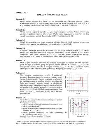 ROZDZIAŁ 2 HAŁAS W ŚRODOWISKU PRACY Zadanie 2.1 Oblicz poziom ekspozycji na hałas LEX,8h na stanowisku pracy kierowcy autobusu. Poziom równowaŜny dźwięku A podczas pracy wynosił 84 dB, a czas ekspozycji na hałas Te = 10 h. Czy została przekroczona wartość dopuszczalna NDN1.? JeŜeli tak to, o ile dB. Zadanie 2.2 Oblicz poziom ekspozycji na hałas LEX,8h na stanowisku pracy stolarza. Poziom równowaŜny dźwięku A podczas pracy na pile wynosił 87 dB, a czas ekspozycji na hałas Te = 6 h. Czy została przekroczona wartość dopuszczalna NDN1 ? JeŜeli tak, to o ile dB. Zadanie 2.3 Określ dopuszczalny czas pracy operatora szlifierki kątowej, jeŜeli poziom równowaŜny dźwięku LA,eq podczas normalnej pracy tym urządzeniem wynosi 89 dB. Zadanie 2.4 Czas pracy na taśmie montaŜowej a zarazem czas ekspozycji na hałas wynosi Te = 5 godzin. Oblicz, jaki moŜe być teoretycznie najwyŜszy równowaŜny poziom dźwięku A LA,eq na tym stanowisku oraz określ wartości LC,peak, LA,max aby nie zostały przekroczone wartości dopuszczalne NDN z uwagi na oddziaływanie hałasu dla 8-godzinnego dnia pracy Zadanie 2.5 Oceń ryzyko zawodowe spawacza stoczniowego wynikające z naraŜenia na hałas słyszalny, jeŜeli na jego stanowisku pracy szczytowy poziom dźwięku C wynosi LC,peak = 128 dB, maksymalny poziom dźwięku A osiągnął wartość LA,max = 100 dB , natomiast poziom ekspozycji na hałas odniesiony do 8- godzinnego dnia pracy jest równy LEX ,8h = 81 dB. 100 poziom dźwięku A [dB] Zadanie 2.6 Na wykresie zamieszczono wyniki 8-godzinnych pomiarów hałasu na stanowisku pracy serwisanta w stacji spręŜarek. Załączanie i wyłącznie spręŜarek, w zaleŜności od zapotrzebowania na spręŜone powietrz powoduje, Ŝe hałas ma charakter ustalony jedynie w określonych odcinkach czasu. Na podstawie danych zamieszczonych na rysunku, oblicz metodą pośrednią równowaŜny poziom dźwięku LA,eq,Te. Określ, jaki będzie poziom ekspozycji na hałas LEX,8h oraz czy został przekroczony dla tej wartości poziom NDN. 90 80 70 60 50 0 1 1 3 4 5 6 7 8 czas [h] Zadane 2.7. 100 poziom dźwięku A L A [dB] Na podstawie pomiarów hałasu zamieszczonych w postaci graficznej na rysunku: • oblicz metodą próbkowania poziom równowaŜny LA,eq, • określ czas ekspozycji Te • podaj wartości maksymalnego i minimalnego poziomu dźwięku A, LA,max , LA,min .. • określ poziom ekspozycji na hałas odniesiony 8 - godzinnego dnia pracy LEX,8h Przyjęty krok czasowy pomiaru ∆t = 600 s 2 do 95 94 89 90 85 83 85 90 88 82 80 80 84 74 75 70 65 60 1 2 3 4 5 6 7 8 9 10 numer pomiaru NDN – NajwyŜsze Dopuszczalne NatęŜenia i stęŜenia czynników szkodliwych dla zdrowia w środowisku pracy , kreślone w Rozp.. Ministra Pracy i Polityki Społecznej z dnia 29.11.2002 (DzU nr 217 poz.1833) Zadanie 2.8. W tabeli zamieszczono tygodniowe wyniki pomiarów równowaŜnego poziomu dźwięku LA,eq,Te oraz czasy ekspozycji na hałas Te na stanowisku pracy kierowcy wózka widłowego. Wyznacz poziomy ekspozycji LEX,8h dla kaŜdego dnia tygodnia oraz poziom LEX,w dla całego tygodnia. Odnieś uzyskane wyniki do wartości dopuszczalnych NDN. lp. 1 2 3 4 5 6 7 LA,eq,Te Te [dB] [h] 84 8 87 4 85 10 85 6 82 8 90 2 dzień wolny od pracy dzień tygodnia poniedziałek wtorek środa czwartek piątek sobota niedziela Zadanie 2.9. Zadanie 2.10 Określ dopuszczalny czas pracy przy frezarce, która emituje hałas ustalony o niezmiennym poziomie. Widmo oktawowe hałasu pomierzonego w miejscu gdzie przebywa pracownik przedstawiono na rysunku. poziom ciśnienia akustycznego [dB] W tabeli zamieszczono tygodniowe wyniki pomiarów równowaŜnego poziomu dźwięku LA,eq,Te oraz czasy ekspozycji na hałas Te na traktorzysty. Wyznacz poziomy ekspozycji LEX,8h dla kaŜdego dnia tygodnia oraz poziom LEX,w dla całego tygodnia. Odnieś uzyskane wyniki do wartości dopuszczalnych NDN. 100 95 90 85 80 75 70 65 60 55 50 lp. 1 2 3 4 5 6 7 dzień tygodnia poniedziałek wtorek środa czwartek piątek sobota niedziela LA,eq,Te Te [dB] [h] 87 10 dzień wolny od pracy 86 4 85 12 82 8 dzień wolny od pracy dzień wolny od pracy 90 85 85 80 80 80 75 70 70 60 31.5 63 125 250 500 1k 2k 4k 8k 16k częstotl środk. pasma okt. [Hz] Zadanie 2.11 Zakład produkcyjny ma dwie hale. Na jednej znajduje się lina produkcyjna w drugiej magazyn. Pomierzony równowaŜny poziom dźwięku A LA,eq na jego stanowisku pracy wynosi 90 dB. Szczytowy poziom dźwięku C LC,peak nie przekracza 130 dB, a maksymalny poziom dźwięku A LA,MAX wynosi 112 dB. Hałas w sąsiednim pomieszczeniu magazynowym, w którym pracownik mógłby równieŜ pracować ma charakter ustalony i wynosi 70 dB. Zaproponuj działania organizacyjne, aby wykorzystać cały ośmiogodzinny czas pracy pracownika i nie dopuścić do przekroczenia NDN.