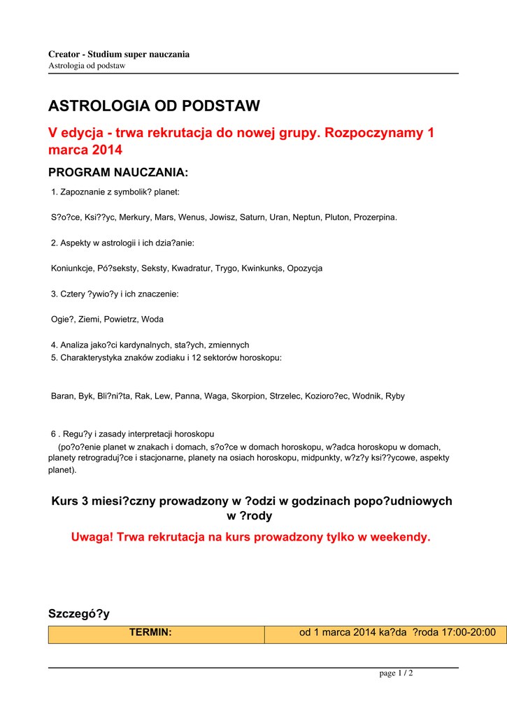 Creator - Studium super nauczania Astrologia od podstaw ASTROLOGIA OD PODSTAW V edycja - trwa rekrutacja do nowej grupy. Rozpoczynamy 1 marca 2014 PROGRAM NAUCZANIA: 1. Zapoznanie z symbolik? planet: S?o?ce, Ksi??yc, Merkury, Mars, Wenus, Jowisz, Saturn, Uran, Neptun, Pluton, Prozerpina. 2. Aspekty w astrologii i ich dzia?anie: Koniunkcje, Pó?seksty, Seksty, Kwadratur, Trygo, Kwinkunks, Opozycja 3. Cztery ?ywio?y i ich znaczenie: Ogie?, Ziemi, Powietrz, Woda 4. Analiza jako?ci kardynalnych, sta?ych, zmiennych 5. Charakterystyka znaków zodiaku i 12 sektorów horoskopu: Baran, Byk, Bli?ni?ta, Rak, Lew, Panna, Waga, Skorpion, Strzelec, Kozioro?ec, Wodnik, Ryby 6 . Regu?y i zasady interpretacji horoskopu (po?o?enie planet w znakach i domach, s?o?ce w domach horoskopu, w?adca horoskopu w domach, planety retrograduj?ce i stacjonarne, planety na osiach horoskopu, midpunkty, w?z?y ksi??ycowe, aspekty planet). Kurs 3 miesi?czny prowadzony w ?odzi w godzinach popo?udniowych w ?rody Uwaga! Trwa rekrutacja na kurs prowadzony tylko w weekendy. Szczegó?y TERMIN: od 1 marca 2014 ka?da ?roda 17:00-20:00 page 1 / 2 Creator - Studium super nauczania Astrologia od podstaw CENA: SPOSÓB REALIZACJI ZAJ??: PROWADZ?CY: MIEJSCE: ZAPISY: 120 z? za miesi?c wyk?ady i ?wiczenia Jaros?aw Gronert- astrologi? zajmuje si? od ponad 27 lat. Pierw stawia? u Leszka Weresa (twórcy polskiej szko?y astrologii). Ja Gronert naucza arkanów astrologii od 1990r. Autor podr?cz ,,Astrologia od pocz?tku" oraz ,,Strategia kosmosu". Jego role jako nauczyciela trafnie okre?la pi?ty stopie? sabia? dla jego S?o?ca urodzenowego: "Cz?owiek ukazuj?cy swoim u podstawy wewn?trznej wiedzy, na ktorej mo?e zosta? zbudowan ?wiat". http://www.jarekgronert.pl/ Akademia Zdrowia i Edukacji Twórczej "Creator" ?ó Wolno?ci 12, II p. drog? elektroniczn? lub telefoniczn?: 42 632 25 91, 512 370 212, [email protected] page 2 / 2