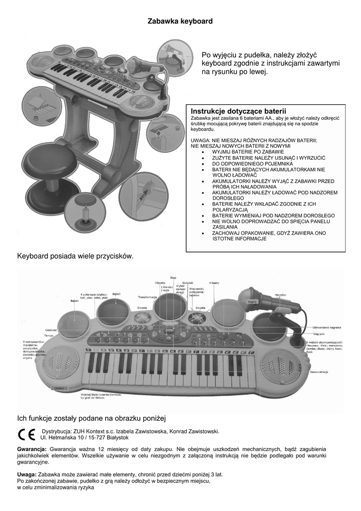 Zabawka keyboard Po wyj ciu z pudełka, nale y zło yć keyboard zgodnie z instrukcjami zawartymi na rysunku po lewej. Instrukcje dotyczące baterii Zabawka jest zasilana 6 bateriami AA., aby je wło yć nale y odkr cić śrubk mocuj c pokryw baterii znajduj c si na spodzie keyboardu. UWAżA: NIź MIźSZAJ RÓ NYCH RADZAJÓW BATźRII; NIE MIESZAJ NOWYCH BATERII Z NOWYMI WYJMIJ BATERIE PO ZABAWIE ZU YTź BATźRIź NALź Y USUN Ć I WYRZUĆIĆ DO ODPOWIEDNIEGO POJEMNIKA BATźRII NIź B D CYCH AKUMULATORKAMI NIź WOLNO ŁADOWAĆ AKUMULATORKI NALź Y WYJ Ć Z ZABAWKI PRZźD PRÓB ICH NAŁADOWANIA AKUMULATORKI NALź Y ŁADOWAĆ POD NADZORźM DOROSŁźżO BATźRIź NALź Y WKŁADAĆ ZżODNIź Z ICH POLARYZACJ BATźRIź WYMIźNIAJ POD NADZORźM DOROSŁźżO NIź WOLNO DOPROWADZAĆ DO SPI CIA PANźLU ZASILANIA ZACHOWAJ OPAKOWANIź, żDY ZAWIźRA ONO ISTOTNE INFORMACJE Keyboard posiada wiele przycisków. Ich funkcje zostały podane na obrazku poni ej Dystrybucja: ZUH Kontext s.c. Izabela Zawistowska, Konrad Zawistowski. Ul. Hetmańska 10 / 15-727 Białystok Gwarancja: żwarancja wa na 12 miesi cy od daty zakupu. Nie obejmuje uszkodzeń mechanicznych, b d zagubienia jakichkolwiek elementów. Wszelkie u ywanie w celu niezgodnym z zał czon instrukcj nie b dzie podlegało pod warunki gwarancyjne. Uwaga: Zabawka mo e zawierać małe elementy, chronić przed dziećmi poni ej 3 lat. Po zakończonej zabawie, pudełko z gr nale y odło yć w bezpiecznym miejscu, w celu zminimalizowania ryzyka KX9112