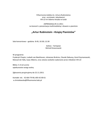 Filharmonia Łódzka im. Artura Rubinsteina oraz uczniowie i absolwenci VIII LO im Adama Asnyka w Łodzi ZAPRASZAJĄ 29.11.2011 na koncert z prezentacja multimedialną i słowem o pianiście „Artur Rubinstein –Książę Pianistów” Sala koncertowa – godzina 8.45; 10.30; 12.30 Solista – fortepian Michał Drewnowski W programie: Fryderyk Chopin, Ludwik van Beethoven, Johannes Brahms, Claude Debussy, Karol Szymanowski, Manuel de Falla, Isaac Albeniz, oraz utwory wokalne wykonane przez młodzież VIII LO Bilety: 5 zł od ucznia opiekunowie wstęp wolny Zgłoszenia przyjmujemy do 22.11.2011 Kontakt: tel.: 42 664 79 90; 693 42 00 61 [email protected]