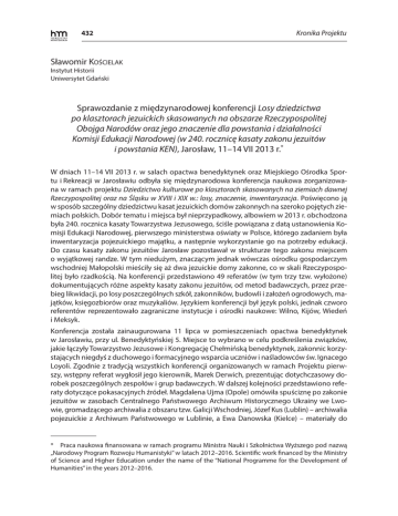 432 Kronika Projektu Sławomir Kościelak Instytut Historii Uniwersytet Gdański Sprawozdanie z międzynarodowej konferencji Losy dziedzictwa po klasztorach jezuickich skasowanych na obszarze Rzeczypospolitej Obojga Narodów oraz jego znaczenie dla powstania i działalności Komisji Edukacji Narodowej (w 240. rocznicę kasaty zakonu jezuitów i powstania KEN), Jarosław, 11–14 VII 2013 r.* W dniach 11–14 VII 2013 r. w salach opactwa benedyktynek oraz Miejskiego Ośrodka Sportu i Rekreacji w Jarosławiu odbyła się międzynarodowa konferencja naukowa zorganizowana w ramach projektu Dziedzictwo kulturowe po klasztorach skasowanych na ziemiach dawnej Rzeczypospolitej oraz na Śląsku w XVIII i XIX w.: losy, znaczenie, inwentaryzacja. Poświęcono ją w sposób szczególny dziedzictwu kasat jezuickich domów zakonnych na szeroko pojętych ziemiach polskich. Dobór tematu i miejsca był nieprzypadkowy, albowiem w 2013 r. obchodzona była 240. rocznica kasaty Towarzystwa Jezusowego, ściśle powiązana z datą ustanowienia Komisji Edukacji Narodowej, pierwszego ministerstwa oświaty w Polsce, którego zadaniem była inwentaryzacja pojezuickiego majątku, a następnie wykorzystanie go na potrzeby edukacji. Do czasu kasaty zakonu jezuitów Jarosław pozostawał w strukturze tego zakonu miejscem o wyjątkowej randze. W tym niedużym, znaczącym jednak wówczas ośrodku gospodarczym wschodniej Małopolski mieściły się aż dwa jezuickie domy zakonne, co w skali Rzeczypospolitej było rzadkością. Na konferencji przedstawiono 49 referatów (w tym trzy tzw. wyłożone) dokumentujących różne aspekty kasaty zakonu jezuitów, od metod badawczych, przez przebieg likwidacji, po losy poszczególnych szkół, zakonników, budowli i założeń ogrodowych, majątków, księgozbiorów oraz muzykaliów. Językiem konferencji był język polski, jednak czworo referentów reprezentowało zagraniczne instytucje i ośrodki naukowe: Wilno, Kijów, Wiedeń i Meksyk. Konferencja została zainaugurowana 11 lipca w pomieszczeniach opactwa benedyktynek w Jarosławiu, przy ul. Benedyktyńskiej 5. Miejsce to wybrano w celu podkreślenia związków, jakie łączyły Towarzystwo Jezusowe i Kongregację Chełmińską benedyktynek, zakonnic korzystających niegdyś z duchowego i formacyjnego wsparcia uczniów i naśladowców św. Ignacego Loyoli. Zgodnie z tradycją wszystkich konferencji organizowanych w ramach Projektu pierwszy, wstępny referat wygłosił jego kierownik, Marek Derwich, prezentując dotychczasowy dorobek poszczególnych zespołów i grup badawczych. W dalszej kolejności przedstawiono referaty dotyczące pokasacyjnych źródeł. Magdalena Ujma (Opole) omówiła spuściznę po zakonie jezuitów w zasobach Centralnego Państwowego Archiwum Historycznego Ukrainy we Lwowie, gromadzącego archiwalia z obszaru tzw. Galicji Wschodniej, Józef Kus (Lublin) – archiwalia pojezuickie z Archiwum Państwowego w Lublinie, a Ewa Danowska (Kielce) – materiały do * Praca naukowa finansowana w ramach programu Ministra Nauki i Szkolnictwa Wyższego pod nazwą „Narodowy Program Rozwoju Humanistyki” w latach 2012–2016. Scientific work financed by the Ministry of Science and Higher Education under the name of the “National Programme for the Development of Humanities” in the years 2012–2016. Kronika Projektu 433 dziejów kasaty jezuitów i początków Komisji Edukacji Narodowej znajdujące się w Bibliotece Naukowej PAU i PAN w Krakowie. W tej części obrad wygłoszono również bardziej szczegółowe referaty, dotyczące inwentarzy pojezuickiego mienia kolegium w Toruniu (Waldemar Rozynkowski, Toruń), kolegium w Starych Szkotach pod Gdańskiem (Sławomir Kościelak, Gdańsk) oraz pozostałości biblioteki i archiwum cieszyńskiej rezydencji jezuitów (Anna Rusnok, Cieszyn). Pierwszego dnia wygłoszono ponadto referaty przedstawiające okoliczności i skutki akcji kasacyjnej Towarzystwa Jezusowego. Ks. Janusz Królikowski (Tarnów) omówił reperkusje kasaty jezuitów w rozporządzeniach oficjalatu tarnowskiego, a w drugim ze swoich referatów przedstawił bullę kasacyjną papieża Klemensa XIV i inne dokumenty papieskie dotyczące wdrożenia procesu kasaty. Beata Topij-Stempińska (Kraków) ukazała problem kasaty zakonu jezuitów w historiografii polskiej XX w. Refleksjami na temat propagandowego wyzyskania rocznicy kasaty zakonu jezuitów i powstania KEN-u w okresie PRL-u (w ramach obchodów 200. rocznicy powstania KEN-u) podzieliła się Agata Wdowik (Warszawa). Kontekst kasaty domów jezuickich na tle dziejów poszczególnych placówek przedstawili natomiast ks. Wojciech Zawadzki (Warszawa), który omówił dzieje rezydencji malborskiej w latach 1618–1780, oraz Anna Szylar (Tarnobrzeg), która scharakteryzowała kontakty i współpracę jezuitów i benedyktynek w Sandomierzu. Drugi dzień obrad (12 lipca) rozpoczął blok referatów poświęconych losom szkół pojezuickich. Otworzył go referat o. Ludwika Grzebienia SJ, nestora historyków jezuickich w Polsce, z powodu choroby księdza profesora odczytany przez organizatorów. Dotyczył on historiografii poświęconej Komisji Edukacji Narodowej w ostatnim 50-leciu, a zatem w okresie PRL-u (zwłaszcza po odwilży październikowej 1965 r.) oraz w pierwszych latach Trzeciej Rzeczypospolitej. Losy budynków szkolnych przejętych przez Komisję Edukacji Narodowej na obszarze całej Rzeczypospolitej ukazał Ryszard Mączyński (Toruń). Roman Pelczar (Stalowa Wola) zajął się szkołami jezuickimi z terenu województwa ruskiego, Maciej Zdanek (Kraków) – rywalizującym niegdyś z Akademią Krakowską kolegium jezuitów w Krakowie, a Michał Nowicki (Poznań) – erygowaną na kanwie skasowanego kolegium w Poznaniu szkołą średnią. W referacie Dariusza Rolnika (Katowice) znalazło się omówienie pamiętnikarskich odnotowań o nauczaniu zakonnym za czasów Stanisława Augusta w Rzeczypospolitej. Z kolei Ewa Ziółek (Lublin) przedstawiła zas