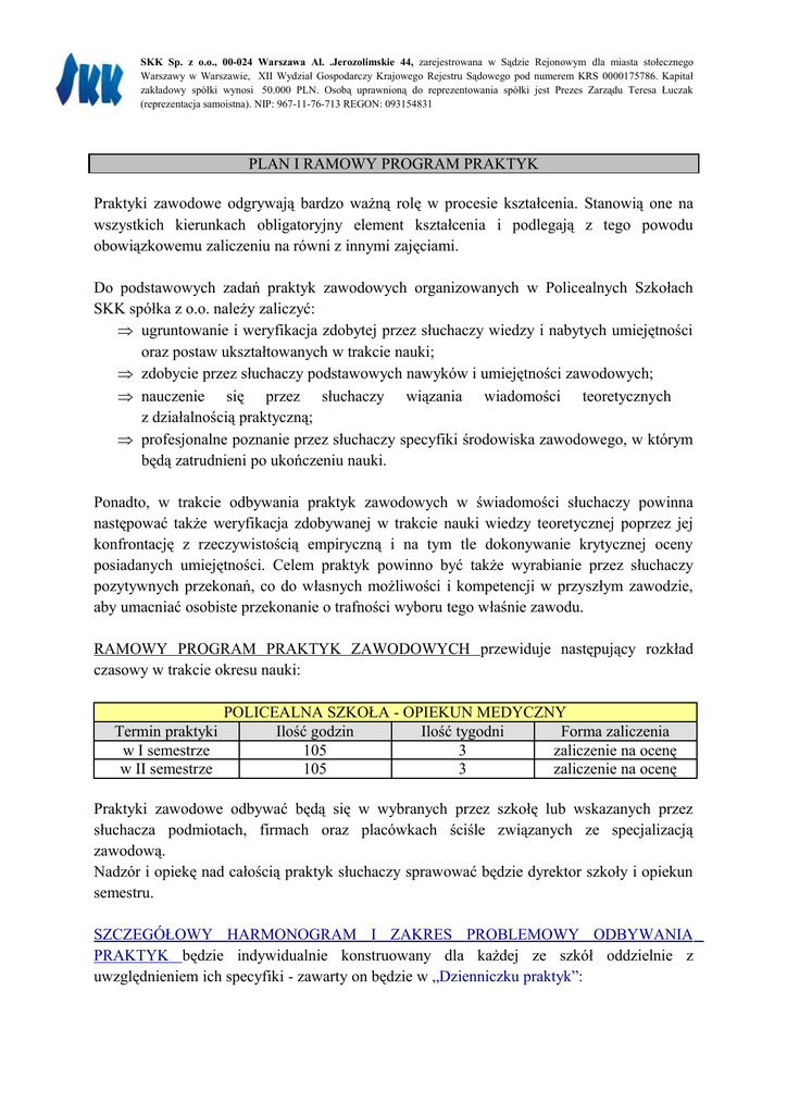 SKK Sp. z o.o., 00-024 Warszawa Al. .Jerozolimskie 44, zarejestrowana w Sądzie Rejonowym dla miasta stołecznego Warszawy w Warszawie, XII Wydział Gospodarczy Krajowego Rejestru Sądowego pod numerem KRS 0000175786. Kapitał zakładowy spółki wynosi 50.000 PLN. Osobą uprawnioną do reprezentowania spółki jest Prezes Zarządu Teresa Łuczak (reprezentacja samoistna). NIP: 967-11-76-713 REGON: 093154831 PLAN I RAMOWY PROGRAM PRAKTYK Praktyki zawodowe odgrywają bardzo ważną rolę w procesie kształcenia. Stanowią one na wszystkich kierunkach obligatoryjny element kształcenia i podlegają z tego powodu obowiązkowemu zaliczeniu na równi z innymi zajęciami. Do podstawowych zadań praktyk zawodowych organizowanych w Policealnych Szkołach SKK spółka z o.o. należy zaliczyć: ⇒ ugruntowanie i weryfikacja zdobytej przez słuchaczy wiedzy i nabytych umiejętności oraz postaw ukształtowanych w trakcie nauki; ⇒ zdobycie przez słuchaczy podstawowych nawyków i umiejętności zawodowych; ⇒ nauczenie się przez słuchaczy wiązania wiadomości teoretycznych z działalnością praktyczną; ⇒ profesjonalne poznanie przez słuchaczy specyfiki środowiska zawodowego, w którym będą zatrudnieni po ukończeniu nauki. Ponadto, w trakcie odbywania praktyk zawodowych w świadomości słuchaczy powinna następować także weryfikacja zdobywanej w trakcie nauki wiedzy teoretycznej poprzez jej konfrontację z rzeczywistością empiryczną i na tym tle dokonywanie krytycznej oceny posiadanych umiejętności. Celem praktyk powinno być także wyrabianie przez słuchaczy pozytywnych przekonań, co do własnych możliwości i kompetencji w przyszłym zawodzie, aby umacniać osobiste przekonanie o trafności wyboru tego właśnie zawodu. RAMOWY PROGRAM PRAKTYK ZAWODOWYCH przewiduje następujący rozkład czasowy w trakcie okresu nauki: POLICEALNA SZKOŁA - OPIEKUN MEDYCZNY Termin praktyki Ilość godzin Ilość tygodni Forma zaliczenia w I semestrze 105 3 zaliczenie na ocenę w II semestrze 105 3 zaliczenie na ocenę Praktyki zawodowe odbywać będą się w wybranych przez szkołę lub wskazanych przez słuchacza podmiotach, firmach oraz placówkach ściśle związanych ze specjalizacją zawodową. Nadzór i opiekę nad całością praktyk słuchaczy sprawować będzie dyrektor szkoły i opiekun semestru. SZCZEGÓŁOWY HARMONOGRAM I ZAKRES PROBLEMOWY ODBYWANIA PRAKTYK będzie indywidualnie konstruowany dla każdej ze szkół oddzielnie z uwzględnieniem ich specyfiki - zawarty on będzie w „Dzienniczku praktyk”: SZCZEGÓŁOWE CELE KSZTAŁCENIA W POLICEALNEJ SZKOLE OPIEKUNÓW MEDYCZNYCH W wyniku procesu kształcenia uczeń (słuchacz) powinien umieć: określić strukturę organizacyjną wybranych placówek, nawiązać i podtrzymać kontakt z chorym i jego rodziną, udzielić wsparcia emocjonalnego choremu i jego rodzinie w trudnej sytuacji, ocenić zapotrzebowanie chorego na pomoc w zaspakajaniu potrzeb biologicznych, ocenić stan higieniczny chorego, włączyć się do planowania opieki nad osobą chorą i niesamodzielną, dobrać materiały, środki, przybory i sprzęt do wykonywania zabiegów higienicznych, udzielić pomocy choremu w wykonywaniu czynności dnia codziennego, wykonać zabiegi higieniczne związane z utrzymaniem ciała chorego w czystości, wykonać zabiegi higieniczne związane z utrzymaniem higieny otoczenia chorego, udzielić pomocy osobie chorej i niesamodzielnej w czynnościach związanych z wydalaniem, udzielić pomocy osobie chorej i niesamodzielnej w zmianie pozycji i przemieszczaniu się, zapewnić osobie chorej i niesamodzielnej wygodne i bezpieczne ułożenie w łóżku, udzielić pomocy osobie chorej i niesamodzielnej w posługiwaniu się przedmiotami ortopedycznymi, udzielić pomocy osobie chorej i niesamodzielnej w korzystaniu ze sprzętu rehabilitacyjnego, udzielić pomocy osobie chorej i niesamodzielnej podczas spożywania posiłków, zaobserwować zaburzenia w funkcjonowaniu układów i narządów, wykonać zlecone zabiegi przeciwzapalne, zapewnić osobie chorej i niesamodzielnej bezpieczeństwo podczas wykonywania zabiegów higienicznych. Materiał nauczania 1. Opieka nad chorym w stacjonarnych zakładach opieki zdrowotnej Zapoznanie uczniów ze strukturą organizacyjną szpitala. Nawiązywanie i utrzymywanie kontaktu z chorymi, pomoc osobie chorej w komunikowaniu się z personelem medycznym, rodziną i pacjentami. Udzielanie pomocy osobie chorej i niesamodzielnej w zaspakajaniu potrzeb higienicznych (toaleta ciała, mycie głowy i czesanie włosów, toaleta jamy ustnej, zmiana bielizny osobistej). Asystowanie pielęgniarce w wykonywaniu zabiegów higienicznych u ciężko chorego. Asystowanie pielęgniarce w wykonywaniu zabiegów pielęgniarskich. Udzielanie pomocy osobie chorej i niesamodzielnej w zaspakajaniu potrzeb fizjologicznych (podanie basenu, kaczki, zmiana pampersów, opróżnienie worka z moczem). Obserwacja wydalin i wydzielin. Udzielanie pomocy osobie chorej i niesamodzielnej w zaspakajaniu potrzeb związanych z odżywianiem - karmienie i pojenie chorego, przygotowanie posiłków do spożycia. 2 Udzielanie pomocy osobie chorej i niesamodzielnej w utrzymaniu estetycznego wyglądu łóżka i najbliższego otoczenia - zmiana bielizny pościelowej, słanie łóżka, mycie szafek przyłóżkowych. Udzielanie pomocy osobie chorej i niesamodzielnej w utrzymaniu aktywności ruchowej - zmiana pozycji chorego w łóżku, stosowanie sprzętu ślizgowego, pomoc przy wstawaniu z łóżka, pomoc choremu w przemieszczaniu z łóżka na wózek, transport chorego, stosowanie podnośników, przedmiotów ortopedycznych, sprzętu rehabilitacyjnego. Zabezpieczenie chorego przed wypadnięciem z łóżka - stosowanie drabinek i innych zabezpieczeń. Oferowanie podopiecznemu różnych form spędzania czasu wolnego. Dokumentacja wykonanych zabiegów higieniczno - pielęgnacyjnych. Organizacja pracy własnej ~ dobór materiałów, środków, przyborów i sprzętu.