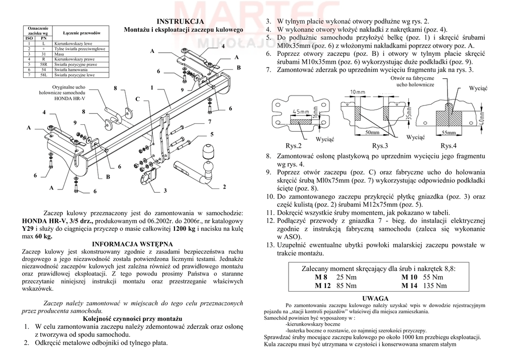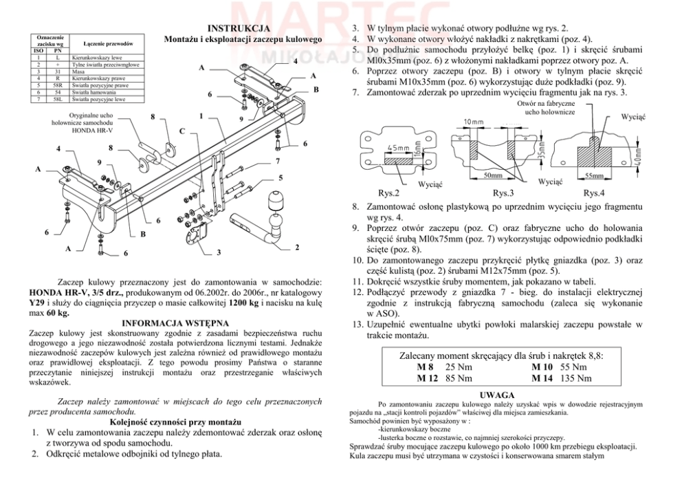 INSTRUKCJA Oznaczenie zacisku wg ISO PN 1 L 2 + 3 31 4 R 5 58R 6 54 7 58L MontaŜu i eksploatacji zaczepu kulowego Łączenie przewodów Kierunkowskazy lewe Tylne światła przeciwmgłowe Masa Kierunkowskazy prawe Światła pozycyjne prawe Światła hamowania Światła pozycyjne lewe 4 A A B 6 Oryginalne ucho holownicze samochodu HONDA HR-V Otwór na fabryczne ucho holownicze 1 8 C 6 7 9 A 50mm 5 Wyciąć 8. 6 6 9. B A Wyciąć 9 8 4 3. W tylnym płacie wykonać otwory podłuŜne wg rys. 2. 4. W wykonane otwory włoŜyć nakładki z nakrętkami (poz. 4). 5. Do podłuŜnic samochodu przyłoŜyć belkę (poz. 1) i skręcić śrubami Ml0x35mm (poz. 6) z włoŜonymi nakładkami poprzez otwory poz. A. 6. Poprzez otwory zaczepu (poz. B) i otwory w tylnym płacie skręcić śrubami M10x35mm (poz. 6) wykorzystując duŜe podkładki (poz. 9). 7. Zamontować zderzak po uprzednim wycięciu fragmentu jak na rys. 3. 6 3 2 Zaczep kulowy przeznaczony jest do zamontowania w samochodzie: HONDA HR-V, 3/5 drz., produkowanym od 06.2002r. do 2006r., nr katalogowy Y29 i słuŜy do ciągnięcia przyczep o masie całkowitej 1200 kg i nacisku na kulę max 60 kg. INFORMACJA WSTĘPNA Zaczep kulowy jest skonstruowany zgodnie z zasadami bezpieczeństwa ruchu drogowego a jego niezawodność została potwierdzona licznymi testami. JednakŜe niezawodność zaczepów kulowych jest zaleŜna równieŜ od prawidłowego montaŜu oraz prawidłowej eksploatacji. Z tego powodu prosimy Państwa o staranne przeczytanie niniejszej instrukcji montaŜu oraz przestrzeganie właściwych wskazówek. Zaczep naleŜy zamontować w miejscach do tego celu przeznaczonych przez producenta samochodu. Kolejność czynności przy montaŜu 1. W celu zamontowania zaczepu naleŜy zdemontować zderzak oraz osłonę z tworzywa od spodu samochodu. 2. Odkręcić metalowe odbojniki od tylnego płata. 10. 11. 12. 13. Wyciąć 55mm Rys.2 Rys.3 Rys.4 Zamontować osłonę plastykową po uprzednim wycięciu jego fragmentu wg rys. 4. Poprzez otwór zaczepu (poz. C) oraz fabryczne ucho do holowania skręcić śrubą Ml0x75mm (poz. 7) wykorzystując odpowiednio podkładki ścięte (poz. 8). Do zamontowanego zaczepu przykręcić płytkę gniazdka (poz. 3) oraz część kulistą (poz. 2) śrubami M12x75mm (poz. 5). Dokręcić wszystkie śruby momentem, jak pokazano w tabeli. Podłączyć przewody z gniazdka 7 - bieg. do instalacji elektrycznej zgodnie z instrukcją fabryczną samochodu (zaleca się wykonanie w ASO). Uzupełnić ewentualne ubytki powłoki malarskiej zaczepu powstałe w trakcie montaŜu. Zalecany moment skręcający dla śrub i nakrętek 8,8: M 8 25 Nm M 10 55 Nm M 12 85 Nm M 14 135 Nm UWAGA Po zamontowaniu zaczepu kulowego naleŜy uzyskać wpis w dowodzie rejestracyjnym pojazdu na „stacji kontroli pojazdów” właściwej dla miejsca zamieszkania. Samochód powinien być wyposaŜony w : -kierunkowskazy boczne -lusterka boczne o rozstawie, co najmniej szerokości przyczepy. Sprawdzać śruby mocujące zaczepu kulowego po około 1000 km przebiegu eksploatacji. Kula zaczepu musi być utrzymana w czystości i konserwowana smarem stałym PPUH AUTO-HAK S.J. WyposaŜenie zaczepu: Produkcja Zaczepów Kulowych Henryk & Zbigniew Nejman 76-200 SŁUPSK ul. Słoneczna 16K tel/fax (059) 8-414-414; 8-414-413 E-mail: [email protected] www. autohak.com.pl Zaczep kulowy bez wyposaŜenia elektrycznego Y29 Klasa: A50-X Nr kat. Przeznaczony do zamontowania w samochodzie: Producent: HONDA Model: HR-V Typ: 3/5 drz. produkowanym od 06.2002r. do 2006r. Dane techniczne: Wartość siły D : 6,83 kN maksymalna masa przyczepy: 1200 kg maksymalny nacisk na kulę: 60 kg Numer homologacji zgodnie z wytycznymi regulaminu EKG/ONZ 55.01: E20-55R-01 1032 KARTA GWARANCYJNA Producent udziela gwarancji niniejszą kartą gwarancyjną na okres 24 miesięcy licząc od dnia zakupu zaczepu kulowego do samochodu: HONDA HR-V, 3/5 drz. produkowanego od 06.2002r. do 2006r. Data produkcji .............................. Data zakupu.................................. Zakres gwarancji obejmuje wyłącznie wady jakościowe wynikające z winy producenta. Gwarancja nie obejmuje natomiast uszkodzeń zawinionych przez nabywcę, wynikających z niewłaściwego montaŜu, uŜytkowania lub konserwacji, uszkodzeń mechanicznych, normalnego zuŜycia podczas eksploatacji itp. Gwarancja udzielona na zakupiony towar nie wyłącza, nie ogranicza ani nie zawiesza uprawnień kupującego wynikających z niezgodności towaru z umową. Reklamacje naleŜy zgłaszać w punkcie sprzedaŜy, składając jednocześnie kartę gwarancyjną. Usunięcie "wady" następuje po stwierdzeniu przez punkt sprzedaŜy wspólnie z producentem słuszności złoŜonej reklamacji. Reklamacja powinna być załatwiona w ciągu 14 dni od dnia uznania reklamacji. Karta gwarancyjna jest niewaŜna jeŜeli nie jest wypełniona i podpisana. Data zgłoszenia reklamacji: ................................................................... INFORMACJA WSTĘPNA Zaczep kulowy jest skonstruowany zgodnie z zasadami bezpieczeństwa ruchu drogowego. Zaczep kulowy jest elementem wpływającym na bezpieczeństwo jazdy i moŜe zostać zainstalowany wyłącznie przez personel wyspecjalizowany. Niedopuszczalne jest dokonywanie jakichkolwiek zmian w konstrukcji zaczepu. Powoduje to wygaśniecie dopuszczenia do stosowania. W przypadku obecności masy izolacyjnej lub osłony podwozia w miejscu przylegania zaczepu, naleŜy ją usunąć. Nieosłonięte miejsca karoserii oraz wywiercone otwory naleŜy pomalować farbą antykorozyjną. Informacjami wiąŜącymi odnośnie wartości obciąŜeń są dane podawane przez producenta samochodu, względnie wartości maksymalnej masy przyczepy oraz maksymalnego nacisku na kulę, przy czym wartości parametrów zaczepu kulowego nie mogą być przekroczone. Wzór do obliczania wartości siły D: Maks. masa przyczepy [kg] x Maks. masa samochodu [kg] Maks. masa przyczepy [kg] + Maks. masa samochodu [kg] X 9,81 = 1000 D [kN]