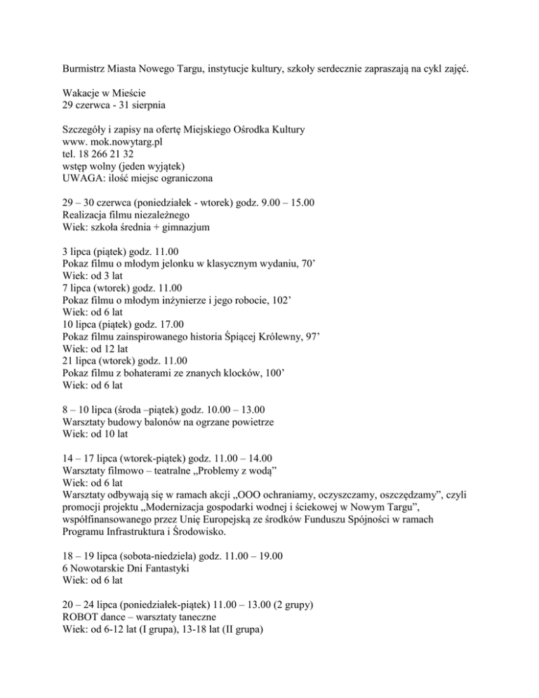Burmistrz Miasta Nowego Targu, instytucje kultury, szkoły serdecznie zapraszają na cykl zajęć. Wakacje w Mieście 29 czerwca - 31 sierpnia Szczegóły i zapisy na ofertę Miejskiego Ośrodka Kultury www. mok.nowytarg.pl tel. 18 266 21 32 wstęp wolny (jeden wyjątek) UWAGA: ilość miejsc ograniczona 29 – 30 czerwca (poniedziałek - wtorek) godz. 9.00 – 15.00 Realizacja filmu niezależnego Wiek: szkoła średnia + gimnazjum 3 lipca (piątek) godz. 11.00 Pokaz filmu o młodym jelonku w klasycznym wydaniu, 70’ Wiek: od 3 lat 7 lipca (wtorek) godz. 11.00 Pokaz filmu o młodym inżynierze i jego robocie, 102’ Wiek: od 6 lat 10 lipca (piątek) godz. 17.00 Pokaz filmu zainspirowanego historia Śpiącej Królewny, 97’ Wiek: od 12 lat 21 lipca (wtorek) godz. 11.00 Pokaz filmu z bohaterami ze znanych klocków, 100’ Wiek: od 6 lat 8 – 10 lipca (środa –piątek) godz. 10.00 – 13.00 Warsztaty budowy balonów na ogrzane powietrze Wiek: od 10 lat 14 – 17 lipca (wtorek-piątek) godz. 11.00 – 14.00 Warsztaty filmowo – teatralne „Problemy z wodą” Wiek: od 6 lat Warsztaty odbywają się w ramach akcji „OOO ochraniamy, oczyszczamy, oszczędzamy”, czyli promocji projektu „Modernizacja gospodarki wodnej i ściekowej w Nowym Targu”, współfinansowanego przez Unię Europejską ze środków Funduszu Spójności w ramach Programu Infrastruktura i Środowisko. 18 – 19 lipca (sobota-niedziela) godz. 11.00 – 19.00 6 Nowotarskie Dni Fantastyki Wiek: od 6 lat 20 – 24 lipca (poniedziałek-piątek) 11.00 – 13.00 (2 grupy) ROBOT dance – warsztaty taneczne Wiek: od 6-12 lat (I grupa), 13-18 lat (II grupa) 20 – 23 lipca (poniedziałek – czwartek) 9.30 – 11.30 (2 grupy) Warsztaty plastyczne EKO LATO Wiek: od 2-5 lat z Rodzicem (I grupa), od 6-12 lat (II grupa) 4, 11, 18, 25 sierpnia (środy) godz. 17.00 – 19.00 (2 grupy) 8, 29 sierpnia (soboty) godz. 15.00 – 17.00 (2 grupy) Jiu-jitsu dla każdego Wiek: od 5-12 lat (I grupa), od 13-18 lat (II grupa) 11 – 13 sierpnia (wtorek – czwartek) godz. 9.00 – 14.00 Wakacje z kreatywną technologią (robotyka dla dzieci i młodzieży) Wiek: od 6 lat UWAGA: odpłatność 30zł za cykl 21 – 23 sierpnia (piątek – niedziela) godz. 12.00 – 19.00 Program rodzinny na XV Jarmarku Podhalańskim 26 – 27 sierpnia (środa – czwartek) godz. 9.00 – 10.00 Mini Akademia – przyjdź i sprawdź (zajęcia pokazowe) Wiek: Od 1,5 roku do 5 lat oraz Rodzic Muzeum Podhalańskim im. Czesława Pajerskiego, Rynek 1, szczegóły: www.muzeum.nowytarg.pl, tel. 18 266 77 76 Wystawy stałe: „Nowy Targ na przełomie XIX i XX wieku, miasto którego, już nie ma” „Jan Paweł II - Miasto Nowy Targ, przeszłość i obecność” Wystawa czasowa: „Mieszkańcy kamieniczek nowotarskiego rynku na przełomie XIX i XX wieku” Wystawy czynne: poniedziałki 10.00 – 18.00, wtorki - piątki 8.00 – 16.00 Bilety: ulgowy: 2,50 zł, normalny: 4,00 zł 11 sierpnia (wtorek) godz. 17.00 Wykład mgr Małgorzaty Międzybrodzkiej, kierownika Działu Historycznego Muzeum Żup Krakowskich w Wieliczce pt. „Handel solą w dawnej Polsce. Nowy Targ - miasto na solnym szlaku”, Wstęp wolny 21 – 23 sierpnia (piątek – niedziela) Wystawa plenerowa „Jarmark w Nowym Targu” oraz Skansen – ekspozycja muzealna sprzętów gospodarczych ze zbiorów Muzeum Podhalańskiego. Urząd Miasta poleca: Turniej Streetballa, Trenerzy osiedlowi, Wakacje w siodle szczegóły: www.nowytarg.pl, tel. 18 261 12 35 29 czerwca (poniedziałek) – 10 lipca (piątek) godz. 9.00 – 14.00 Półkolonie profilaktyczne w szkołach podstawowych Szkoła Podstawowa nr 2 im. Mikołaja Kopernika szczegóły: www.sp2.nowytarg.pl, tel. 18 266 27 96 Szkoła Podstawowa nr 5 im. Konfederacji Tatrzańskiej szczegóły: www.sp5.nowytarg.pl, tel. 18 266 25 74 Szkoła Podstawowa nr 11 im. Żołnierzy Armii Krajowej szczegóły: www.sp11.nowytarg.pl, tel. 18 26 649 31 Spółdzielczy Dom Kultury zaprasza ul. Kopernika 12, szczegóły: www.sdk.nsmnt.pl, tel. 18 266 51 33 wstęp wolny 6, 13, 20, 27 lipca (poniedziałki) godz. 15.00 – 16.00 Dni otwarte z Zumbą 1, 8, 15 lipca (środy) godz. 18.15 – 19.15 Pokaz jogi, oraz darmowe zajęcia jogi łagodnej dla kręgosłupa 1, 8, 15, 22, 29 (środy) godz. 17.00 – 18.00 Karate dla dzieci 3, 10, 17, 24, 31 lipca oraz 7, 14, 21, 28 sierpnia (piątki) godz. 15.00 – 17.00 Dancehall - zajęcia otwarte 22, 29 lipca oraz 5, 12, 19, 26 sierpnia (środy) godz. 12.00 – 14.00 Klub karaoke 7, 14, 21, 28 lipca oraz 4, 11, 18, 25 sierpnia (wtorki) godz. 12.00 – 14.00 Gry planszowe, rzutki 6, 13, 20, 27 lipca oraz 3, 10, 17, 24, 31 sierpnia (poniedziałki) godz. 12.00 – 14.00 Klub gier i zabaw 23, 24, 30, 31 lipca oraz 6, 7, 13, 14, 20, 21, 27, 28 sierpnia (czwartki i piątki) godz. 12.00 – 14.00 Zajęcia plastyczne"Malowane lato" od 23 lipca czwartki, piątki godz. 12 -14 25 sierpnia ( wtorek ) godz. 10.00 Zawody sportowe dla dzieci ( strzał na bramkę, rzut do kosza, hula - hop ) GALERIA SZTUKI BWA JATKI w Nowym Targu Oddział Małopolskiego Centrum Kultury SOKÓŁ w Nowym Sączu zaprasza ul. Kościuszki 4, szczegóły: tel. 18 266 94 82 27 czerwca – 1 sierpnia Wystawa „ADAM BRZOZA – fotografia krajobraz górski” Zdjęcia laureata Międzynarodowe Konkursu Fotograficznego im. Jana Sunderlanda "Krajobraz Górski 2014" Wernisaż 27 czerwca (sobota) godz. 18.00 wernisaż wstęp wolny, w trakcie trwania wystawy: bilet ulgowy – 1 zł, bilet normalny – 2 zł Sierpień 2015 Wystawa „RÓŻANIEC – Jacek Hajnos” (grafika) „cykl portretów osób bezdomnych pt. RÓŻANIEC jest próbą uzewnętrznienia środowiska i relacji z tymi osobami” wernisaż wstęp wolny, w trakcie trwania wystawy: bilet ulgowy – 1 zł, bilet normalny – 2 zł Letnie zajęcia dla dzieci na pływalni miejskiej Terminy turnusów: 6-17 lipca, 20-31 lipca, 3-14 sierpnia, 17-28 sierpnia Turnus obejmuje 3 zajęcia tygodniowo, tj. poniedziałek, środa, piątek w go