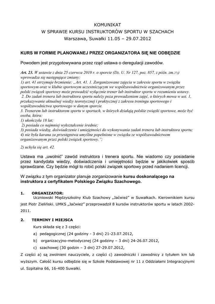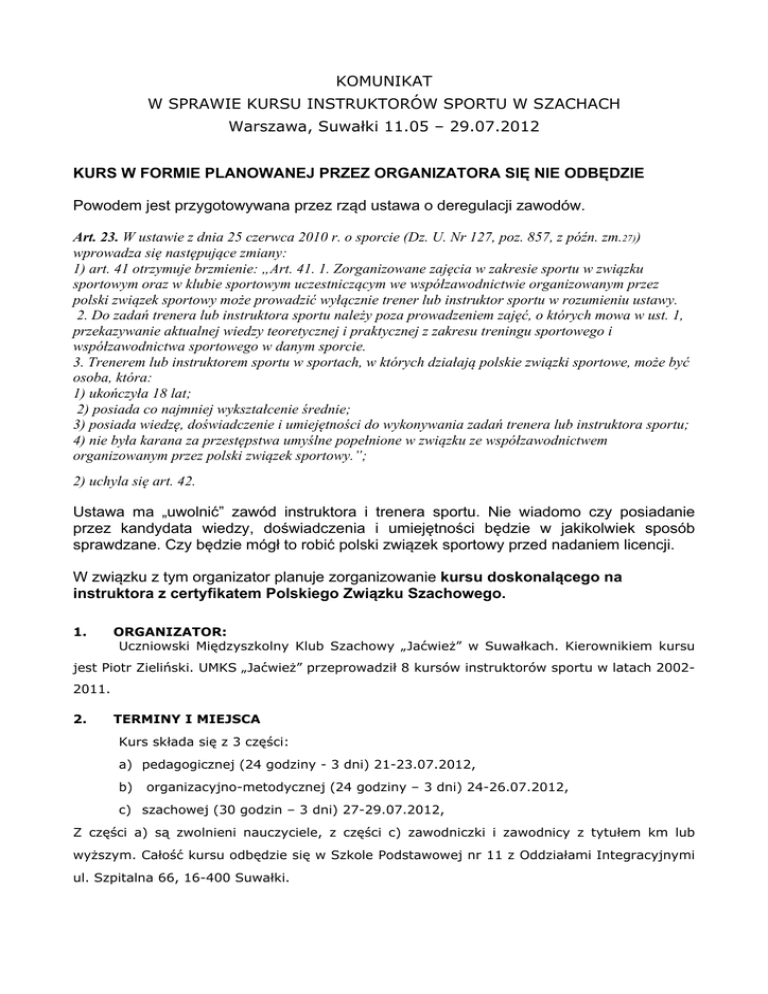 KOMUNIKAT W SPRAWIE KURSU INSTRUKTORÓW SPORTU W SZACHACH Warszawa, Suwałki 11.05 – 29.07.2012 KURS W FORMIE PLANOWANEJ PRZEZ ORGANIZATORA SIĘ NIE ODBĘDZIE Powodem jest przygotowywana przez rząd ustawa o deregulacji zawodów. Art. 23. W ustawie z dnia 25 czerwca 2010 r. o sporcie (Dz. U. Nr 127, poz. 857, z późn. zm.27)) wprowadza się następujące zmiany: 1) art. 41 otrzymuje brzmienie: „Art. 41. 1. Zorganizowane zajęcia w zakresie sportu w związku sportowym oraz w klubie sportowym uczestniczącym we współzawodnictwie organizowanym przez polski związek sportowy może prowadzić wyłącznie trener lub instruktor sportu w rozumieniu ustawy. 2. Do zadań trenera lub instruktora sportu należy poza prowadzeniem zajęć, o których mowa w ust. 1, przekazywanie aktualnej wiedzy teoretycznej i praktycznej z zakresu treningu sportowego i współzawodnictwa sportowego w danym sporcie. 3. Trenerem lub instruktorem sportu w sportach, w których działają polskie związki sportowe, może być osoba, która: 1) ukończyła 18 lat; 2) posiada co najmniej wykształcenie średnie; 3) posiada wiedzę, doświadczenie i umiejętności do wykonywania zadań trenera lub instruktora sportu; 4) nie była karana za przestępstwa umyślne popełnione w związku ze współzawodnictwem organizowanym przez polski związek sportowy.”; 2) uchyla się art. 42. Ustawa ma „uwolnić” zawód instruktora i trenera sportu. Nie wiadomo czy posiadanie przez kandydata wiedzy, doświadczenia i umiejętności będzie w jakikolwiek sposób sprawdzane. Czy będzie mógł to robić polski związek sportowy przed nadaniem licencji. W związku z tym organizator planuje zorganizowanie kursu doskonalącego na instruktora z certyfikatem Polskiego Związku Szachowego. 1. ORGANIZATOR: Uczniowski Międzyszkolny Klub Szachowy „Jaćwież” w Suwałkach. Kierownikiem kursu jest Piotr Zieliński. UMKS „Jaćwież” przeprowadził 8 kursów instruktorów sportu w latach 20022011. 2. TERMINY I MIEJSCA Kurs składa się z 3 części: a) pedagogicznej (24 godziny - 3 dni) 21-23.07.2012, b) organizacyjno-metodycznej (24 godziny – 3 dni) 24-26.07.2012, c) szachowej (30 godzin – 3 dni) 27-29.07.2012, Z części a) są zwolnieni nauczyciele, z części c) zawodniczki i zawodnicy z tytułem km lub wyższym. Całość kursu odbędzie się w Szkole Podstawowej nr 11 z Oddziałami Integracyjnymi ul. Szpitalna 66, 16-400 Suwałki. 3. ZGŁOSZENIA Do 25 czerwca 2012 na adres [email protected] Na kurs mogą zgłaszać się obywatele polscy, pełnoletni, z minimum średnim wykształceniem. Dodatkowym warunkiem jest posiadanie przynajmniej III kategorii szachowej. 4. OPŁATY Cały kurs 700 zł, części a) i b) po 200 zł, część c) 300 zł. Można wpłacać po uzyskaniu potwierdzenia przyjęcia na kurs na konto UMKS Jaćwież 02 9367 0007 0010 0010 6542 0001. 5. ZAKWATEROWANIE, WYŻYWIENIE: - Internat ZSE ul. Ogrodowa, pokoje 2-3 os, 1000 m od miejsca zajęć, 20zł/nocl. - Noclegi w szkole (łóżko polowe lub materac, własny śpiwór), darowizna na konto Rady Rodziców w wysokości 10zł/nocleg. - Obiady w miejscu zajęć w cenie 15 zł/obiad. - Zapewniamy nieodpłatnie kawę i herbatę. /-/ Piotr Zieliński
