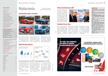 4 | AKTUALNOŚCI | WYDARZENIA Spis treści AKTUALNOŚCI: Wydarzenia................................................ 4 Nowości rynkowe...................................... 46 MOTORYZACJA DZIŚ Przyszłość dla chemii . i chemia dla przyszłości............................... 8 Wydarzenia WYDARZENIA | AKTUALNOŚCI | Nissens wyróżniony przez ADI Więcej na stronie: www.e-autonaprawa.pl XII Konferencja „Stacje Kontroli . Pojazdów – 2016”: Dyrektywa „45” . – stan przygotowań do unifikacji................. 12 CNG przyszłością motoryzacji?.................... 26 III Kongres Ekspertów Samochodowych:. Warto wiedzieć więcej............................... 42 PRAKTYKA WARSZTATOWA Szkolenia firmy Le-Gum Zestawy diagnostyczne Delphi.................... 14 Naprawy powypadkowe............................. 36 Zamienne dwumasowe koła . zamachowe LuK ...................................... 39 Fot. Nissens DODATEK SPECJALNY: OSPRZĘT SILNIKÓW Wymiana napędu rozrządu w silniku. Forda Focusa 2.0 l 16 V............................ 18 Prawidłowy montaż pompy . układu chłodzenia..................................... 22 Nowe uszczelnienia pomp cieczy . chłodzącej................................................ 24 Nowoczesne świece zapłonowe.................. 25 TECHNICZNE PODSTAWY ZAWODU Klocki hamulcowe przyjazne . dla środowiska.......................................... 30 Amortyzatory regulowane (cz.VIII): Amortyzatory z płynem . magnetoreologicznym................................ 32 EKONOMIA, BIZNES, MARKETING Zaprosili nas Grupa AD International przyznała firmie Nissens tytuł Dostawcy Roku. O wyróżnieniu tym poinformowano podczas dorocznego spotkania ADI, które odbyło się 20 kwietnia w Mechelen (Belgia). Grupa AD International doceniła jakość produktów Nissensa oraz sprawność działania jego wydziałów logistyki i marketingu. Samochodowa aukcja w Rozalinie Ardor Auctions, pierwszy w Polsce dom aukcyjny motoryzacji klasycznej, jest w tym roku organizatorem dwóch aukcji dla kolekcjonerów za- bytkowych pojazdów. Pierwsza z nich odbyła się 21 maja w Pałacu Rozalin pod Warszawą. Przed rozpoczęciem licytacji jej uczestnicy mogli dokładnie obejrzeć wszystkie pojazdy, a także zapoznać się ze specjalnym katalogiem, w którym każdy egzemplarz został szczegółowo opisany. Firma Le-Gum zaprasza do udziału w tegorocznych szkoleniach z dziedziny obsługi i naprawy kół i systemu TPMS, które w przypadku pojazdów osobowych i dostawczych odbędą się w terminach:. 8 lipca, 5 sierpnia, 9 września, 7 października, 4 listopada,. 2 grudnia. Cena uczestnictwa wynosi 250 zł netto. Szkolenia w zakresie pojazdów ciężarowych i rolniczych zaplanowano w dniach: 22 lip-. CO JEŚLI NIE ZMIENISZ FILTRÓW W SWOIM SAMOCHODZIE NA CZAS? Wyniki finansowe Boscha 5 ca, 26 sierpnia, 23 września, 21 października, 25 listopada i 16 grudnia. Cena wynosi 350 zł netto. Zajęcia odbędą się w siedzibie organizatora (Le-Gum, 66-440 Skwierzyna, ul. Poznańska 5). Zarząd Auto Partner – na konferencję prasową poświęconą ofercie publicznej spółki (Warszawa, 5 maja) BASF Polska – na wieczór atrakcji przed Dniem Innowacji i Zrównoważonego Rozwoju BASF (Wrocław, 11 maja) Polska Izba Stacji Kontroli Pojazdów – do wzięcia udziału w XII ogólnopolskiej konferencji szkoleniowej „Stacje Kontroli Pojazdów - 2016” (Zakopane, 19 maja) Messe Essen – na konferencję prasową „Opony 2016” (Essen, 24 maja) Bosch – na doroczną konferencję prasową Grupy Bosch (Warszawa, 25 maja) Polski Związek Przemysłu Oponiarskiego – na konferencję prasową poświęconą europejskiej kampanii TyreAWARE (Warszawa, 31 maja) Moto-Profil – na bankiet inaugurujący XII edycję targów ProfiAuto Show (Katowice, 3 czerwca) Elwico – na konferencję prasową „Wyższa klasa podnoszenia” (Warszawa, 7 czerwca) Sieć Premio Opony Autoserwis – na zawody dziennikarskie w mechanice samochodowej (Gdańsk, 7 czerwca) FM Logistic – na doroczną konferencję prasową (Mszczonów, 23 czerwca) NAJWYŻSZEJ JAKOŚCI FILTRY CHAMPION DO KAŻDEJ APLIKACJI Konsekwentna strategia rozwoju................. 40 POWIETRZE PSYCHOINSPIRACJE FILTR POWIETRZA REGULUJE WŁAŚCIWY PRZEPŁYW POWIETRZA DO SILNIKA Bezstresowy (?) biznes............................... 50 OD REDAKCJI Słowa........................................................ 3 Komiks z życia pewnego warsztatu.............. 50 OLEJ FILTR OLEJU KONTROLUJE SMAROWANIE SILNIKA KABINA FILTR KABINOWY POPRAWIA KOMFORT I BEZPIECZEŃSTWO PODRÓŻÓJĄCYCH PALIWO WSPOMAGA ODPOWIEDNIE DAWKOWANIE PALIWA SPIS REKLAM Automechanika......................................... 23 Boccadamo.............................................. 49 ContiTech................................................. 51 FA Polska........................................... 32, 33 Federal-Mogul............................................ 5 Herkules.................................................. 35 Inter Cars................................................. 52 Janmor...................................................... 9 Launch.................................................... 17 Orlen Oil.................................................. 11 Schaeffler................................................... 7 Valeo......................................................... 2 Werther................................................... 47 WKŁ........................................................ 34 Bosch spodziewa się w 2016 roku wzrostu obrotów i dąży do osiągnięcia większej dynamiki wzrostu niż uzyskują rynki, na których prowadzi działalność. W pierwszych trzech miesiącach 2016 r. obroty BoAutonaprawa | Czerwiec 2016 scha wzrosły o prawie 3%. (o 4% z pominięciem efektu różnic kursów wymiany walut) w porównaniu z bardzo silnym wzrostem w pierwszym kwartale roku ubiegłego. W 2015 roku wszystkie sektory biznesowe koncer- nu odnotowały dwucyfrowy wzrost