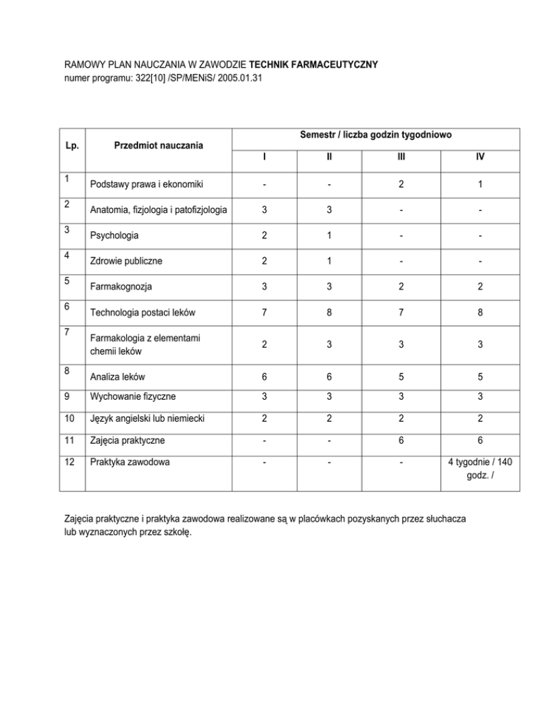 RAMOWY PLAN NAUCZANIA W ZAWODZIE TECHNIK FARMACEUTYCZNY numer programu: 322[10] /SP/MENiS/ 2005.01.31 Lp. Przedmiot nauczania Semestr / liczba godzin tygodniowo I II III IV Podstawy prawa i ekonomiki - - 2 1 Anatomia, fizjologia i patofizjologia 3 3 - - Psychologia 2 1 - - Zdrowie publiczne 2 1 - - Farmakognozja 3 3 2 2 Technologia postaci leków 7 8 7 8 Farmakologia z elementami chemii leków 2 3 3 3 Analiza leków 6 6 5 5 9 Wychowanie fizyczne 3 3 3 3 10 Język angielski lub niemiecki 2 2 2 2 11 Zajęcia praktyczne - - 6 6 12 Praktyka zawodowa - - - 4 tygodnie / 140 godz. / 1 2 3 4 5 6 7 8 Zajęcia praktyczne i praktyka zawodowa realizowane są w placówkach pozyskanych przez słuchacza lub wyznaczonych przez szkołę.