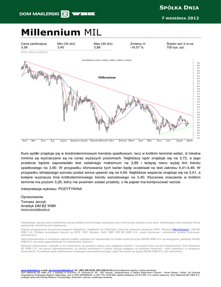 SPÓŁKA DNIA o 7 WRZEŚNIA 2012 Millennium MIL Cena zamknięcia 3,58 Min (30 dni) 3,45 Max (30 dni) 3,88 Zmiana r/r -19,57 % Średni wol 3 m-ce 700 tys. szt. Ceny akcji w złotych MILLENNIUM (3.57000, 3.58000, 3.54000, 3.58000, +0.03000) 5.9 5.8 5.7 5.6 5.5 5.4 Millennium 5.3 5.2 5.1 5.0 4.9 4.8 4.7 4.6 4.5 4.4 4.3 4.2 4.1 4.0 3.9 3.8 3.7 3.6 3.5 3.4 3.3 3.2 3.1 3.0 April May June July August September October November December 2012 February March April May June July August September Kurs spółki znajduje się w średnioterminowym trendzie spadkowym, lecz w krótkim terminie widać, iŜ lokalne minima są wyznaczane są na coraz wyŜszych poziomach. NajbliŜszy opór znajduje się na 3,72, a jego przebicie będzie zapowiadało test ostatniego maksimum na 3,88 i leŜącej nieco wyŜej linii trendu spadkowego na 3,90. W przypadku sforsowania tych barier będę oczekiwał na test zakresu 4,41-4,46. W przypadku silniejszego wzrostu podaŜ winna ujawnić się na 4,65. NajbliŜsze wsparcie znajduje się na 3,51, a kolejne wyznacza linia krótkoterminowego trendu wzrostowego na 3,40. Kluczowe znaczenie w krótkim terminie ma poziom 3,26, który nie powinien zostać przebity, o ile papier ma kontynuować wzrost. Interpretacja wykresu: POZYTYWNA Opracowanie: Tomasz Jerzyk Analityk DM BZ WBK [email protected] Interpretacja wykresu jest subiektywną oceną analityka technicznego dotyczącą oceny technicznej wykresu kursu akcji. Interpretacja moŜe przybrać formę pozytywnej, neutralnej oraz negatywnej. Wykres przygotowano za pomocą programu Metastock, AmiBroker lub Fibotrader. Dane do wykresów dostarcza GPW, Stooq.pl (http://stooq.pl) i DM BZ WBK S.A. Źródłem pozostałych danych są GPW, PAP, Reuters, GUS, NBP, DM BZ WBK S.A., prasa finansowa i internetowe serwisy finansowoekonomiczne. Dane prezentowane w niniejszym raporcie zostały uzyskane lub zaczerpnięte ze źródeł uznanych przez DM BZ WBK S.A. za wiarygodne, jednakŜe DM BZ WBK S.A. nie moŜe zagwarantować ich dokładności i pełności. Niniejsze opracowanie i zawarte w nim komentarze są wyrazem wiedzy oraz poglądów autorów i nie powinny być inaczej interpretowane. Dom Maklerski BZ WBK S.A. nie ponosi odpowiedzialności za szkody poniesione w wyniku decyzji podjętych na postawie informacji i opinii zawartych w niniejszym opracowaniu. Powielanie bądź publikowanie niniejszego opracowania lub jego części bez pisemnej zgody DM BZ WBK S.A. jest zabronione. www.dmbzwbk.pl, e-mail: [email protected], tel.: (061) 856 48 80, (061) 856 44 45 (koszt połączenia zgodny z taryfą operatora) Dom Maklerski BZ WBK S.A. z siedzibą w Poznaniu, Pl. Wolności15, 60 - 967 Poznań, zarejestrowany w Sądzie Rejonowym Poznań - Nowe Miasto i Wilda, VIII Wydział Gospodarczy Krajowego Rejestru Sądowego, pod nr KRS 0000006408, nr NIP 778-13-59-968, kapitał zakładowy 44 973 500 zł w całości wpłacony. Dom Maklerski BZ WBK S.A. podlega nadzorowi Komisji Nadzoru Finansowego. Dokument stanowi publikację handlową