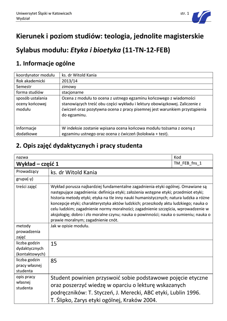 Uniwersytet Śląski w Katowicach Wydział str. 1 Kierunek i poziom studiów: teologia, jednolite magisterskie Sylabus modułu: Etyka i bioetyka (11-TN-12-FEB) 1. Informacje ogólne koordynator modułu Rok akademicki Semestr forma studiów sposób ustalania oceny końcowej modułu ks. dr Witold Kania 2013/14 zimowy stacjonarne Ocena z modułu to ocena z ustnego egzaminu końcowego z wiadomości stanowiących treść obu części wykładu i lektury obowiązkowej. Zaliczenie z ćwiczeń oraz pozytywna ocena z pracy pisemnej jest warunkiem przystąpienia do egzaminu. Informacje dodatkowe W indeksie zostanie wpisana ocena końcowa modułu tożsama z oceną z egzaminu ustnego oraz ocena z ćwiczeń (kolokwia + test). 2. Opis zajęć dydaktycznych i pracy studenta nazwa Wykład – część 1 Prowadzący ks. dr Witold Kania Kod TM_FEB_fns_1 grupa(-y) treści zajęć metody prowadzenia zajęć liczba godzin dydaktycznych (kontaktowych) liczba godzin pracy własnej studenta opis pracy własnej studenta Wykład porusza najbardziej fundamentalne zagadnienia etyki ogólnej. Omawiane są następujące zagadnienia: definicja etyki; założenia wstępne etyki; przedmiot etyki; historia metody etyki; etyka na tle inny nauki humanistycznych; natura ludzka a różne koncepcje etyki; charakterystyka aktów ludzkich; przeszkody aktu ludzkiego; nauka o celu ludzkim; zagadnienie normy moralności; zagadnienie szczęścia, wprowadzenie w aksjologię; dobro i zło moralne czynu; nauka o powinności; nauka o sumieniu; nauka o prawie moralnym; zagadnienie cnót. Jak w opisie modułu. 15 85 Student powinien przyswoić sobie podstawowe pojęcie etyczne oraz poszerzyć wiedzę w oparciu o lekturę wskazanych podręczników: T. Styczeń, J. Merecki, ABC etyki, Lublin 1996. T. Ślipko, Zarys etyki ogólnej, Kraków 2004. Uniwersytet Śląski w Katowicach Wydział organizacja zajęć literatura obowiązkowa literatura uzupełniająca adres strony www zajęć informacje dodatkowe str. 2 Wszyscy studenci A. MacIntyre, Krótka historia etyki, Warszawa 1995. T. Ślipko, Zarys etyki ogólnej, Kraków 2004. A. Anzerbacher, Wprowadzenie do etyki, Kraków 2008. A. MacIntyre, Krótka historia etyki, Warszawa 1995. F. Ricken, Etyka ogólna, Kęty 2001. R. Spaemann, Podstawowe pojęcia moralne, Lublin 2000. nazwa Wykład – część 2 Prowadzący ks. dr Witold Kania Kod TM_FEB_fns_2 grupa(-y) treści zajęć metody prowadzenia zajęć liczba godzin dydaktycznych (kontaktowych) liczba godzin pracy własnej studenta opis pracy własnej studenta Wykład porusza podstawowe zagadnienia bioetyki. Omawiane są następujące zagadnienia: definicja bioetyki; historia i rozwój etyki medycznej i bioetyki; modele uzasadnień bioetycznych; metodologia badań bioetycznych; międzynarodowe i polskie akty prawne regulujące kwestie bioetyczne; dokumenty Kościoła Katolickiego w sprawach bioetycznych; bioetyka związana z początkiem ludzkiego życia; techniki sztucznego zapłodnienia pozaustrojowego; metody wspomagania rodzicielstwa; diagnostyka prenatalna; aborcja; sterylizacja; zaburzenia różnicowania płci; eugenika; eutanazja; dzieciobójstwo; spór o status embrionu ludzkiego; komórki macierzyste; granice eksperymentu medycznego; intensywna terapia; terapia uporczywa; opieka terminalna; przeszczepy; zagadnienie kryterium śmierci. Jak w opisie modułu. 15 110 Praca własna polega: - na przyswojeniu sobie omawianych zagadnień przez lekturę wskazanej na wykładach literatury, korespondującej z omawianym tematem. - przygotowanie do testu wyboru sprawdzającego orientację w tematyce; - przygotowaniu do egzaminu. Uniwersytet Śląski w Katowicach Wydział organizacja zajęć literatura obowiązkowa literatura uzupełniająca adres strony www zajęć informacje dodatkowe Jan Paweł II, Encyklika Evangelium Vitae, Vatican 1995; Kongregacja Nauki Wiary, Instrukcja Dignitas personae, Vatican 2008, Papieska Rada ds. Duszpasterstwa Służby Zdrowia, Karta Pracowników Służby Zdrowia, Vatican 1995. Antologia bioetyki, t. 1., Wokół śmierci i umierania, W. Galewicz (red.), Kraków 2009. Antologia bioetyki, t. 2., Początki ludzkiego życia, W. Galewicz (red.), Kraków 2010. Antologia bioetyki, t. 3., Badania z udziałem ludzi, W. Galewicz (red.), Kraków 2011. R. Lucas Lucas, Bioetyka dla każdego, Częstochowa 2005. A. Muszala, A. Rudziewicz, Bioetyka w szkole. Dla nauczycieli, wychowawców i katechetów, Kraków 2007. Systemy Bioetyki, T. Biesaga (red.), Karaków 2003. T. Ślipko, Bioetyka. Najważniejsze problemy, Kraków 2009. Świadoma zgoda, A. Carmi (red.), MedPharm Polska, Wrocław 2007. nazwa Kod TM_FEB_fns_3 Ćwiczenia Prowadzący grupa(-y) treści zajęć metody prowadzenia zajęć liczba godzin dydaktycznych (kontaktowych) str. 3 ks. dr Witold Kania Treścią zajęć jest czytanie i wspólne krytyczne omawianie wybranych klasycznych tekstów źródłowych etyki i bioetyki oraz ich opracowań. Jak w opisie modułu 15 Uniwersytet Śląski w Katowicach Wydział liczba godzin pracy własnej studenta opis pracy własnej studenta organizacja zajęć literatura obowiązkowa literatura uzupełniająca adres strony www zajęć Informacje dodatkowe 85 Praca własna polega na wcześniejszym zapoznaniu się z tekstami stanowiącymi przedmiot ćwiczeń oraz na przyswojeniu sobie, pomocy wskazanych lektur, głównych idei filozoficznymi ich autorów. Wskazane przez prowadzącego teksty źródłowe. T. Styczeń, J. Merecki, ABC etyki, Lublin 1996. Fragmenty opracowań wskazane lub udostępnione przez prowadzącego ćwiczenia. Jak w opisie wykładu, cz. 1 i 2. nazwa Kod TM_FEB_fns_4 Konsultacje Prowadzący grupa(-y) treści zajęć metody prowadzenia zajęć liczba godzin dydaktycznych (kontaktowych) liczba godzin pracy własnej studenta opis pracy własnej studenta organizacja zajęć literatura obowiązkowa str. 4 ks. dr Witold Kania Pomoc ze strony wykładowcy w zrozumieniu poszczególnych zagadnień omawianych na zajęciach oraz doradztwo