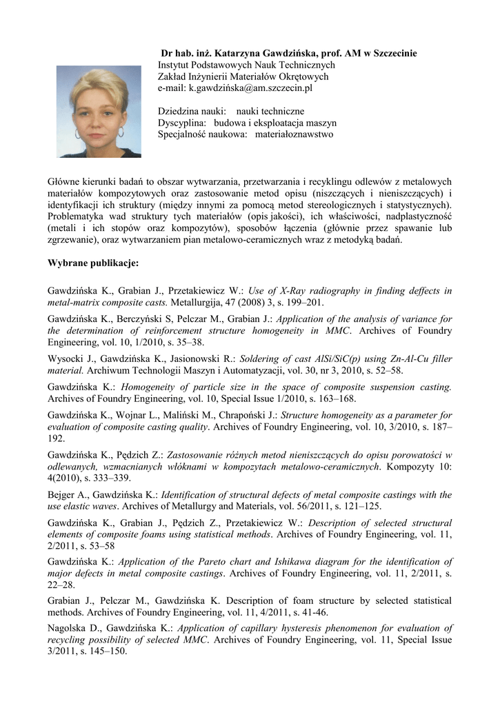 Dr hab. inż. Katarzyna Gawdzińska, prof. AM w Szczecinie Instytut Podstawowych Nauk Technicznych Zakład Inżynierii Materiałów Okrętowych e-mail: k.gawdziń[email protected] Dziedzina nauki: nauki techniczne Dyscyplina: budowa i eksploatacja maszyn Specjalność naukowa: materiałoznawstwo Główne kierunki badań to obszar wytwarzania, przetwarzania i recyklingu odlewów z metalowych materiałów kompozytowych oraz zastosowanie metod opisu (niszczących i nieniszczących) i identyfikacji ich struktury (między innymi za pomocą metod stereologicznych i statystycznych). Problematyka wad struktury tych materiałów (opis jakości), ich właściwości, nadplastyczność (metali i ich stopów oraz kompozytów), sposobów łączenia (głównie przez spawanie lub zgrzewanie), oraz wytwarzaniem pian metalowo-ceramicznych wraz z metodyką badań. Wybrane publikacje: Gawdzińska K., Grabian J., Przetakiewicz W.: Use of X-Ray radiography in finding deffects in metal-matrix composite casts. Metallurgija, 47 (2008) 3, s. 199–201. Gawdzińska K., Berczyński S, Pelczar M., Grabian J.: Application of the analysis of variance for the determination of reinforcement structure homogeneity in MMC. Archives of Foundry Engineering, vol. 10, 1/2010, s. 35–38. Wysocki J., Gawdzińska K., Jasionowski R.: Soldering of cast AlSi/SiC(p) using Zn-Al-Cu filler material. Archiwum Technologii Maszyn i Automatyzacji, vol. 30, nr 3, 2010, s. 52–58. Gawdzińska K.: Homogeneity of particle size in the space of composite suspension casting. Archives of Foundry Engineering, vol. 10, Special Issue 1/2010, s. 163–168. Gawdzińska K., Wojnar L., Maliński M., Chrapoński J.: Structure homogeneity as a parameter for evaluation of composite casting quality. Archives of Foundry Engineering, vol. 10, 3/2010, s. 187– 192. Gawdzińska K., Pędzich Z.: Zastosowanie różnych metod nieniszczących do opisu porowatości w odlewanych, wzmacnianych włóknami w kompozytach metalowo-ceramicznych. Kompozyty 10: 4(2010), s. 333–339. Bejger A., Gawdzińska K.: Identification of structural defects of metal composite castings with the use elastic waves. Archives of Metallurgy and Materials, vol. 56/2011, s. 121–125. Gawdzińska K., Grabian J., Pędzich Z., Przetakiewicz W.: Description of selected structural elements of composite foams using statistical methods. Archives of Foundry Engineering, vol. 11, 2/2011, s. 53–58 Gawdzińska K.: Application of the Pareto chart and Ishikawa diagram for the identification of major defects in metal composite castings. Archives of Foundry Engineering, vol. 11, 2/2011, s. 22–28. Grabian J., Pelczar M., Gawdzińska K. Description of foam structure by selected statistical methods. Archives of Foundry Engineering, vol. 11, 4/2011, s. 41-46. Nagolska D., Gawdzińska K.: Application of capillary hysteresis phenomenon for evaluation of recycling possibility of selected MMC. Archives of Foundry Engineering, vol. 11, Special Issue 3/2011, s. 145–150. Gawdzińska K., Nagolska D., Grabian J.: Crystallisation of Silicon on Reinforcement Fibres as a Consequence of Overheating of Matrix Metal During Saturation in MMC. Defect and Diffusion Forum, vol. 326–328 (2012), pp. 471–476. Nagolska D., Gawdzińska K.: An Attempt to Apply Darcy’s Flow Law in MMC Recycling Process Analysis. Defect and Diffusion Forum, vol. 326–328 (2012), pp. 488–493. Gawdzińska K., Nagolska D., Szweycer M.: Classification of Structure Defects of Metal Matrix Castings with Saturated Reinforcement. Archives of Foundry Engineering, vol. 12, 3/2012, s. 29– 36. Gawdzińska K., Pelczar M.: Probabilistyczna ocena prawdopodobieństwa występowania wad w odlewach kompozytowych metalowych Archives of Foundry Engineering, Special Issue, vol. 12, 2/2012, s. 17–22.